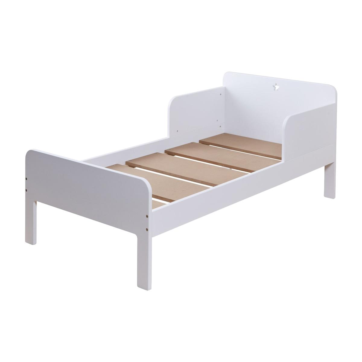 The Star Bright Toddler Bed is the ideal choice for little ones making the transition from a cot to a full-sized bed. Designed with safety and comfort in mind, this bed features a reassuringly low height and protective guard rails, ensuring your child feels safe and secure. Suitable for children aged 18 months to 4 years, it offers a cosy and snug sleeping space while promoting independence. The Bright White finish complements other pieces in the Star Bright collection, including the Bedside Table, Wardrobe, and Chest of Drawers. Give your child the perfect start to their big kid journey with the Star Bright Toddler Bed—a safe, stylish, and practical choice for any nursery. Bed frame: Toddler bed. White bed with a mdf frame. Includes wooden slats. Self-assembly - 2 people recommended. Maximum user weight 100kg. Safety tested to 100kg. Mattress: Requires 1 mattress (not included). Dimensions: Frame size L144, W74.5, H60cm. Clearance between floor and underside of bed 20cm. Package dimensions: Package 1 size H14, W68.5, D84cm. Package 2 size H11.3, W18.5, D150cm. General information: Manufacturer's 5 year guarantee.