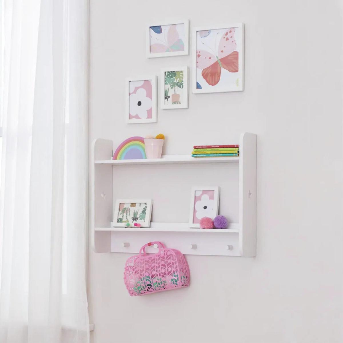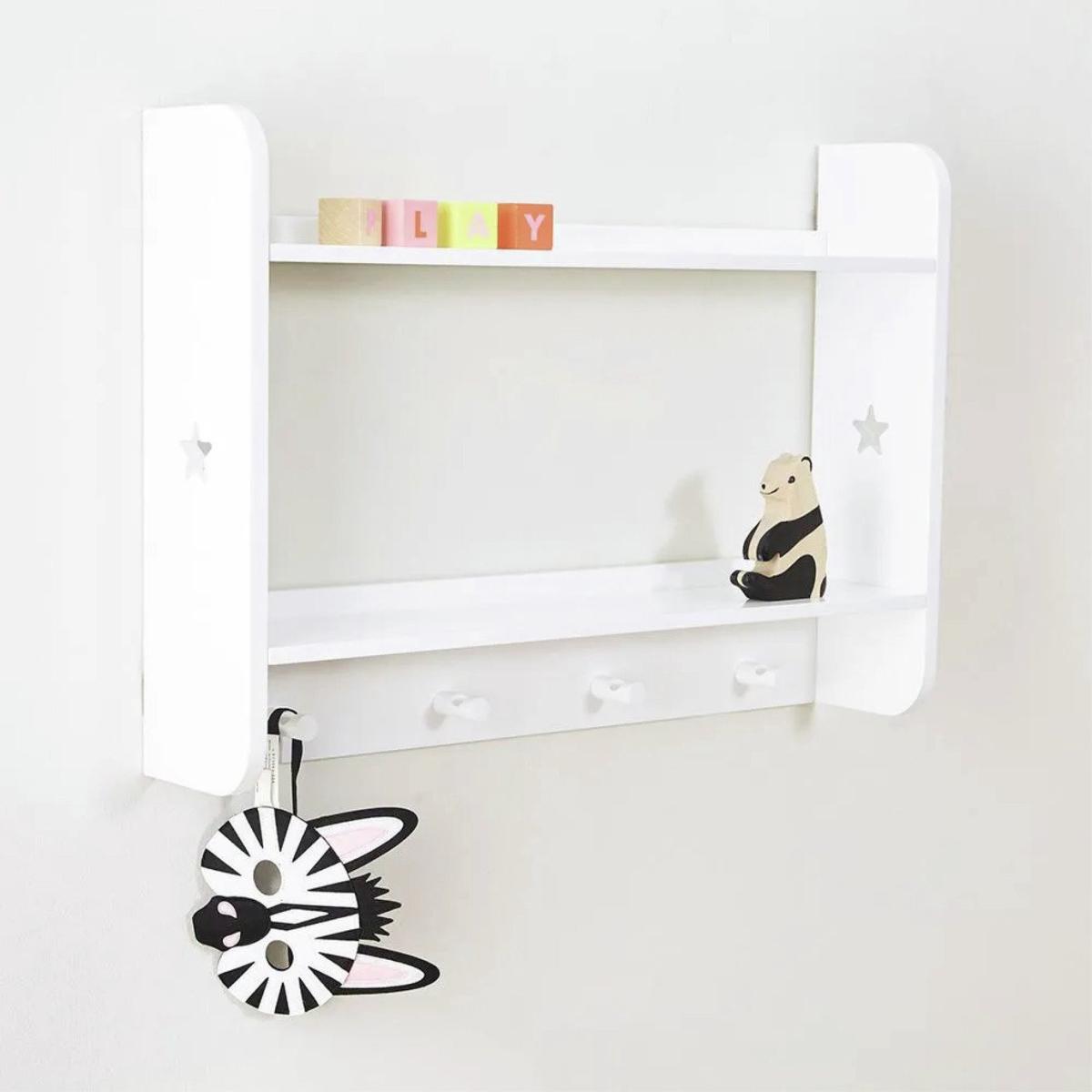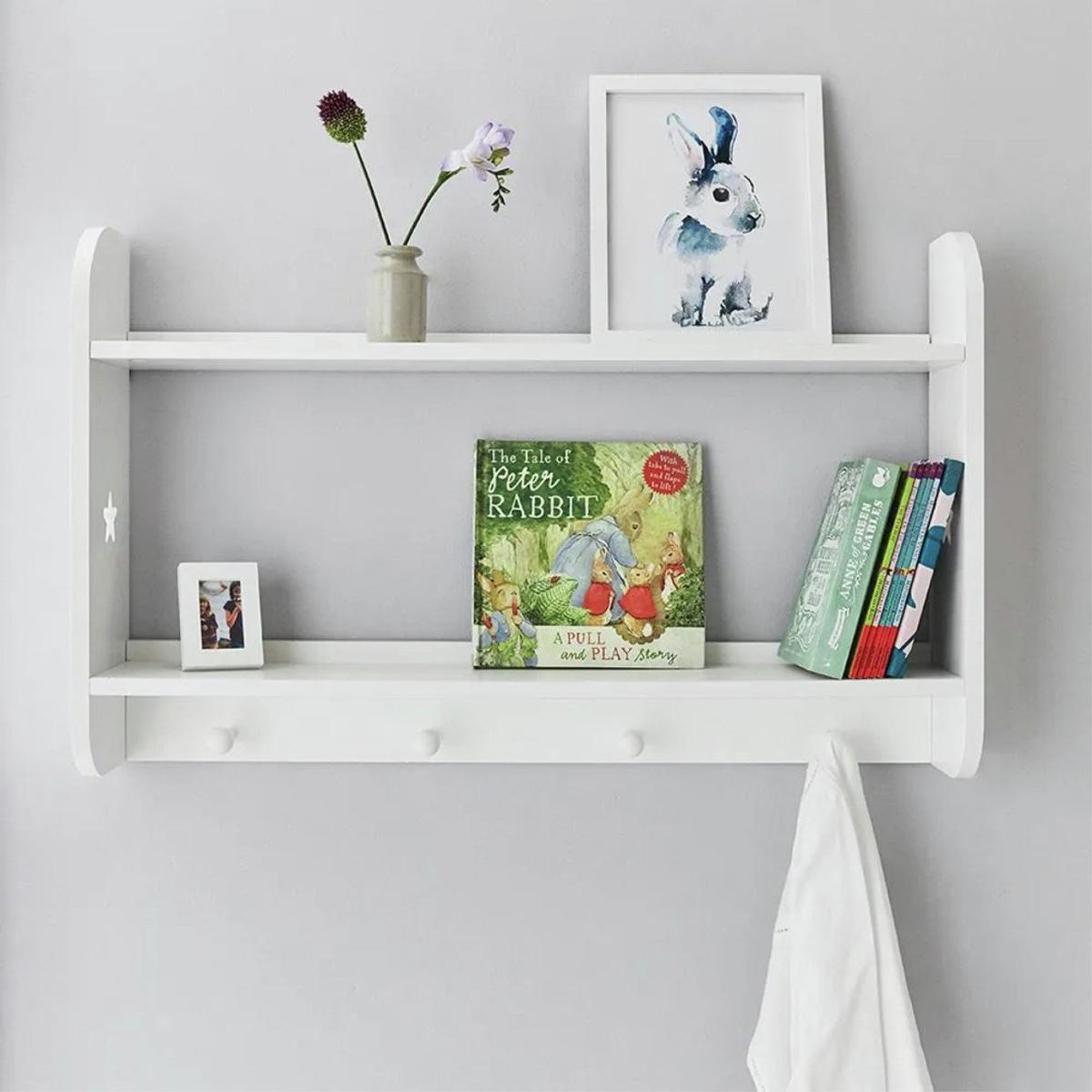 Keep everything organised and within reach with this smart set of wall shelves. Perfect for books, trophies, and teddies, this versatile shelf offers both storage and display space in one. Featuring four handy hanging hooks, it's ideal for jackets, bags, medals, or favourite lanyards, making it a practical addition to any room. Made from sturdy MDF and finished with a durable, painted Bright White finish, this shelf blends seamlessly into any decor while offering long-lasting functionality. Made from MDF with a painted finish. Size H50, W70, D14.9cm. Weight 4.8kg. Self-assembly. Package Dimensions: Package 1 dimensions: H20.5, W78.5, D12.5cm. Package 1 weight: 5.3kg. General information: Manufacturer's 1 year guarantee.