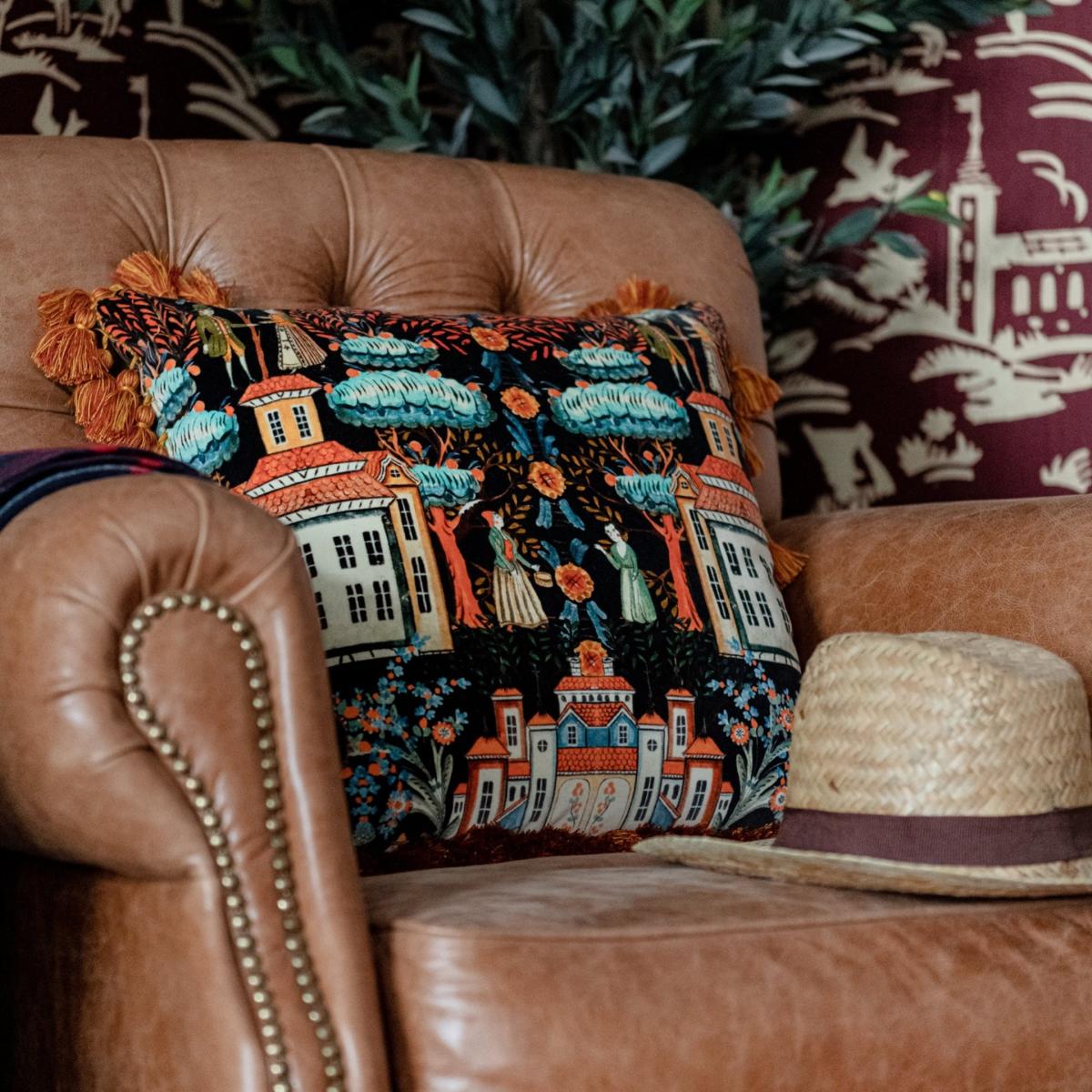 I love this cushion for bringing a rich, textural element to a space. Its deep, velvety black base paired with the striking green and blue details makes it versatile enough to work in both modern and traditional interiors. It would look fantastic on a neutral sofa or armchair, adding a pop of colour and tactile interest. For styling tips, combine it with plain, textured fabrics to let the print stand out, and consider pairing it with other accessories in complementary tones to create a curated, layered look. It's a great way to introduce pattern and personality without overwhelming the overall aesthetic.