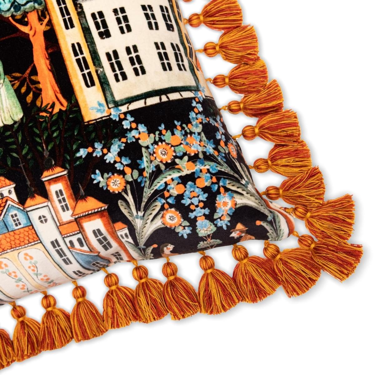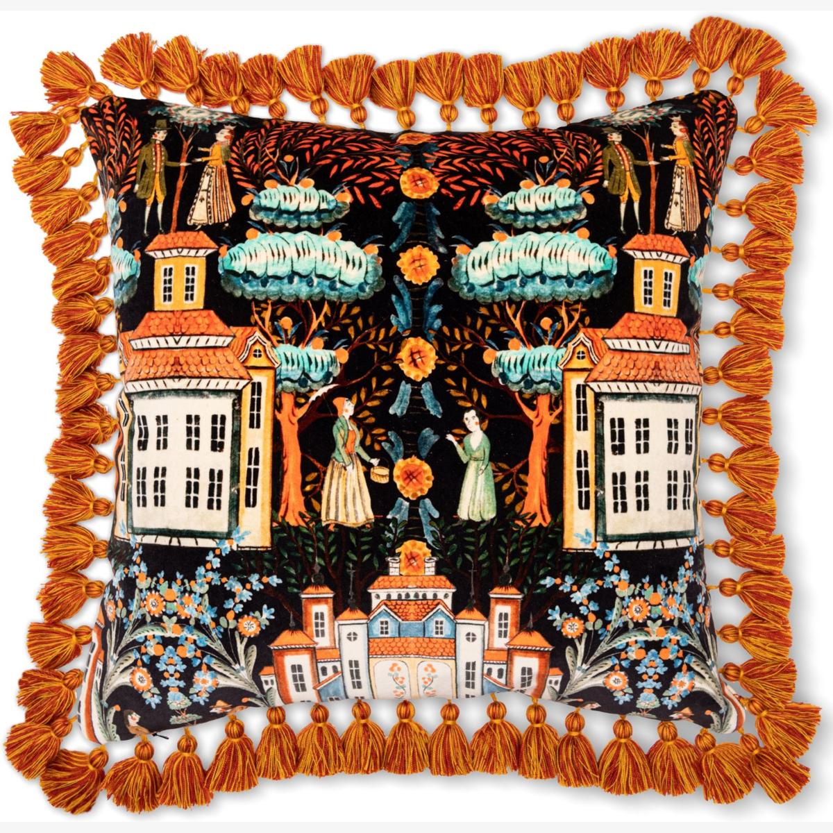 Edged in a row of lustrous, golden tassels, the TALES OF TYROL cushion is a bold design that celebrates magical Tyrolean folklore, where charming, rosycheeked characters inhabit a world of fantasy and wonder. Made of cotton velvet, this whimsy cushion adds character and boldness to any interior scheme.