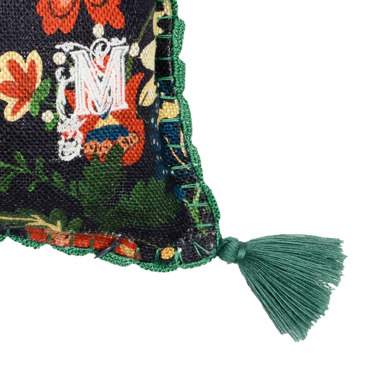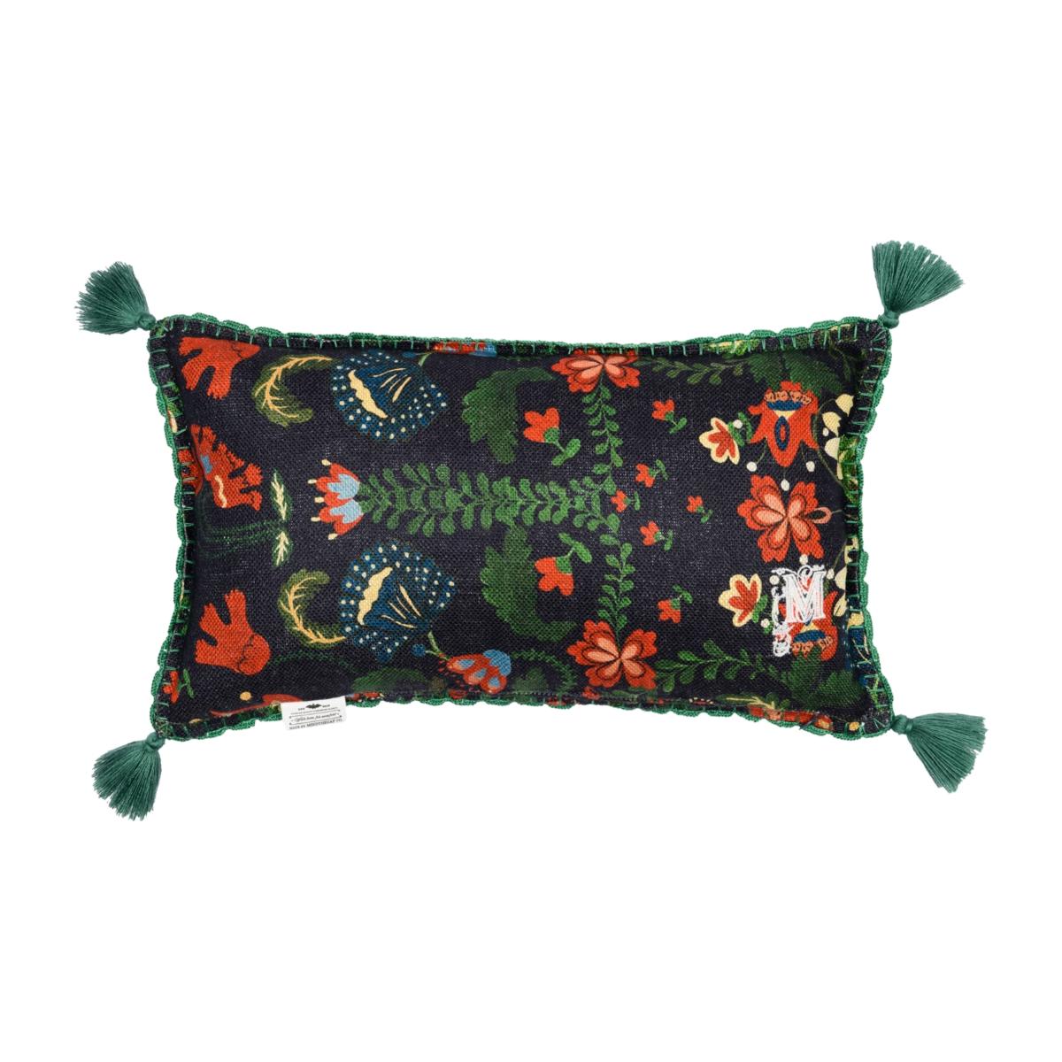 The intricate pattern featuring milfoil, bluebells and various Carpathian wildflowers make for a full and bountiful linen cushion. Decorated with a beautiful M monogram on the back, this cushion is hand-finished with green scallop crochet trimming and green cotton tassels. Coming with 100% duck feathers filling. MINDTHEGAP's distinctive cushions show beautiful patterns and details of our fabrics. Made on heavy linen or cotton pile velvet, all cushions are printed in Romania by using traditional methods. To achieve a unique vintage effect and to get more softness, our linen cushions are stonewashed finished.