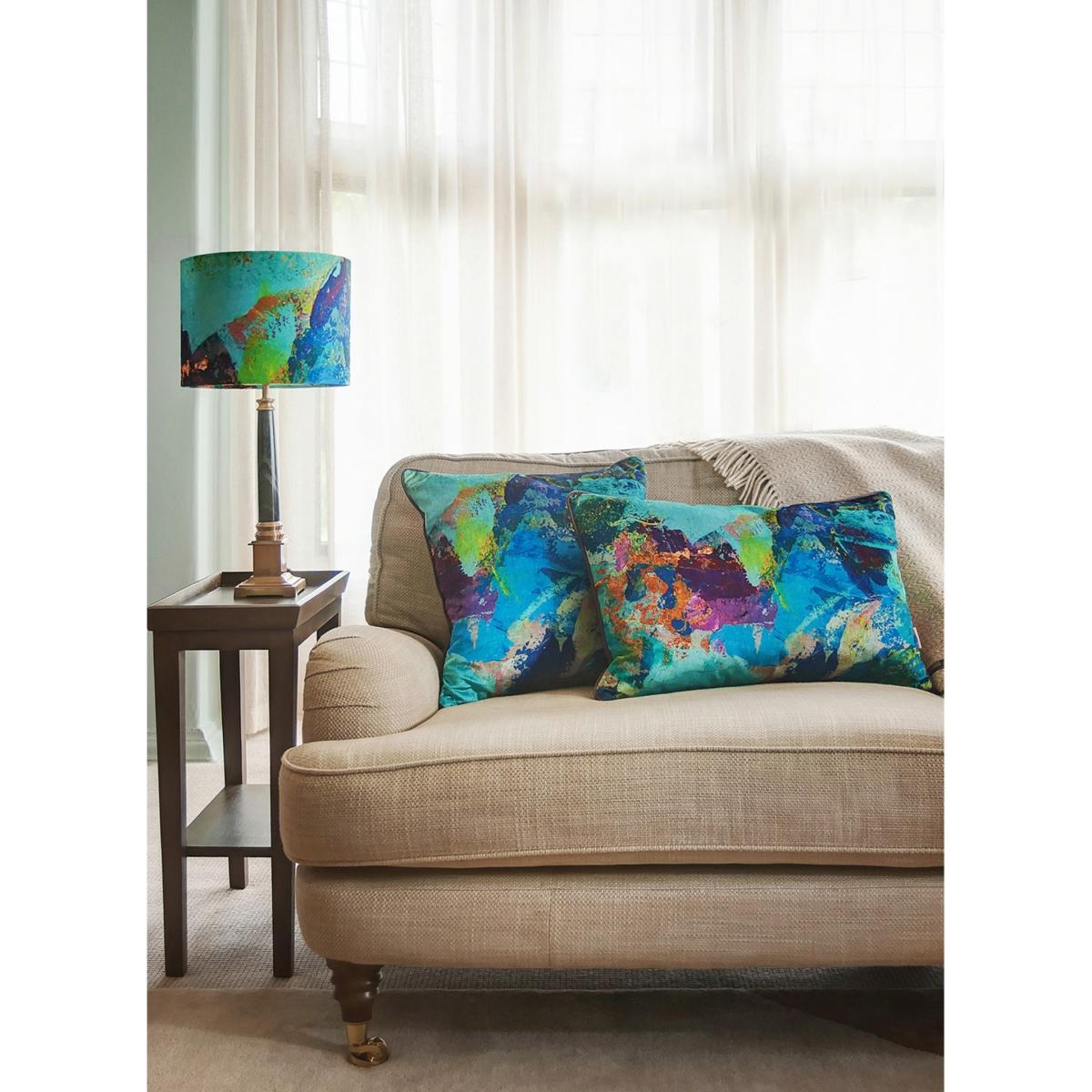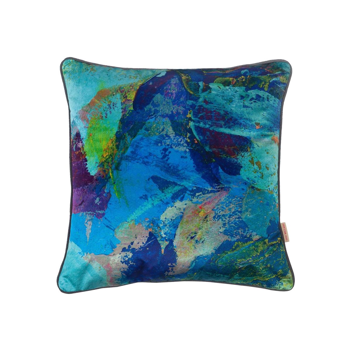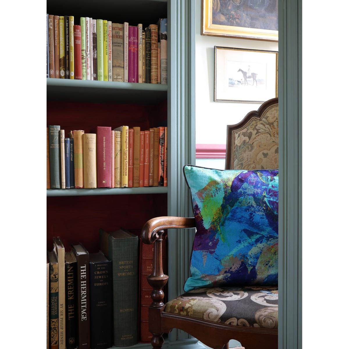 Susi's artwork is inspired by the beautiful colours and light in her landscapes of Northumberland and Tuscany and this Azure design is a microcosm of one of her colourful paintings. The idea of taking art off the walls and to incorporate these designs into the home give a 'one of a kind' edge to any interior. This cushion is piped and backed with a lovely jet coloured cotton and comes with an extra-fill duck feather pad. Striving for sustainability and keeping our carbon footprint at a minimum, our cushions are printed in the UK and made by our local artisan makers before being packed up in recycled and recyclable packaging. The inserted cushion pads are made in Norfolk and their duck feathers are ethically and sustainably sourced.