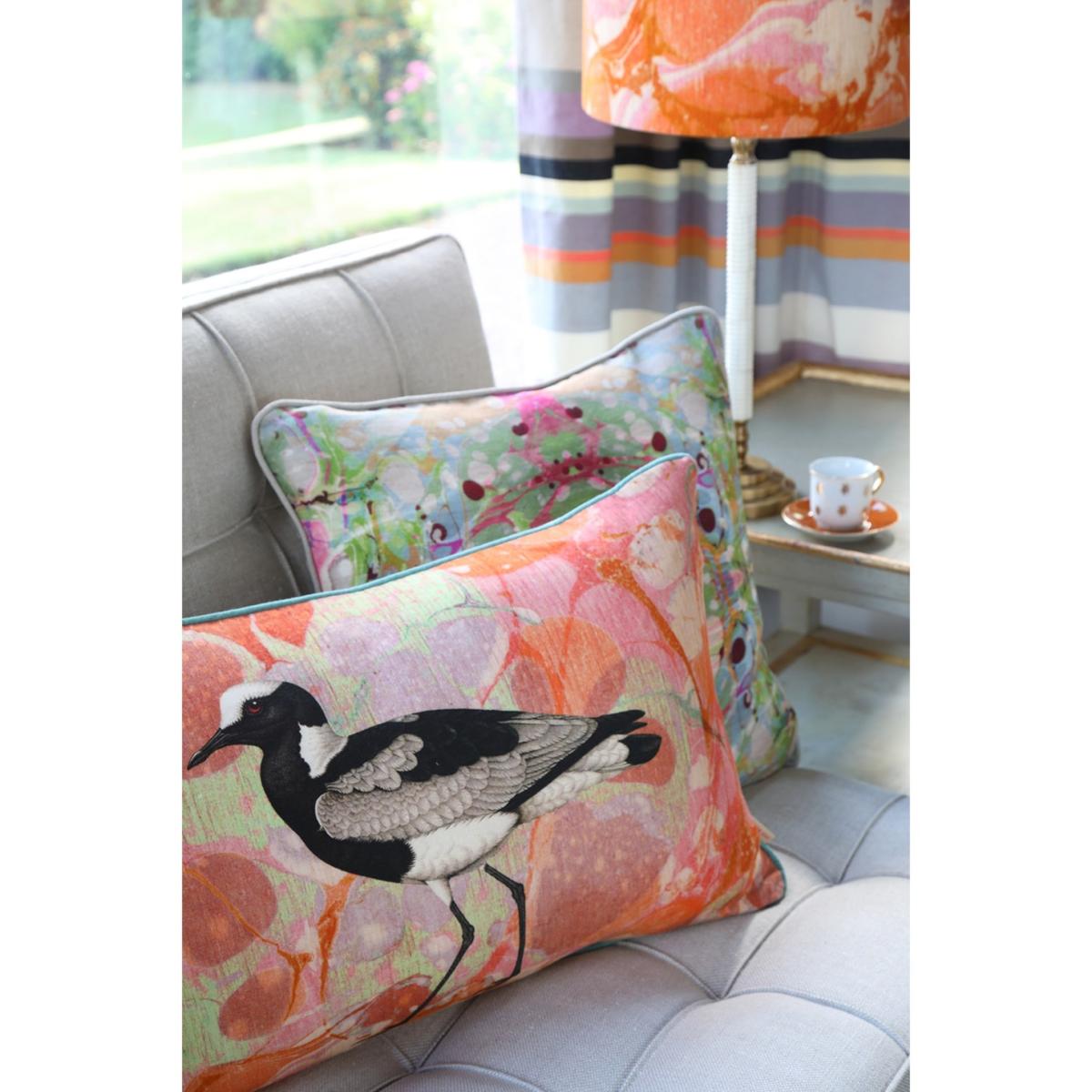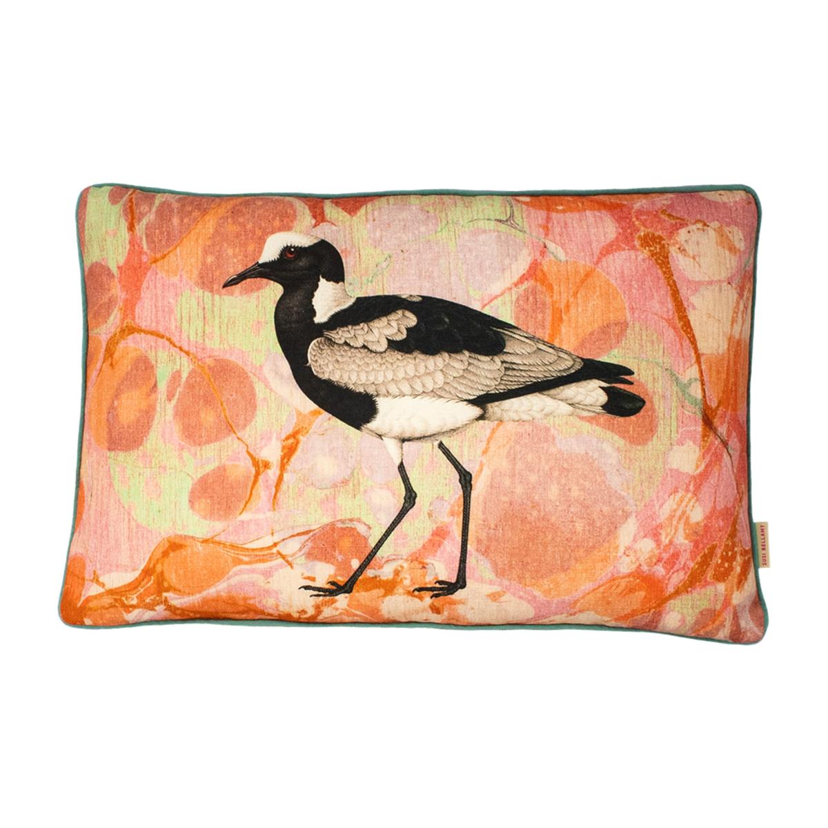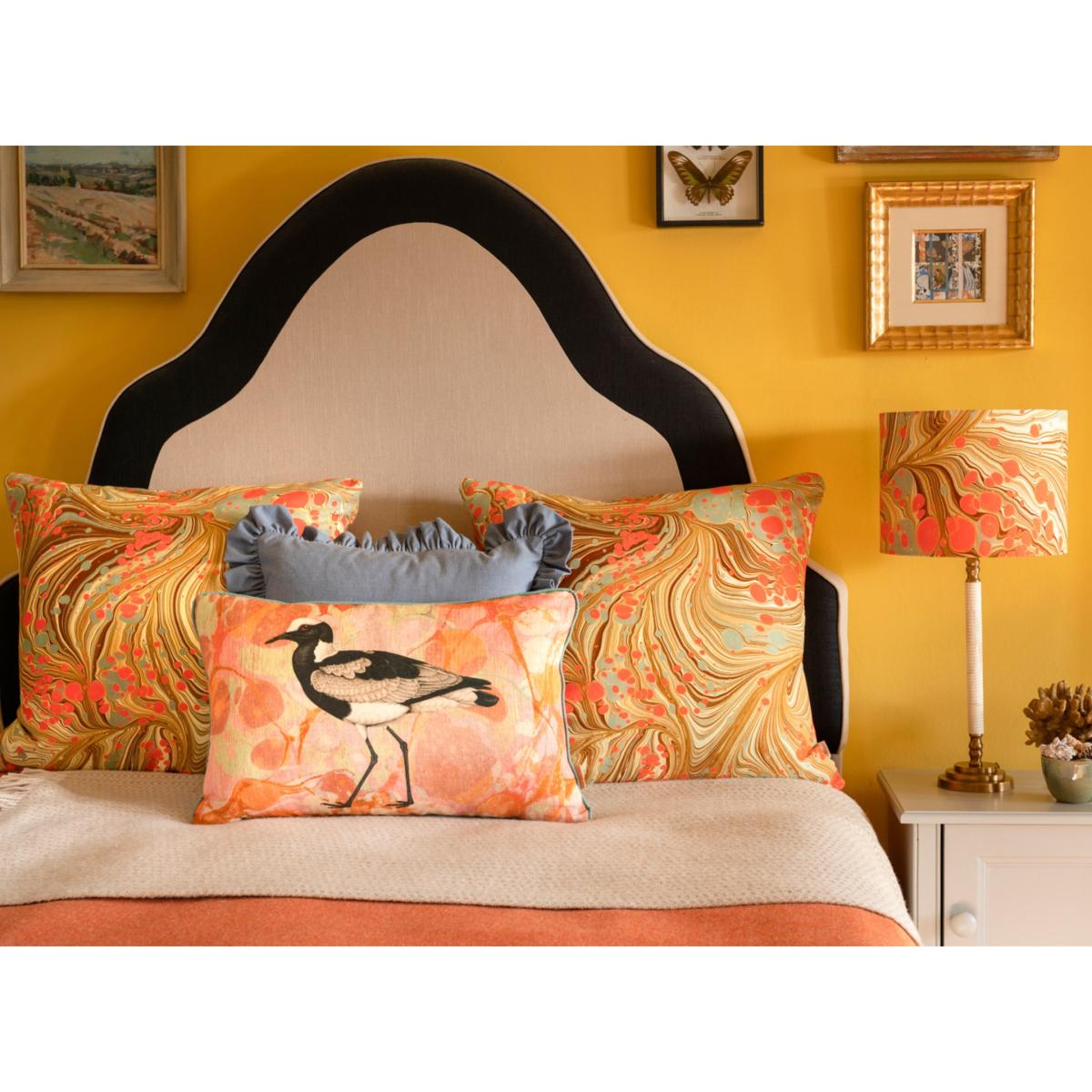 Here at Susi Bellamy, we love a collaged design and this is the first time we have printed a bird motif on linen. Opting for a background of this beautiful Coral Marbled pattern we think this handsome fella would work beautifully on a natural linen covered sofa or as a bedroom centrepiece on a plain cotton bedspread. Striving for sustainability and keeping our carbon footprint at a minimum, our cushions are printed in the UK and made by our local artisan makers before being packed up in recycled and recyclable packaging. The inserted cushion pads are made in Norfolk and their duck feathers are ethically and sustainably sourced.