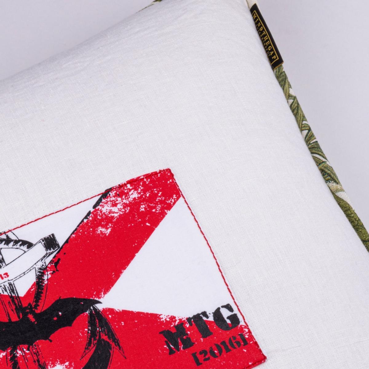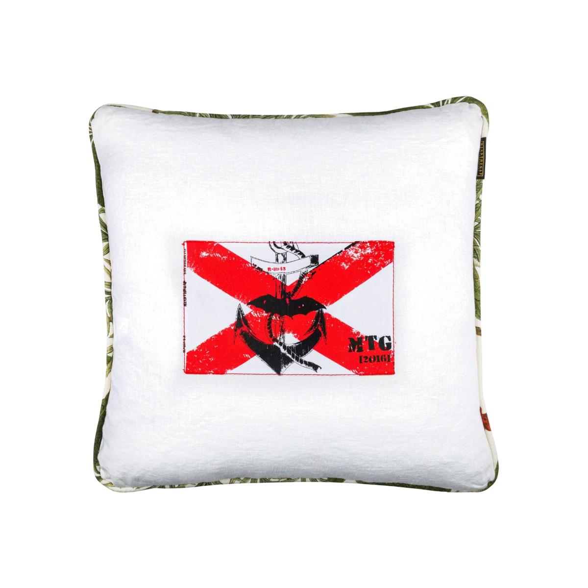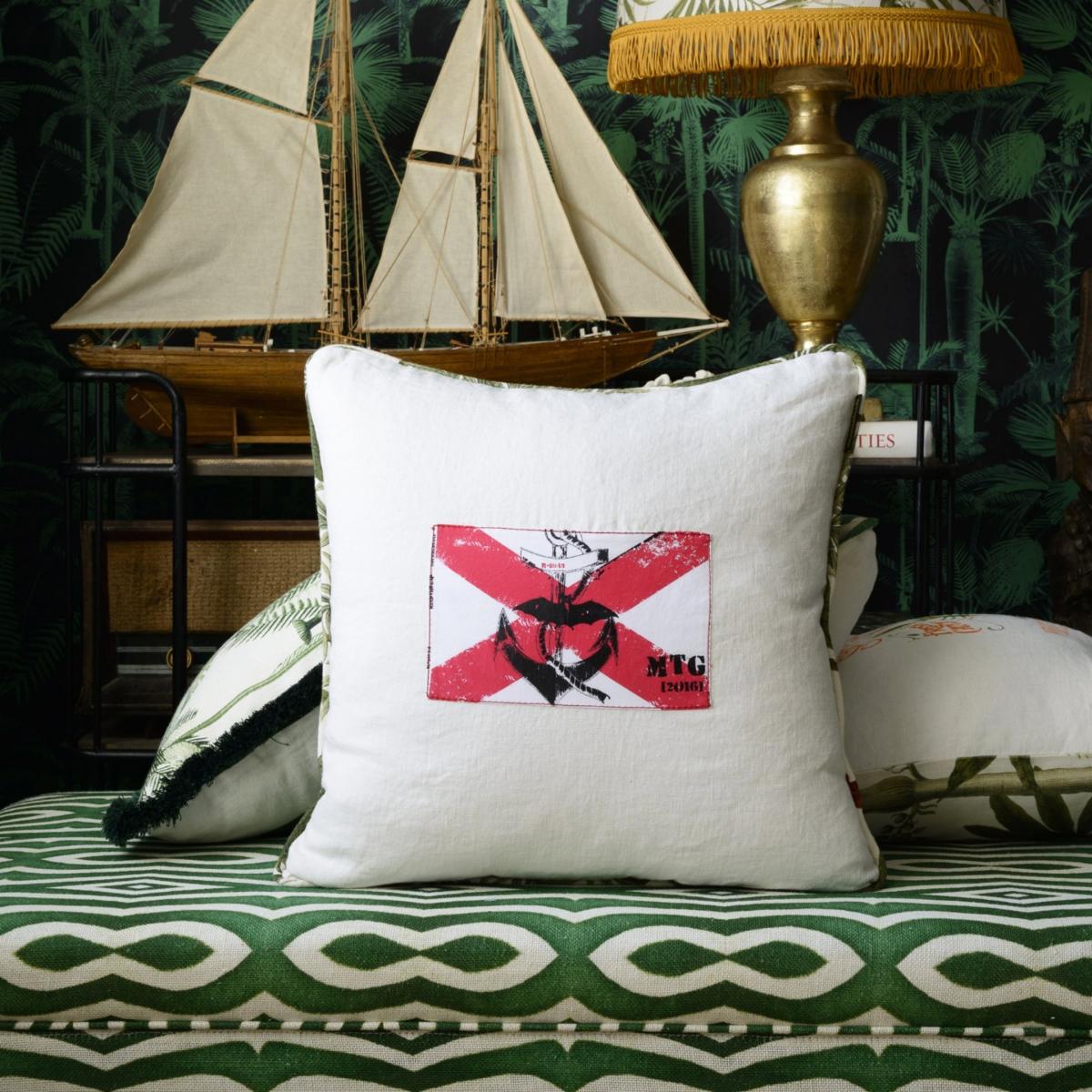 An outstanding navy inspired cushion with a vintage naval flag patch on the front side and MADAGASCAR linen fabric on the back. Finished with assorted piping, the cushion comes with 100% duck feathers filling.