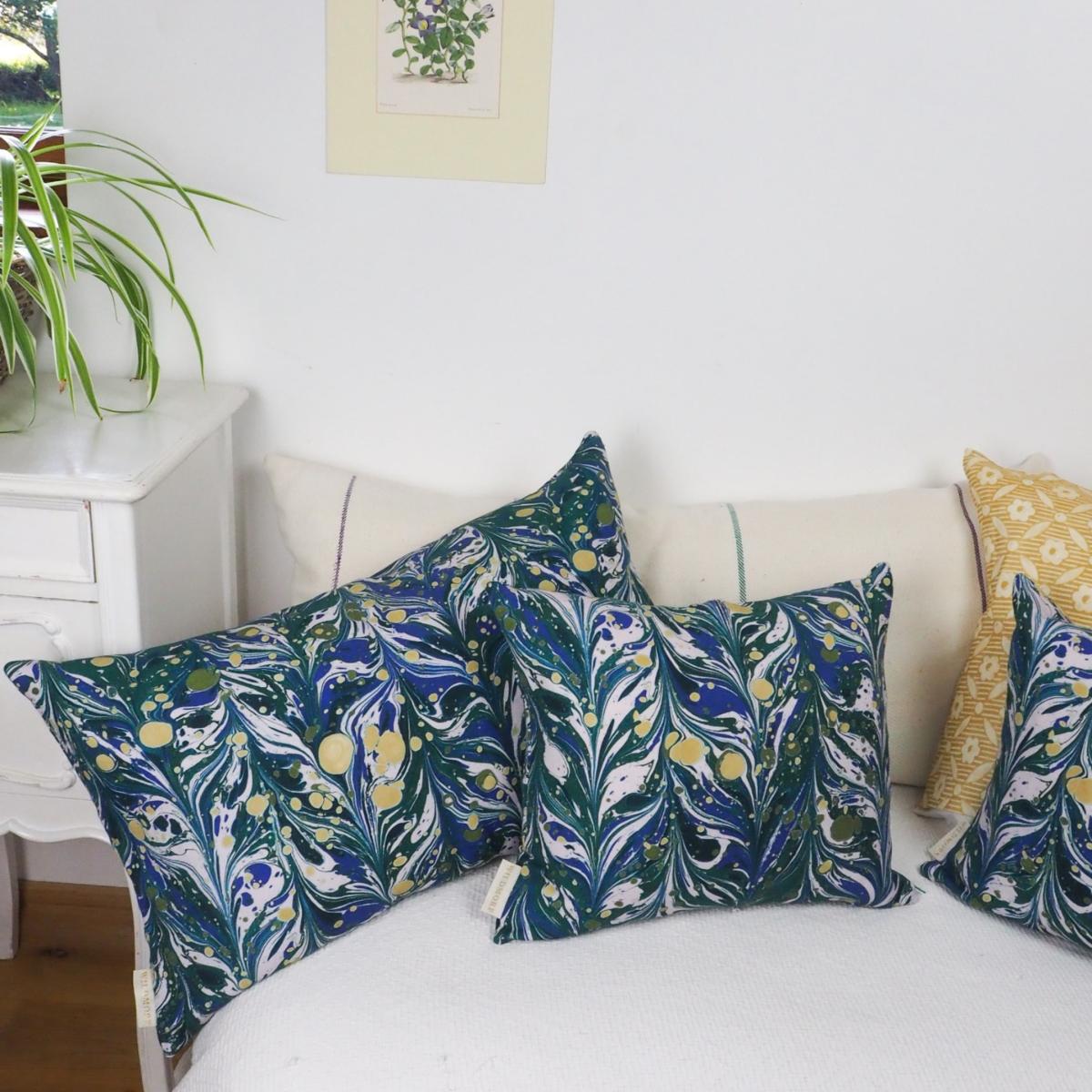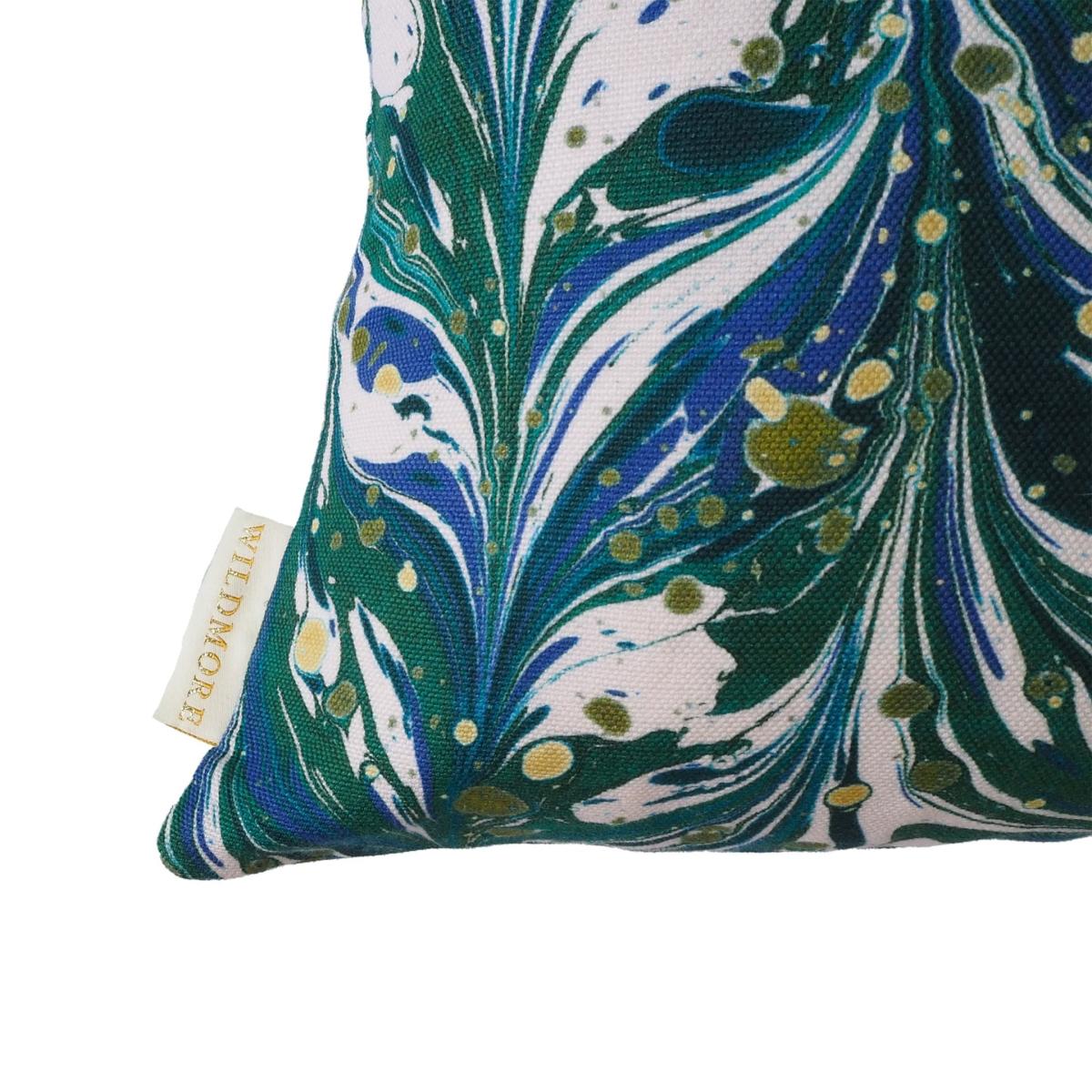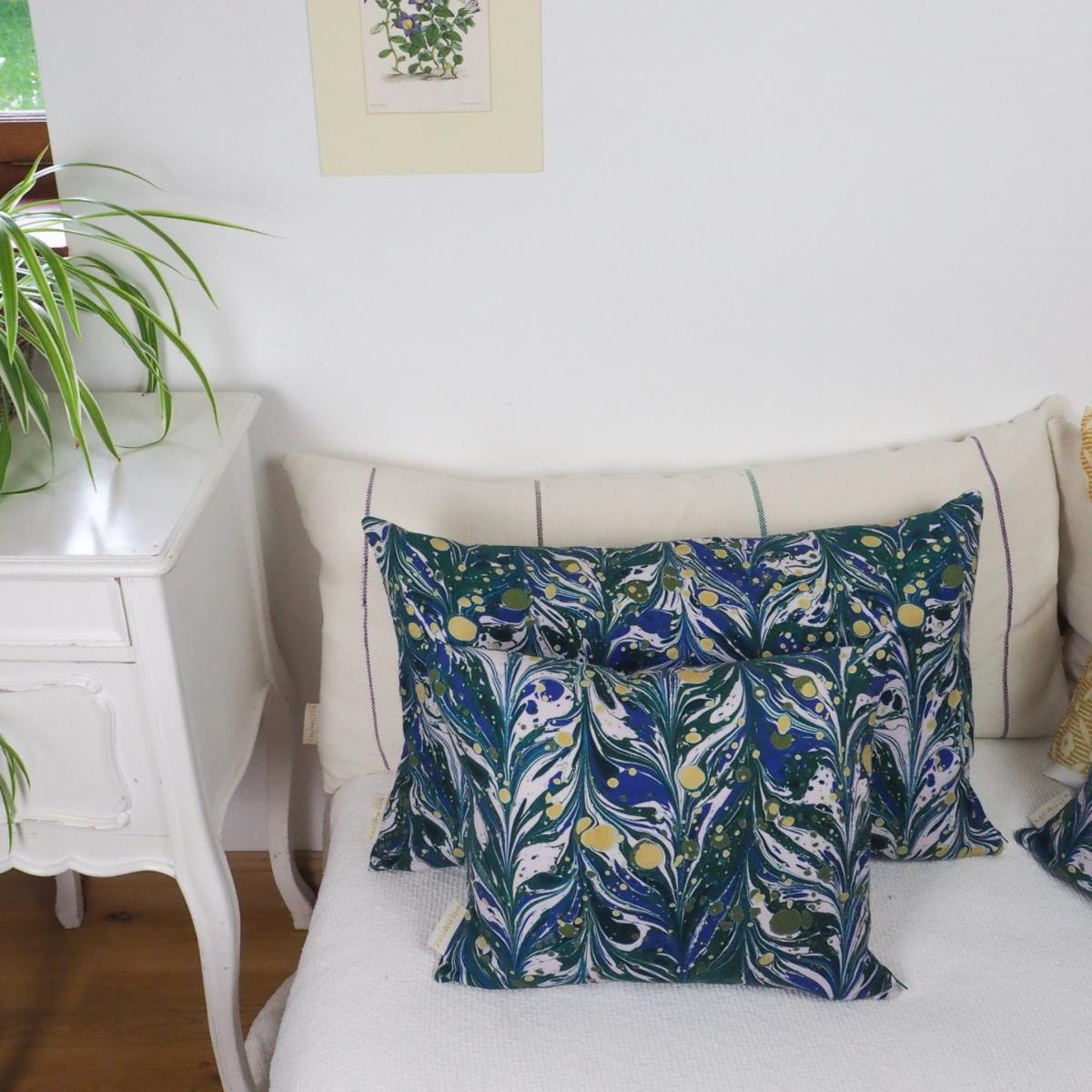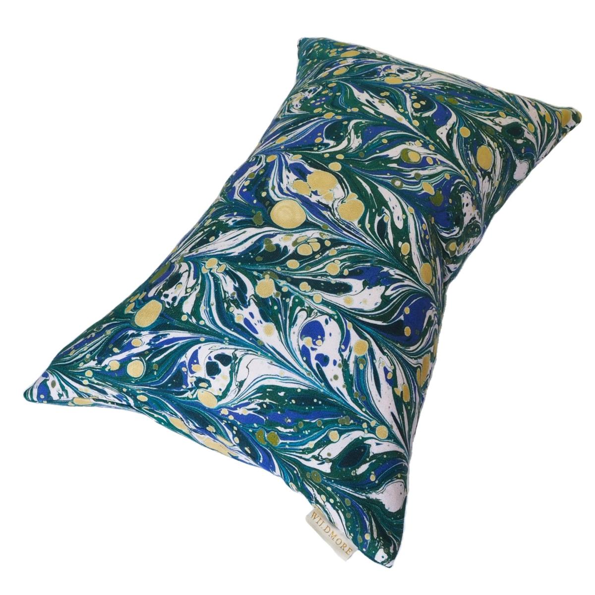 Our marbled Obliquus design as a large bolster cushion. Our rich Deep Sea blues and greens are ideal to add a statement and can be paired with the gorgeous golden yellows and blush pinks that flow through the design. This cushion can be paired with our smaller Obliquus Deep Sea Mini Bolster to add more print to your space. Matching wallpaper available. Designed and hand made in our Wildmore studio in England into a large, luxuriously plump linen cushion.