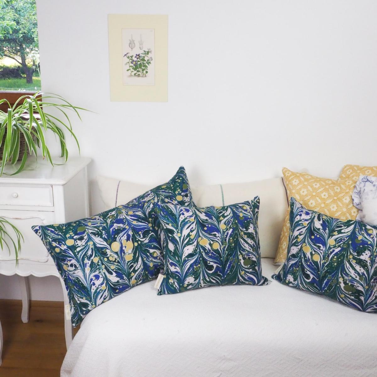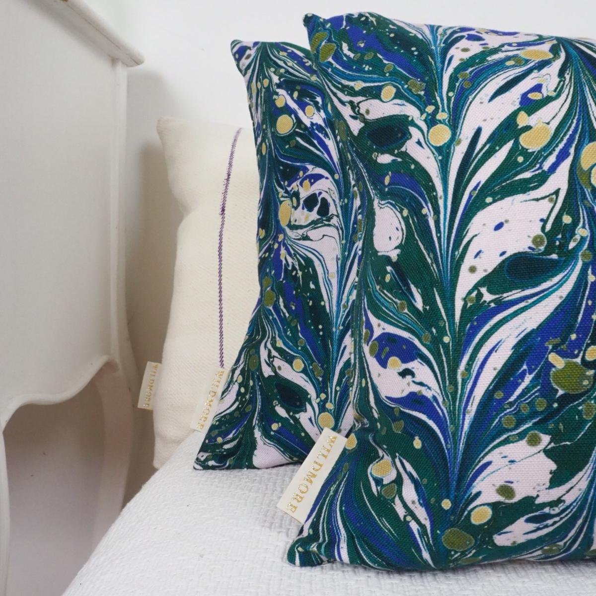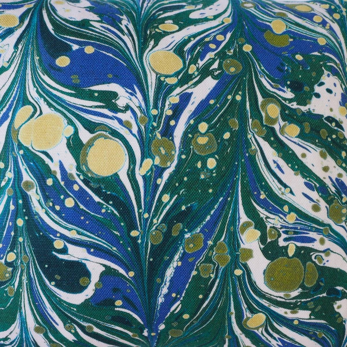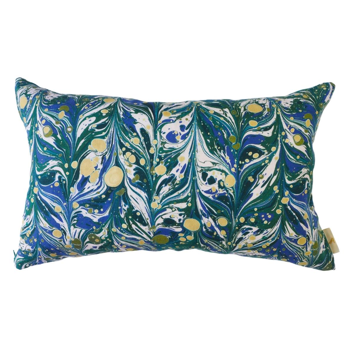 Our marbled Obliquus design as a large bolster cushion. Our rich Deep Sea blues and greens are ideal to add a statement and can be paired with the gorgeous golden yellows and blush pinks that flow through the design. This cushion can be paired with our smaller Obliquus Deep Sea Mini Bolster to add more print to your space. Matching wallpaper available. Designed and hand made in our Wildmore studio in England into a large, luxuriously plump linen cushion.