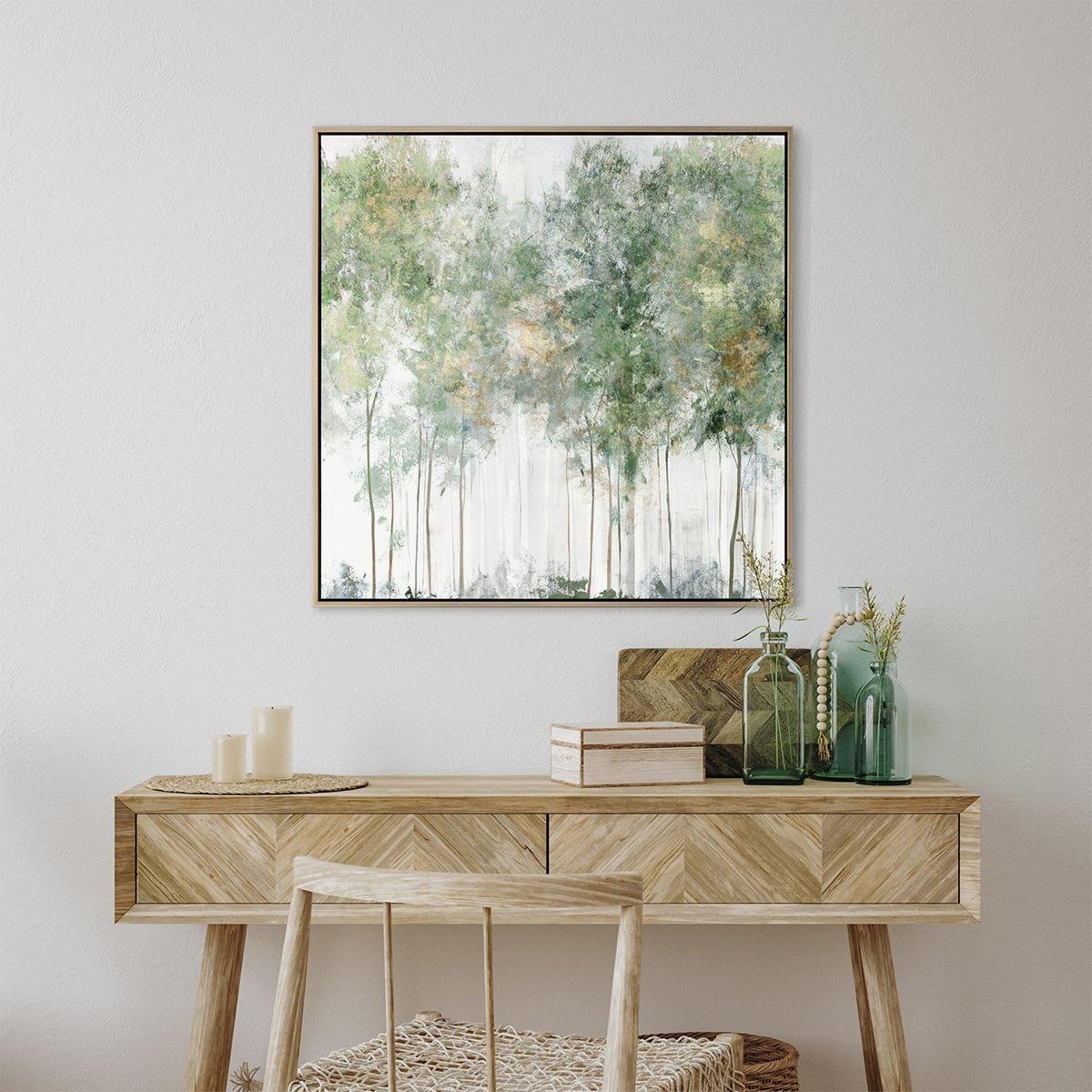 The green canopy wall art is a versatile piece that can soften and add a touch of nature-inspired calm to various interiors. I love how its subdued colour palette makes it easy to incorporate into both modern and traditional settings - from a serene bedroom to a contemporary living room. For styling, consider hanging it above a neutral sofa or bed to create a focal point that doesn’t overpower the space. Practical tips include pairing it with natural textures like wooden furniture or linen upholstery to enhance its earthy vibe. Keep the framing simple to maintain a clean lines look, or go bold with a contrasting frame if you want to add a bit of visual interest.