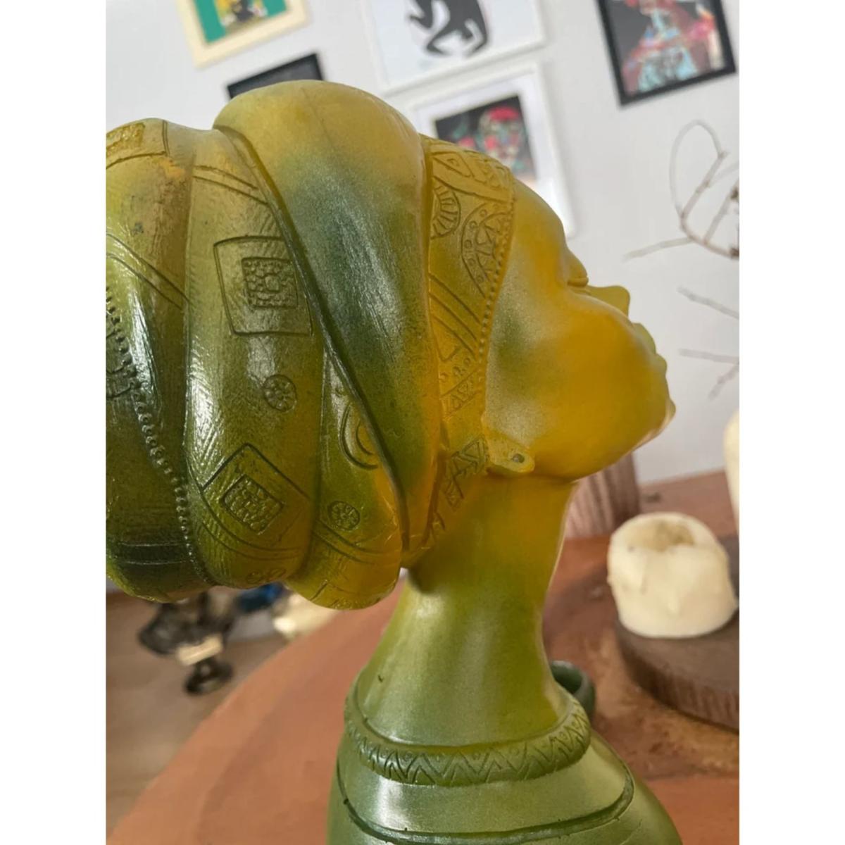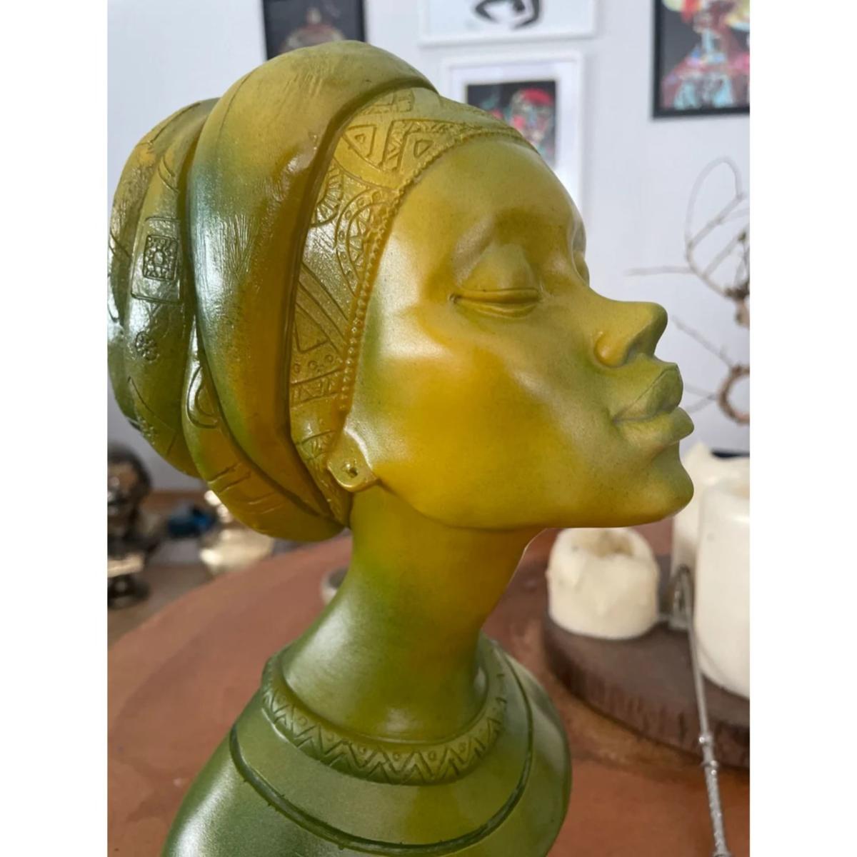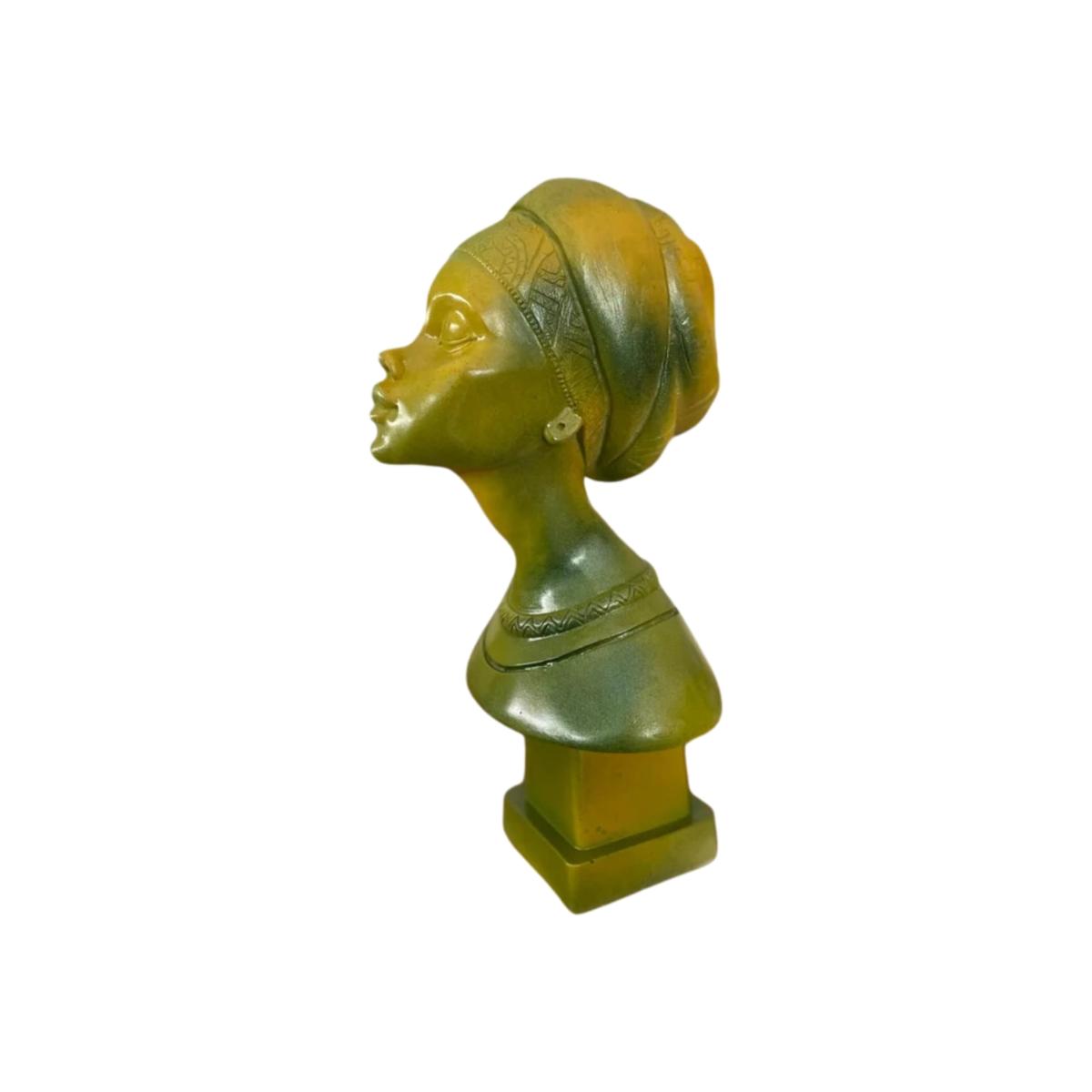 Add a touch of African beauty to your home decor with this stunning Large African Lady Sculpture Statue. Standing at 11 inches tall, this sculpture features a beautiful bust design that captures the essence of African art. The green sculpture with yellow strip accents adds a vibrant and eye-catching element to any room. This African Statue is not only a beautiful decorative piece but also a symbol of culture and heritage. Its intricate details and striking design make it a standout feature in any room. Bring a touch of African elegance to your home decor with this exquisite Large African Lady Sculpture Statue and enjoy the beauty and sophistication it brings to your space.