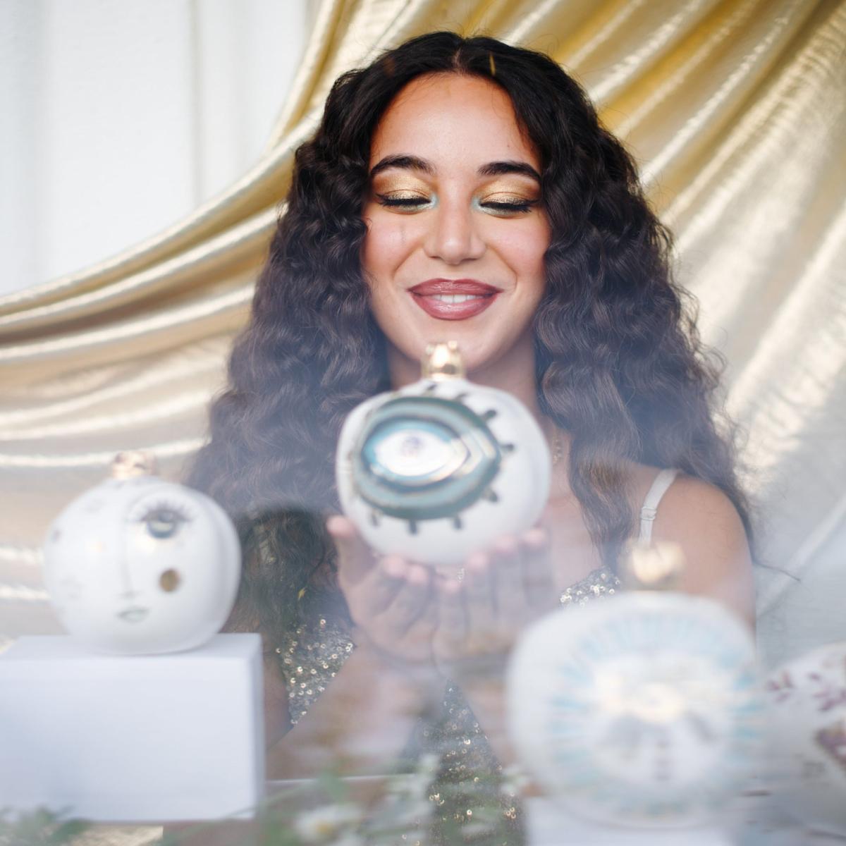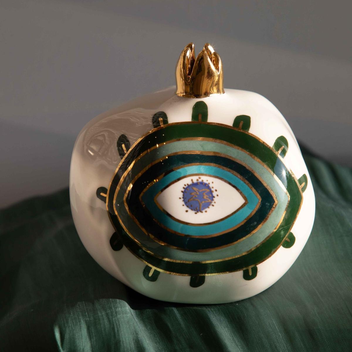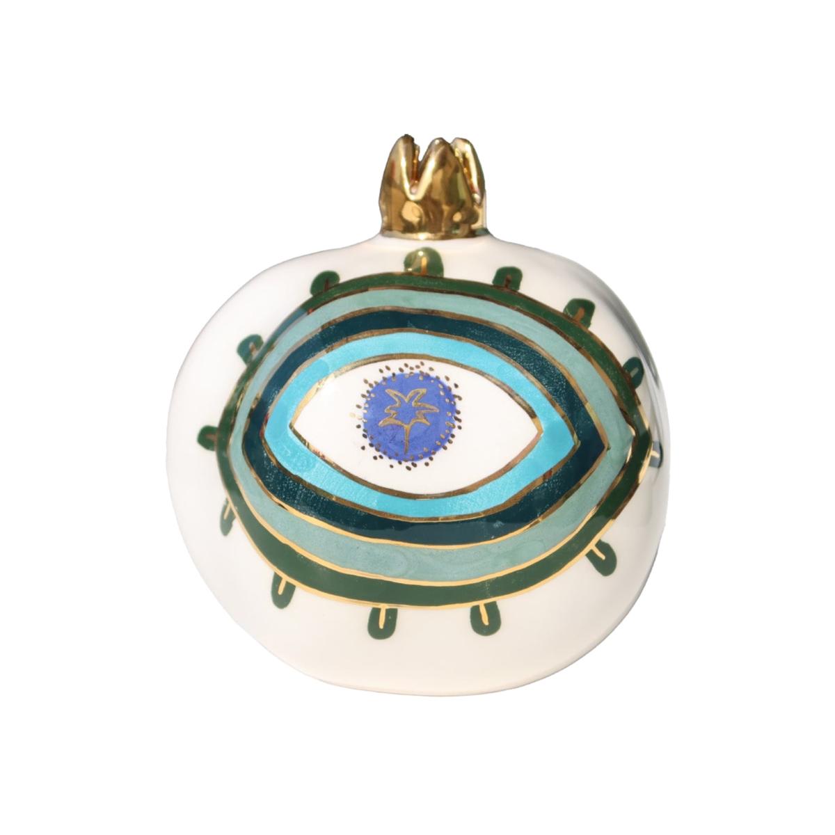 Handmade and hand-painted with love, this ceramic pomegranate features the striking Green Eye Palm Tree design, symbolizing protection, strength, and natural beauty. Its vibrant artistry makes it a stunning and meaningful addition to any space.