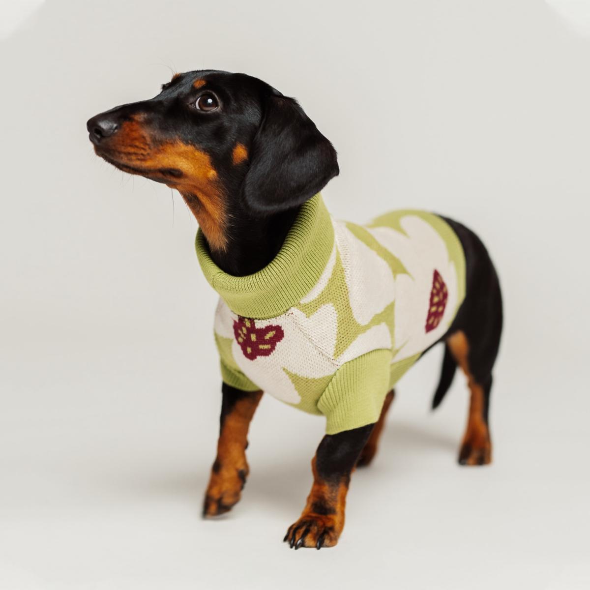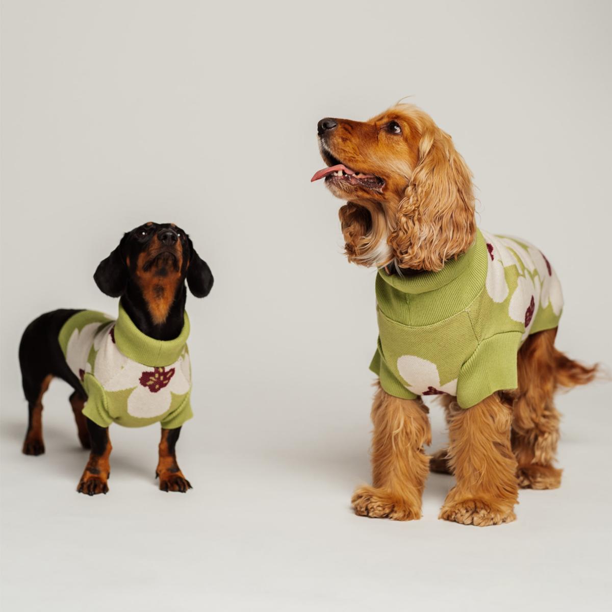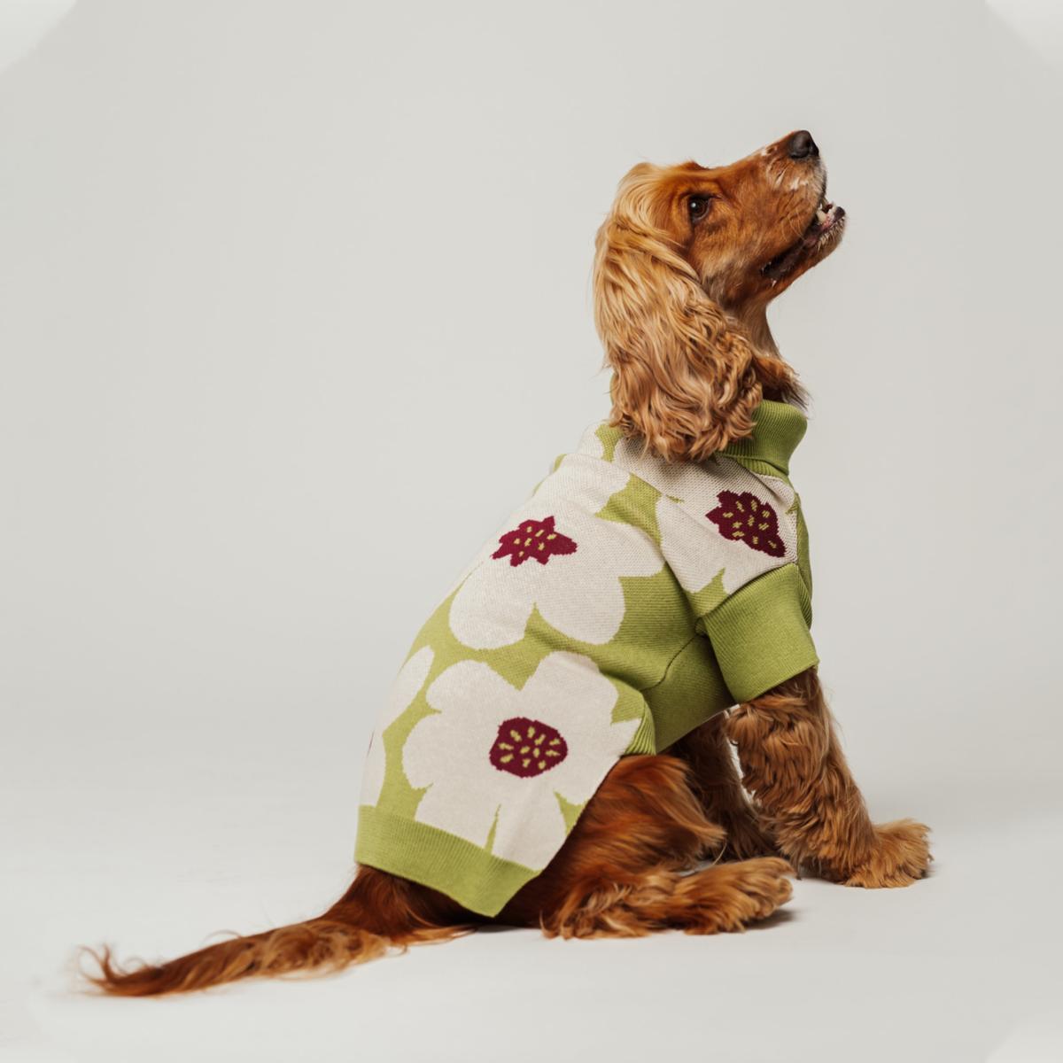 Introducing the perfect iconic sweater to keep your furry friend fashionable and cosy! Featuring a delightful flower pattern, this sweater boasts a foldable high neck, ribbed chest, and rib trim. It includes a convenient leash hole on the back and is crafted from soft, warm, and cozy organic cotton, made locally. The sweater's elasticity ensures a comfortable fit for various body shapes of our beloved pets.