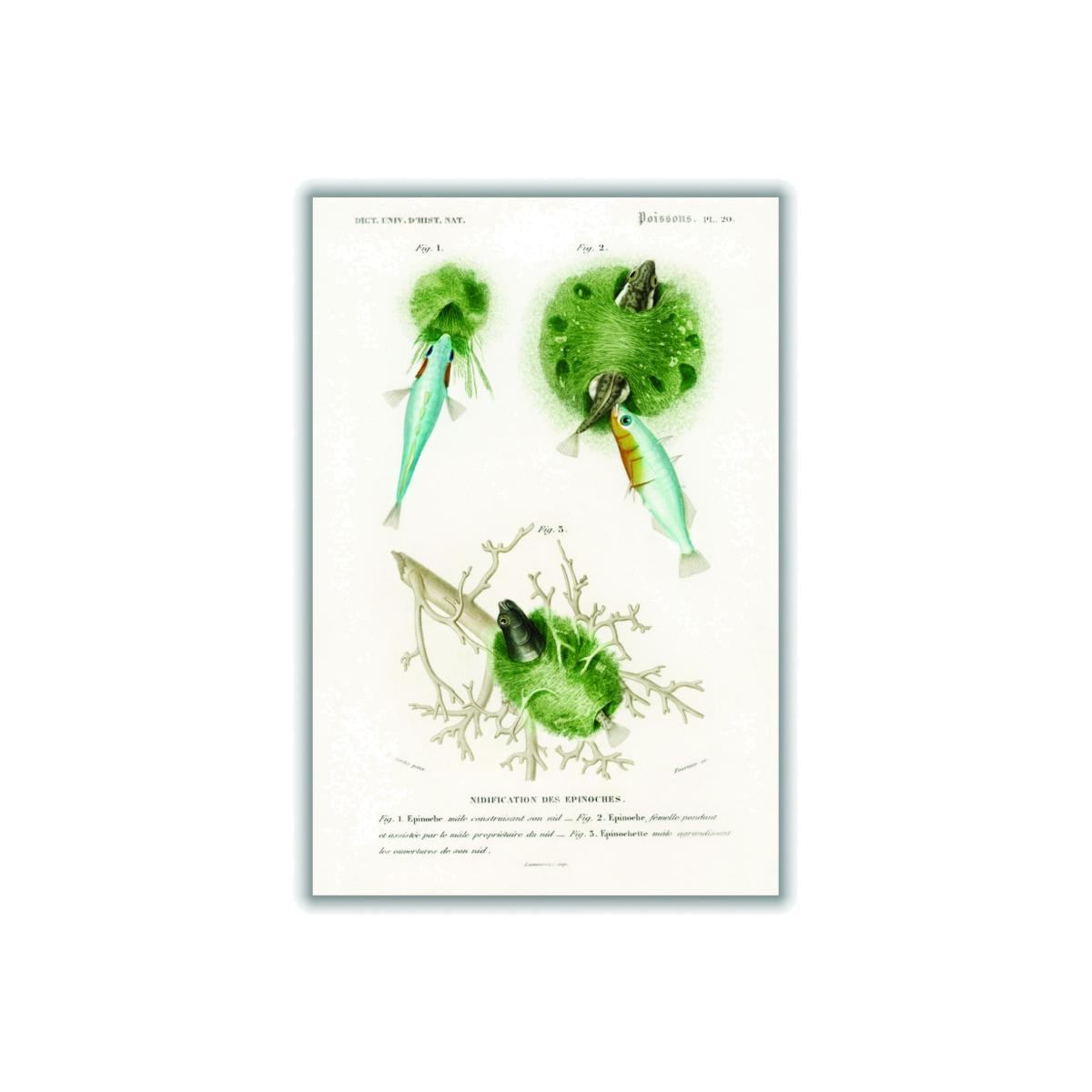 I love the green gasterosteus print for its fresh and scientifically intriguing aesthetic. It works particularly well in minimalist or contemporary interiors, where its botanical and fish illustrations can serve as focal points without overwhelming the space. To style it effectively, consider framing it in a sleek, simple frame and hanging it in a living room, study, or hallway that benefits from a touch of natural curiosity. Pair it with other nature-inspired décor or neutral tones to let the artwork stand out, and keep surrounding furniture understated to maintain a balanced look. This piece is practical for adding a scholarly, vintage vibe that brings a bit of the natural world indoors.