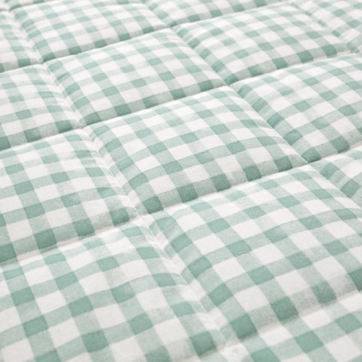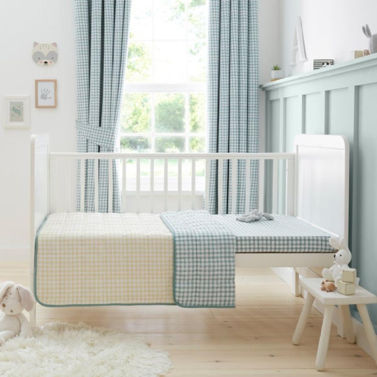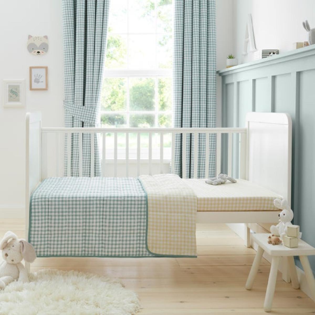 I love this green gingham quilt for its classic yet cheerful look, making it a versatile choice for many children's rooms. Its fresh, timeless pattern works particularly well in traditional or cottage-style interiors, but can also brighten up modern spaces with a simple wash of colour. Practical styling tips include pairing it with neutral or coordinating bed linens to create a calm overnight retreat, or layering it with soft textured throws for added warmth and visual interest. To keep the overall look cohesive, consider complementing it with matching curtains or accessories in similar pastel shades, ensuring the room feels thoughtfully styled without feeling overly busy.