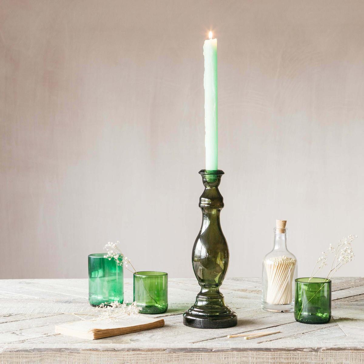 A viridian green candle holder made of glass, cluster them together and style with electric pink dinner candles and vintage linen napkins for an ambient dinner party or frame your mantel piece with a matching pair.