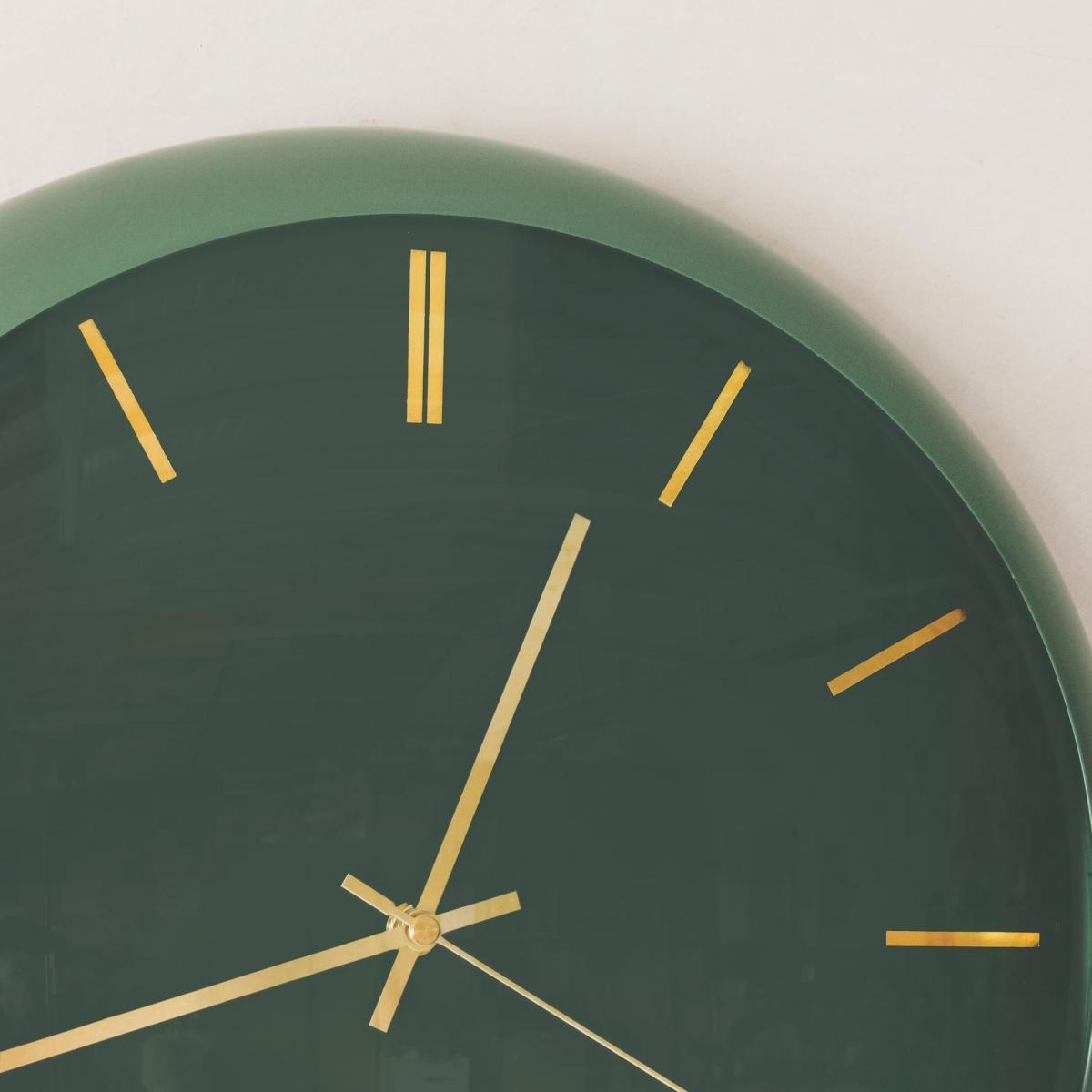 A classic wall clock with a domed shape in a subtle green with a black face and gold detailing to add a luxurious touch to your walls.