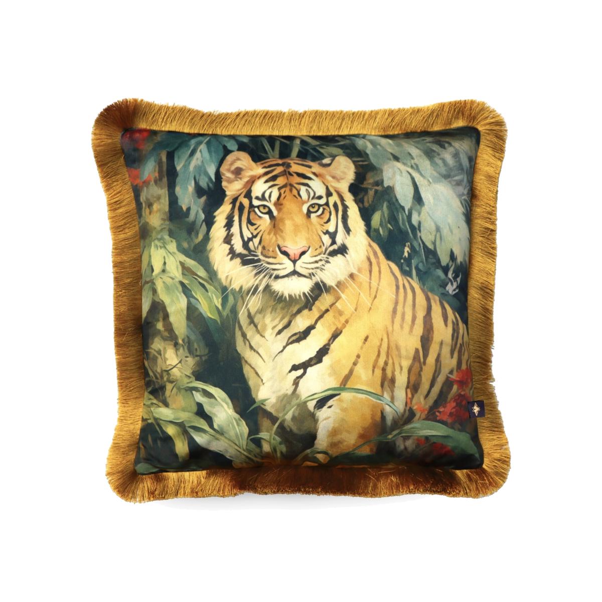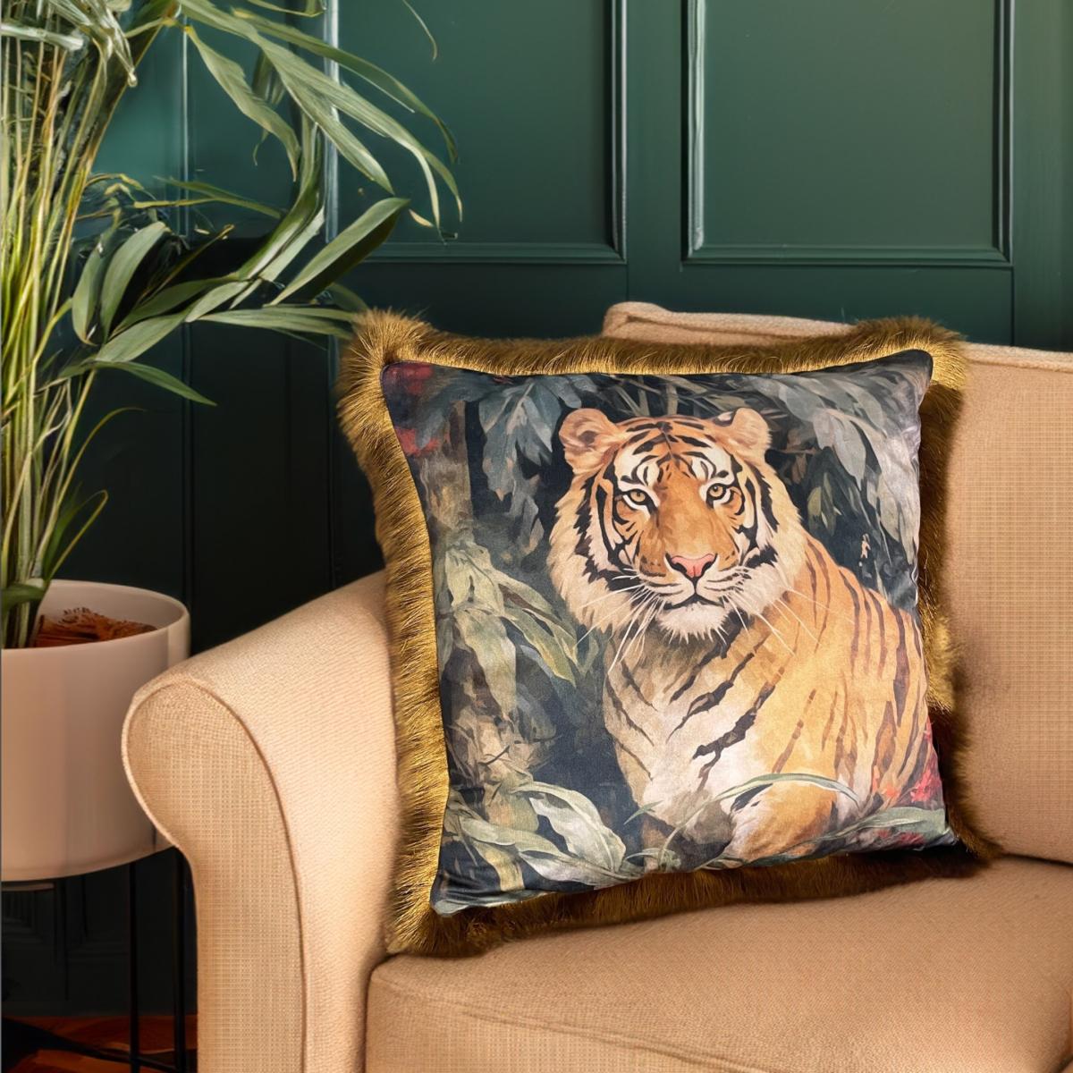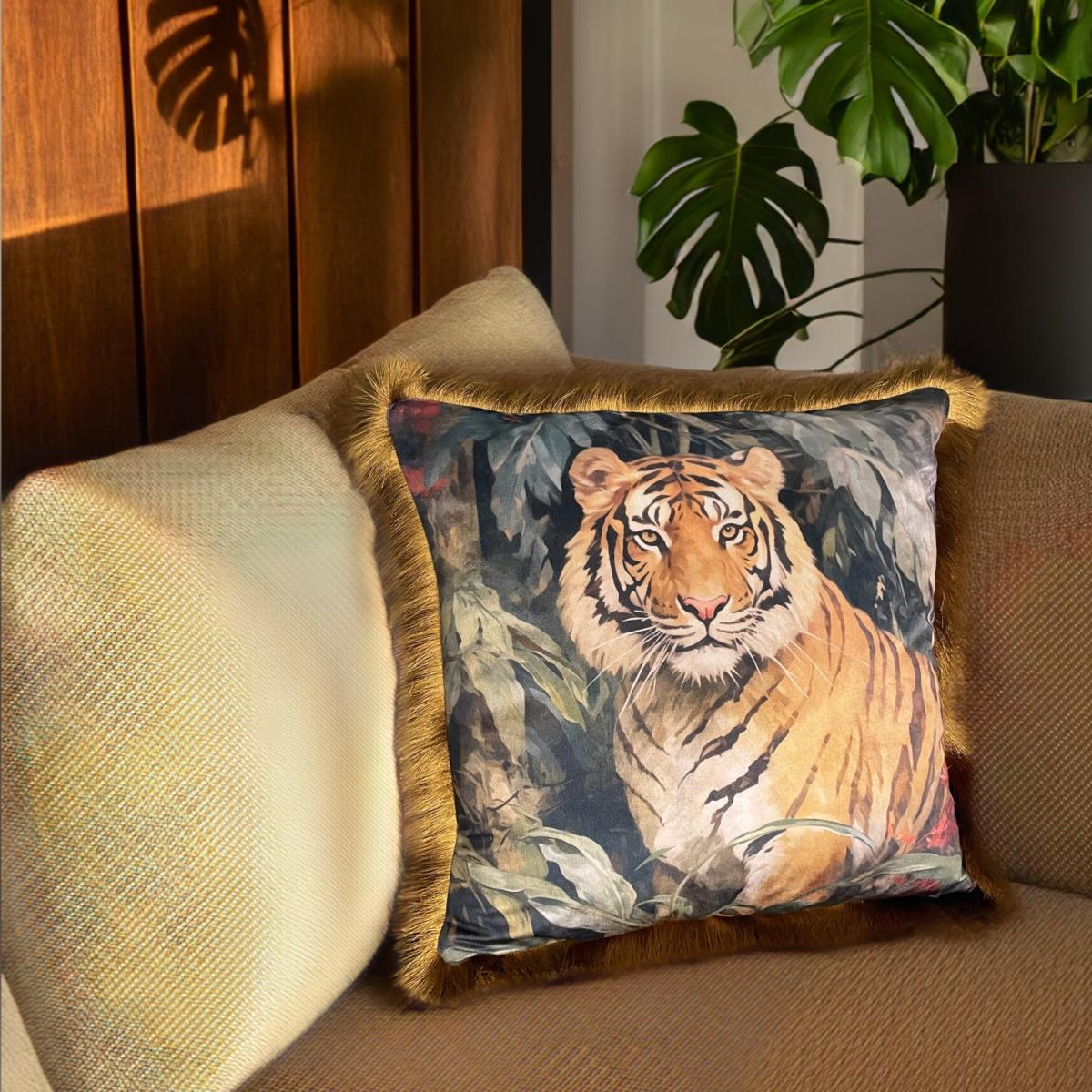 This stunning cushion features a painterly image of a regal tigress, meticulously crafted to capture every nuance of her majestic presence. The artwork, rendered in rich, vibrant hues, offers a striking focal point for your interiors, balancing grace and power with artistic finesse. Part of the Le Tigre Collection. Each piece, whether it be cushion, wallpaper, or fabric, is designed to transport you to the heart of the wilderness, where the spirit of the tiger reigns supreme as an empowered icon. Adorn your home with the essence of the jungle, and feel the untamed elegance of Le Tigre envelop your hidden wild side.