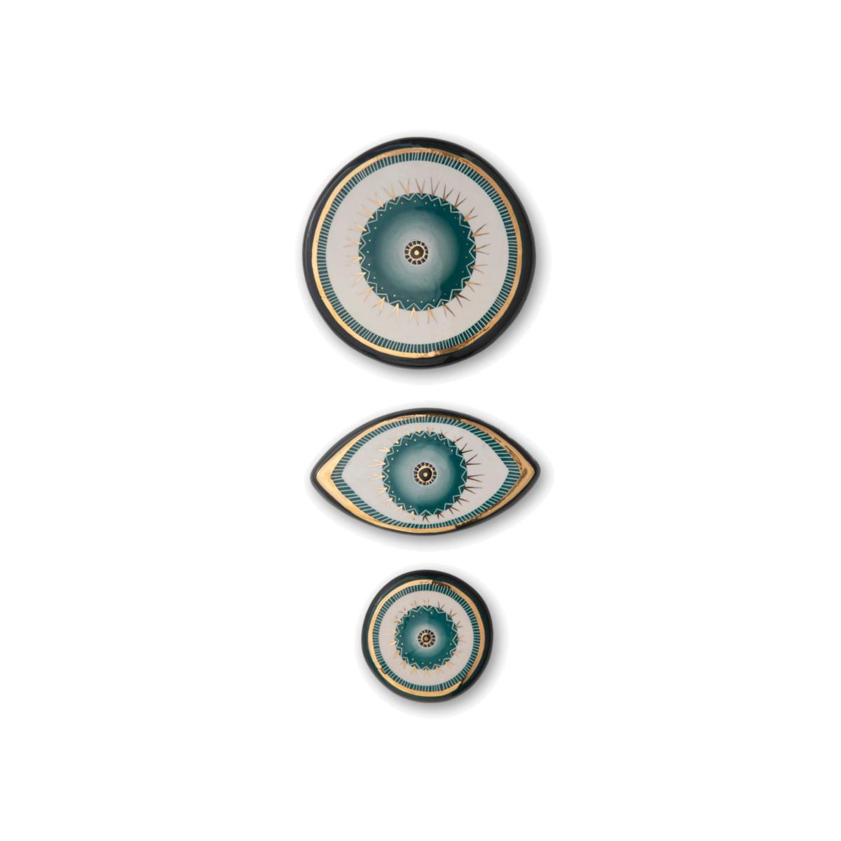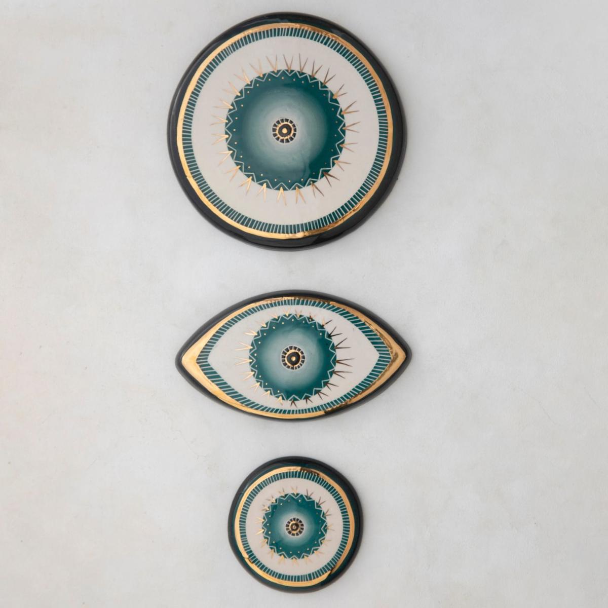 “Nazar boncugu” aka “The Evil Eye” is a traditional symbol believed to be a protection against the negative energy from the malevolent glares of people around us. Overall, it is a sign of good luck and protection. 🧿 Each piece is hand-built earthenware ceramics, fired, glazed, and then fired for the 3rd time for golden details with real 24ct Gold Luster. Each can be easily hung on the wall with the nail hole behind it. Each comes in a gift pack with a handmade felt gift case. They are all %100 handmade so there may be slight differences.