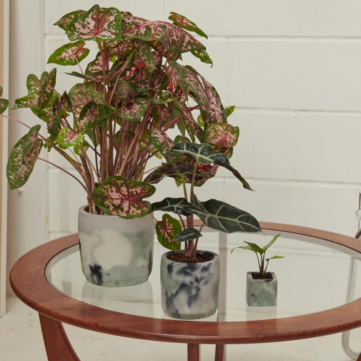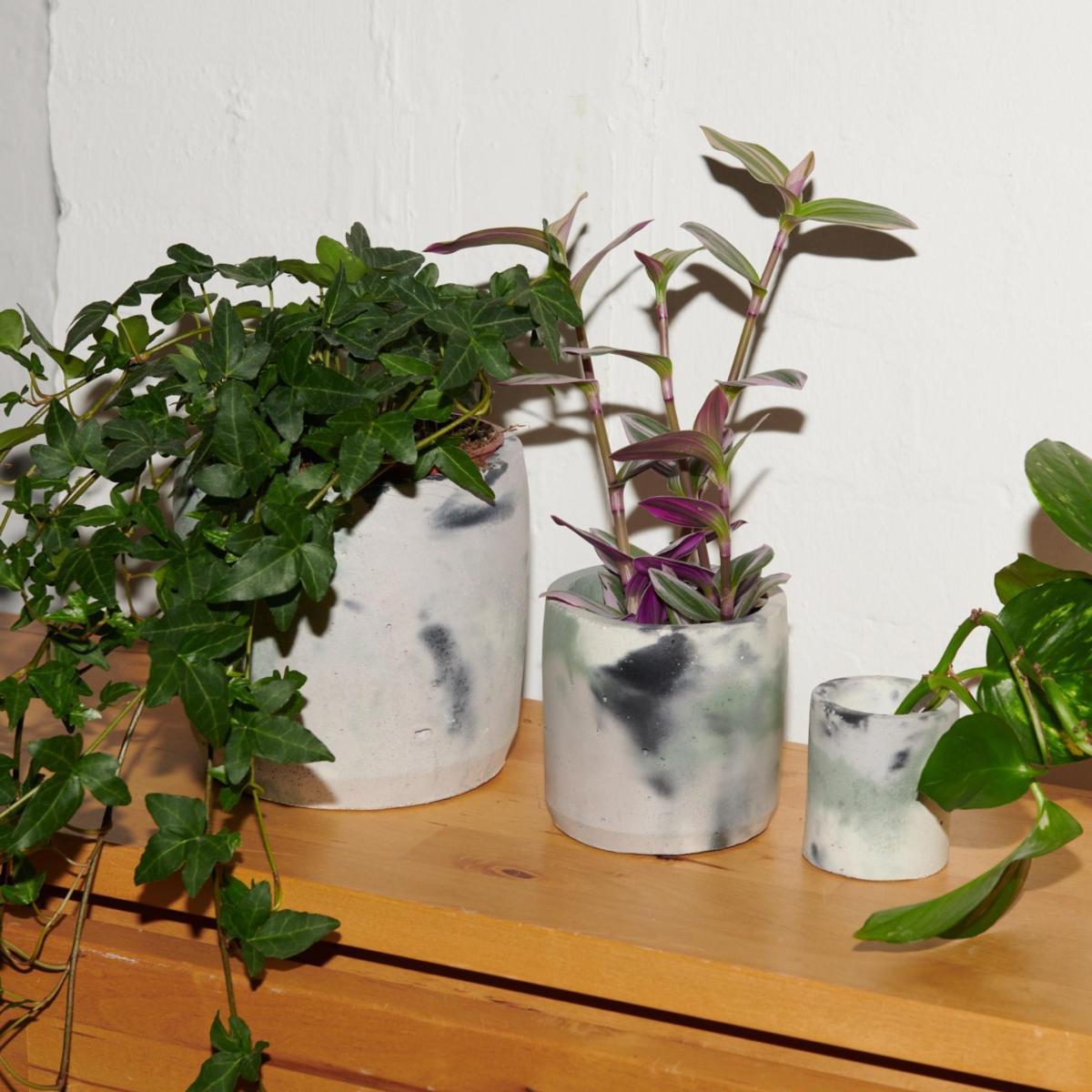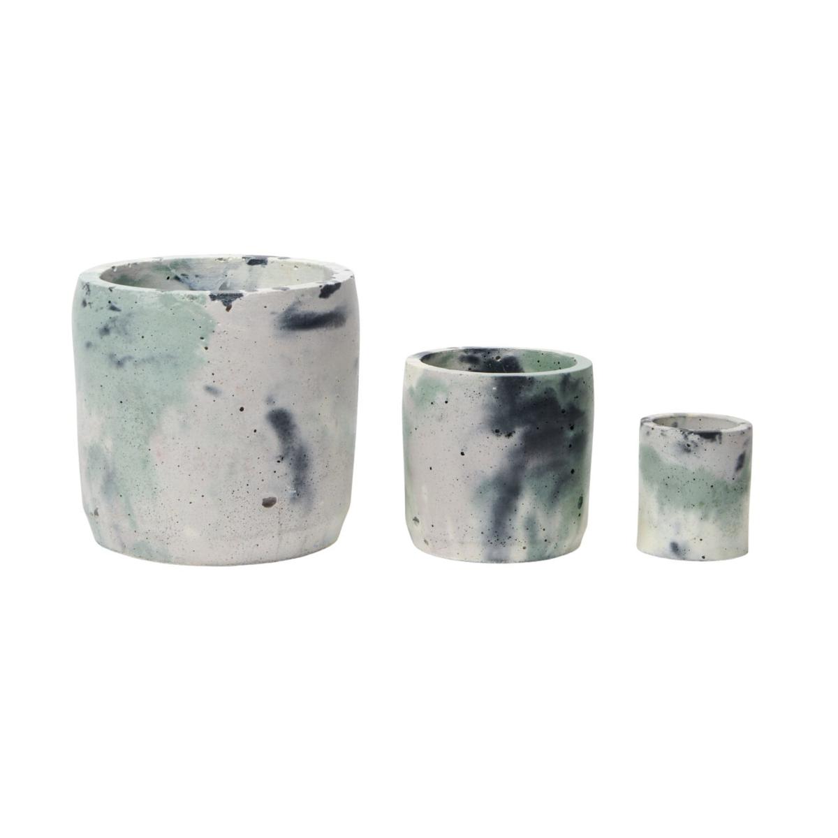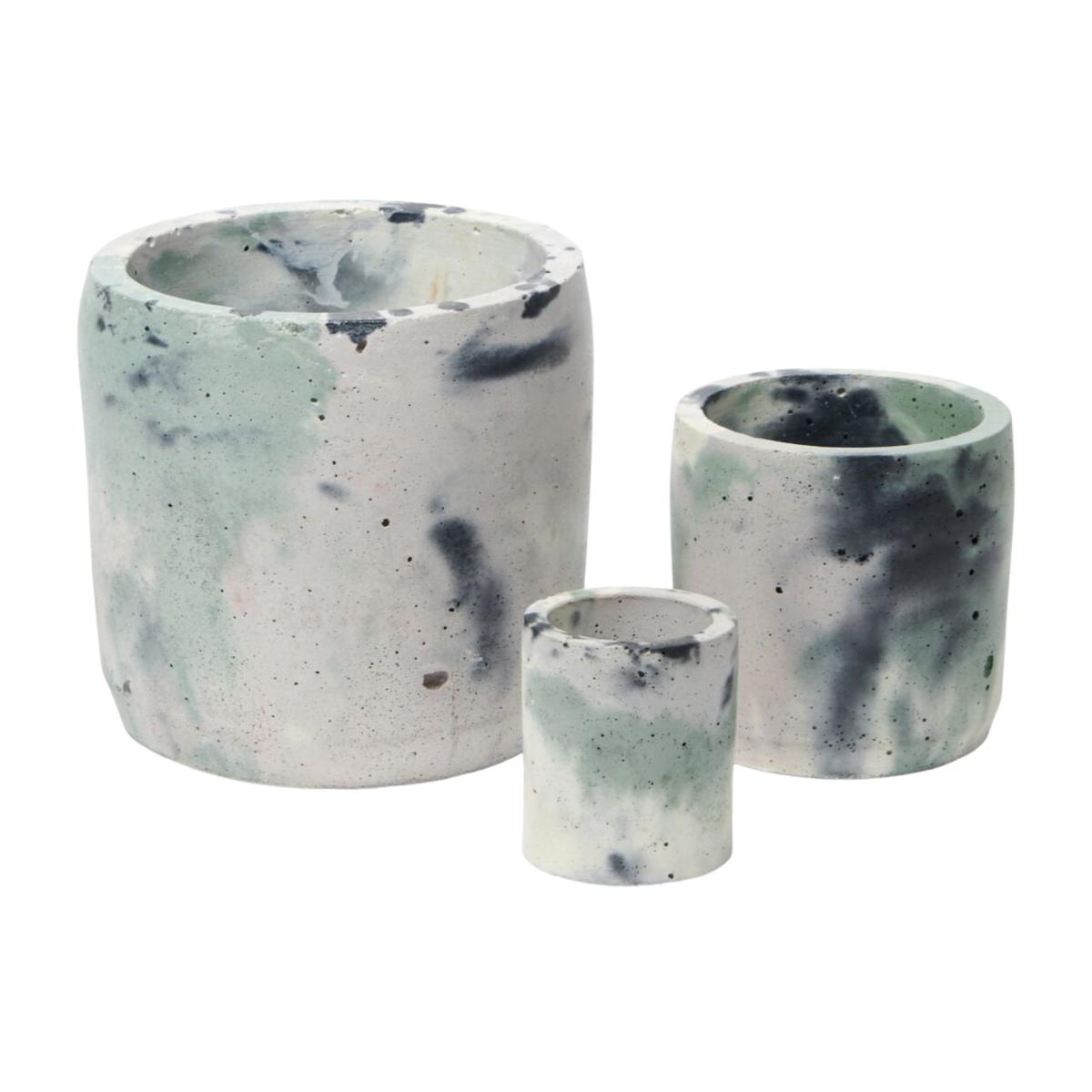 Our Concrete Pot Set will make the perfect gift for plant-lovers everywhere! Combining an earthy palette of khaki and sand, with a subtle hint of lilac, we love these tones to wear and to display at home. This set of three pots (small, medium, and large cylinders) is both sturdy and stylish - and what better way to spruce up your space than with this rock-solid trio? Perfect for plants or storage. Each concrete pot is handcrafted in coloured concrete in our London studio. The sealed finish makes this product suitable for indoor and outdoor use. Due to concrete being a handmade and natural product, the images should be used as a guide only, as colour and distribution variations may occur.
