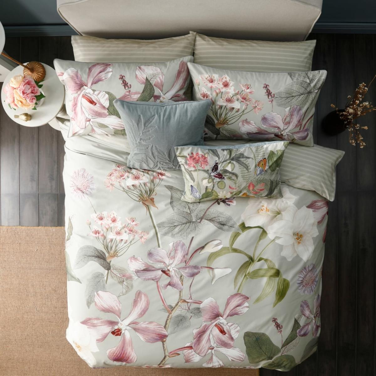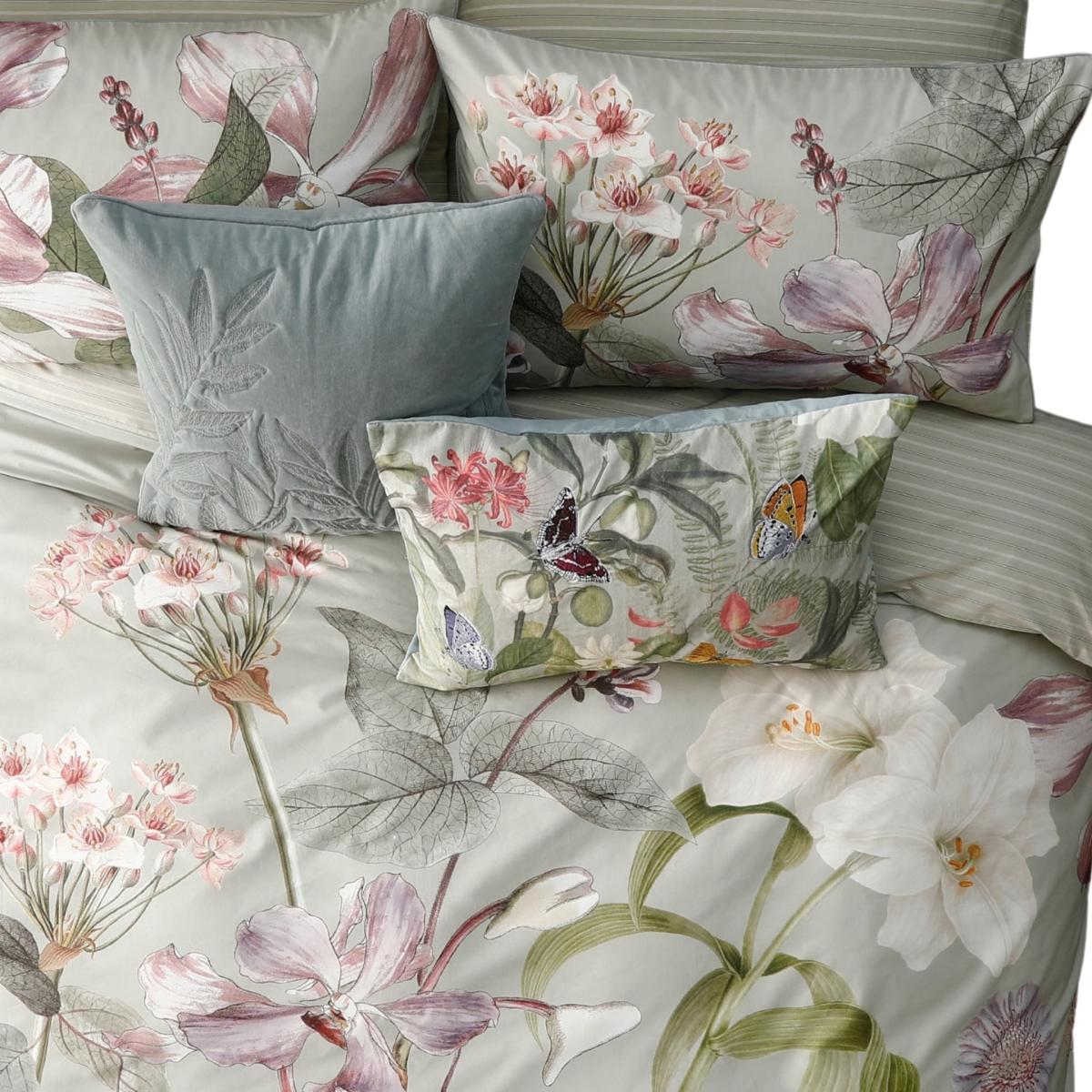 This bold explosion of colour and form is full of botanical abundance. The reverse is a wonderful tonal pinstripe of white and rose on a sage green ground. Digitally printed onto 200 thread count cotton. A superior production process delivering thefinest quality print detail; the depth and clarity of which is vital when reproducing the exquisite botanical artworks from Kew’s collection.