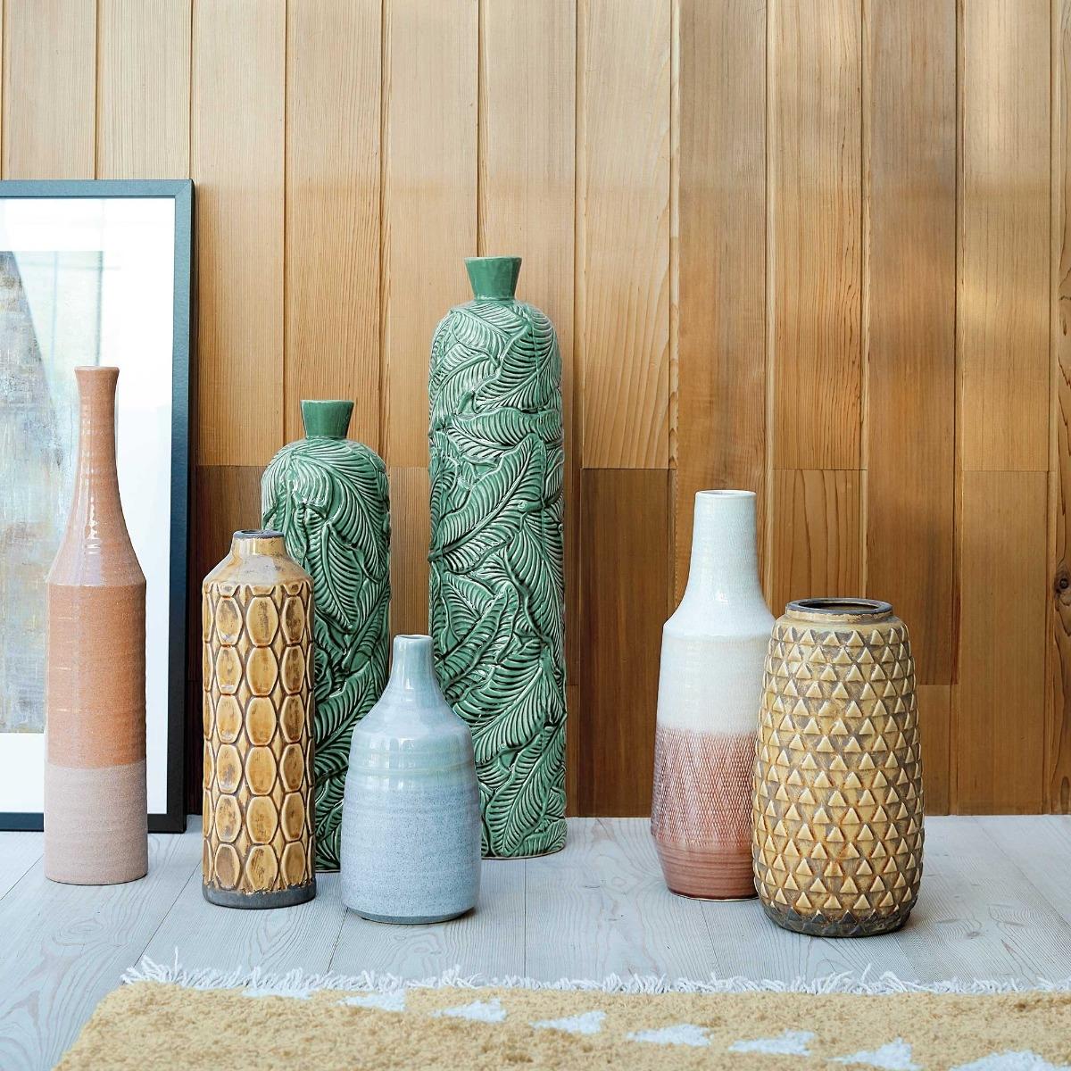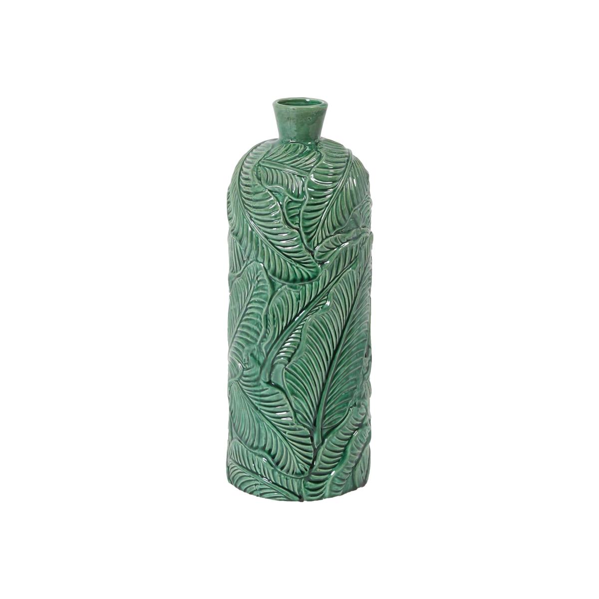 Design. A fun and fresh way to introduce a botanical feel to your interior, the Green Leaf Patterned Vaselooks just as fabulous when filled with flowers as it does on its own. Carefully crafted from ceramic with a glossy sheen, it features a beautifully textured surface with all-over embossed leaf detailing. Perfect for fireplaces, console tables, sideboards and more, the vase looks at home in modern, traditional and industrial interiors alike.