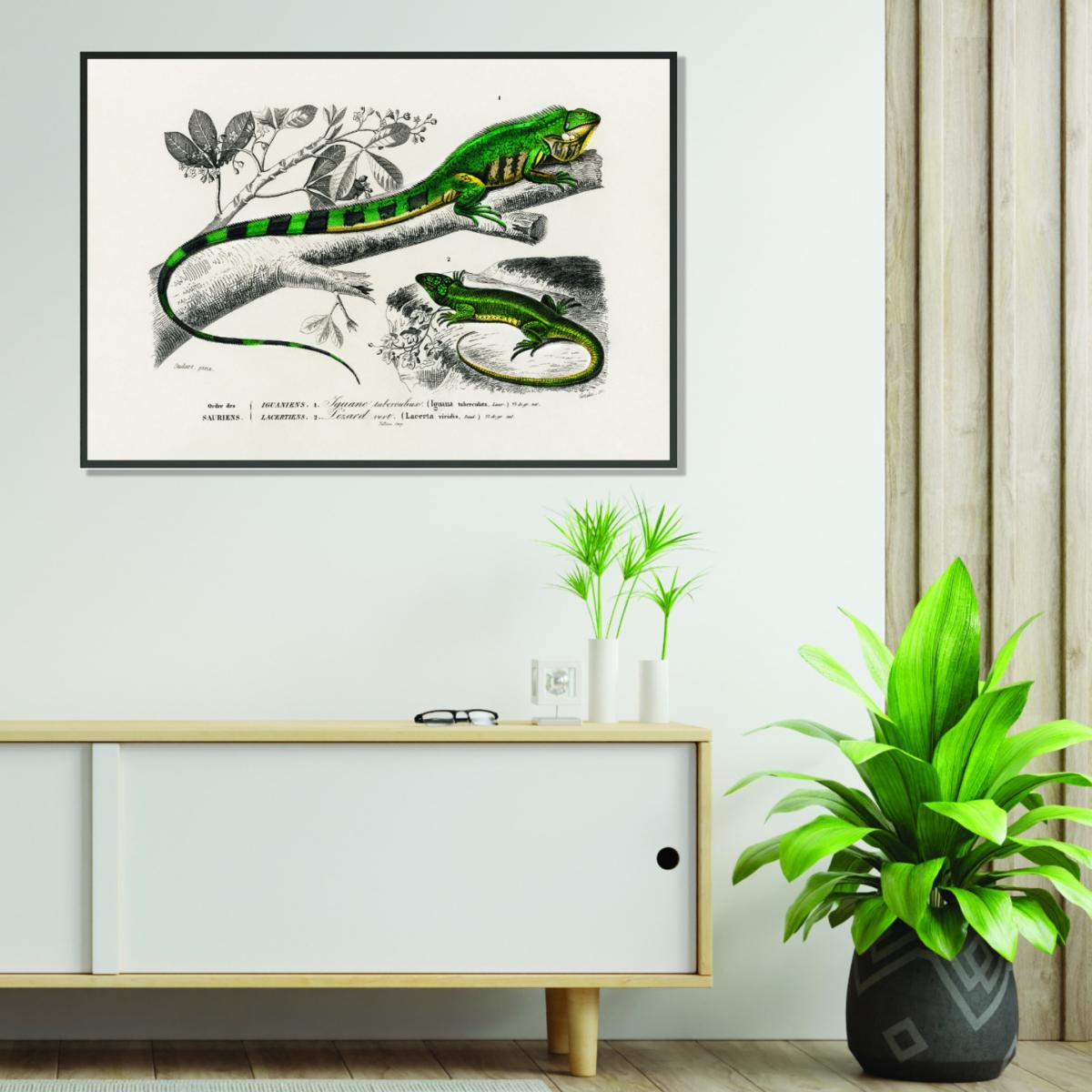 This print of a green lizard is a striking piece that adds a vibrant natural element to any space. I love it for its bold colour and detailed illustration, making it ideal for eclectic, vintage, or botanical-inspired interiors. It works particularly well in rooms with neutral tones, where the green can truly pop, but it can also complement a jungle or tropical theme. Practical styling tips include pairing it with leafy plants or woven textures to enhance the natural vibe, and positioning it at eye level in a gallery wall for maximum impact. Its size lends itself to being a focal point, so consider hanging it above a sofa or sideboard to create visual interest.