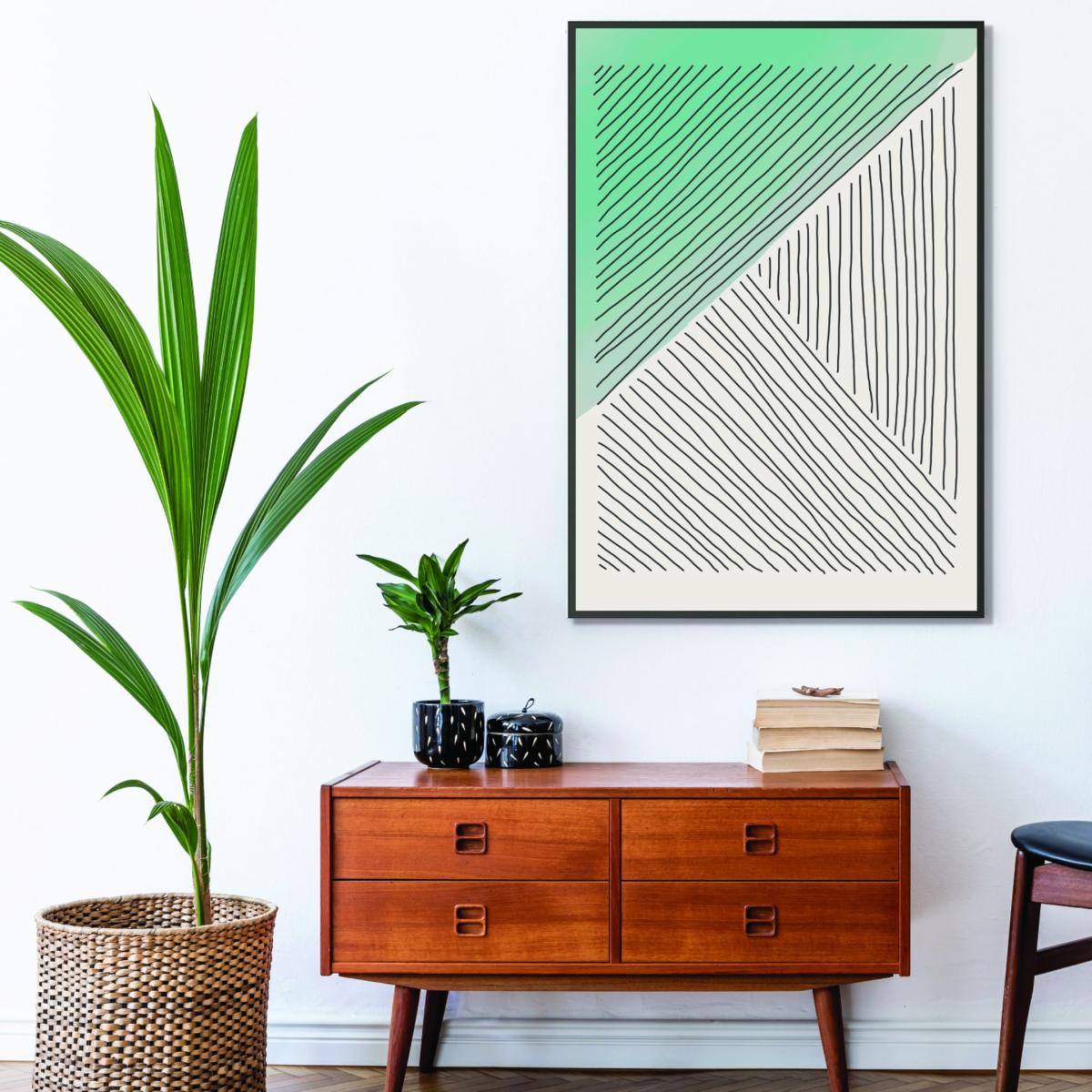 I love this print for its clean, understated design that effortlessly fits into a variety of interiors. Its minimalist aesthetic works particularly well in contemporary or Scandinavian-style spaces where simplicity and colour restraint are key. To style it effectively, consider placing it above a neutral sofa or desk, pairing it with other understated accessories to keep the look cohesive. Its gentle green hue adds a touch of colour without overwhelming, making it versatile for both personal and office settings. A practical tip would be to frame it simply in a slim, wide-edge frame to enhance its modern feel and ensure it remains a subtle yet impactful focal point in your room.