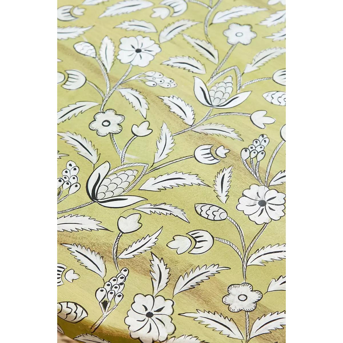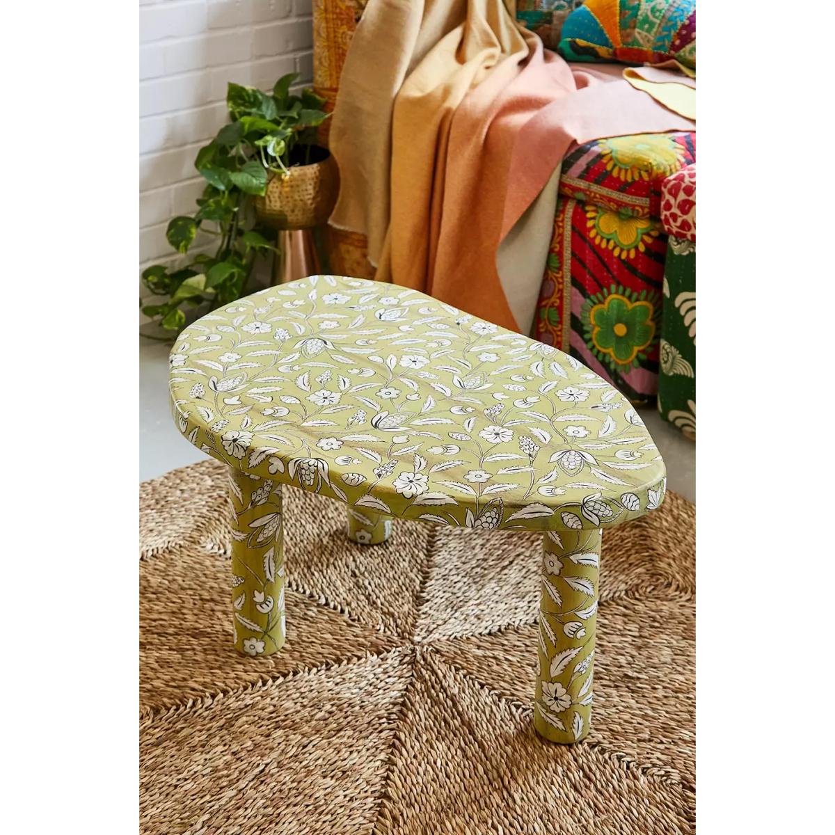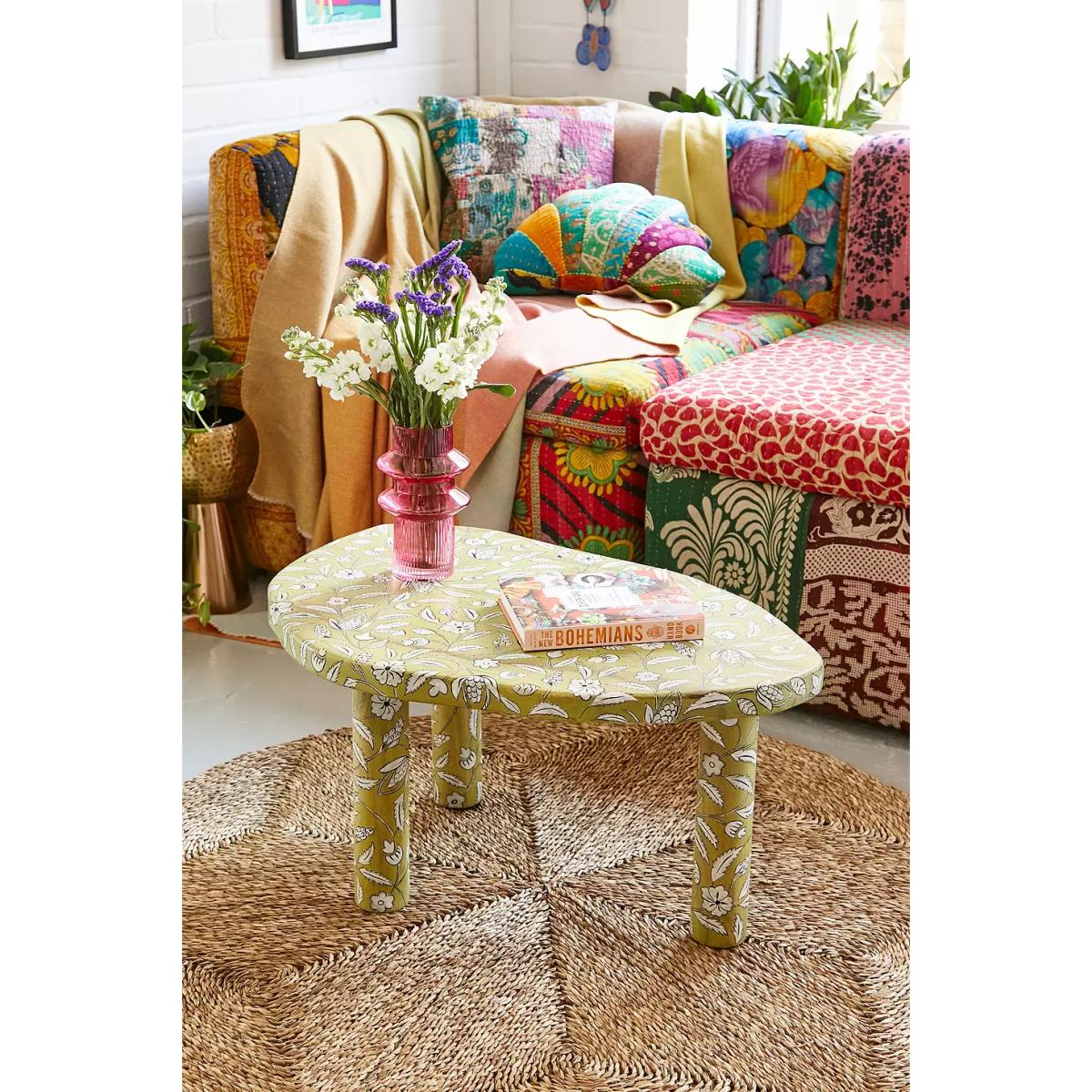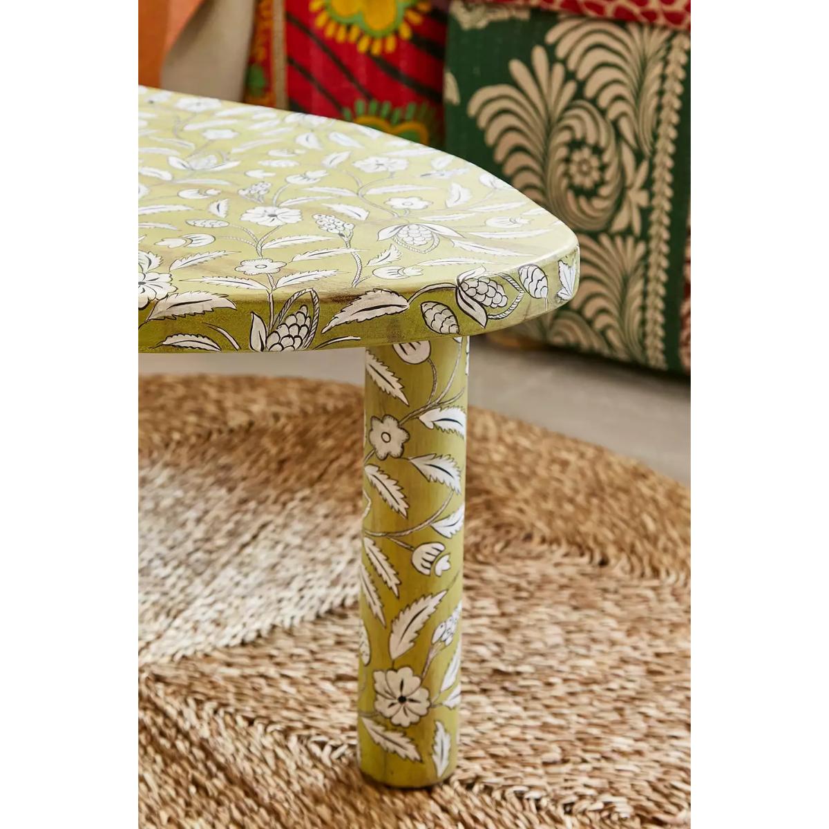Elevate your space with this organic-style coffee table complete with abstract shape table top and three tall cylinder legs. Topped with a painted floral print all over. **Content + Care** \- 100% Mango wood \- Wipe clean