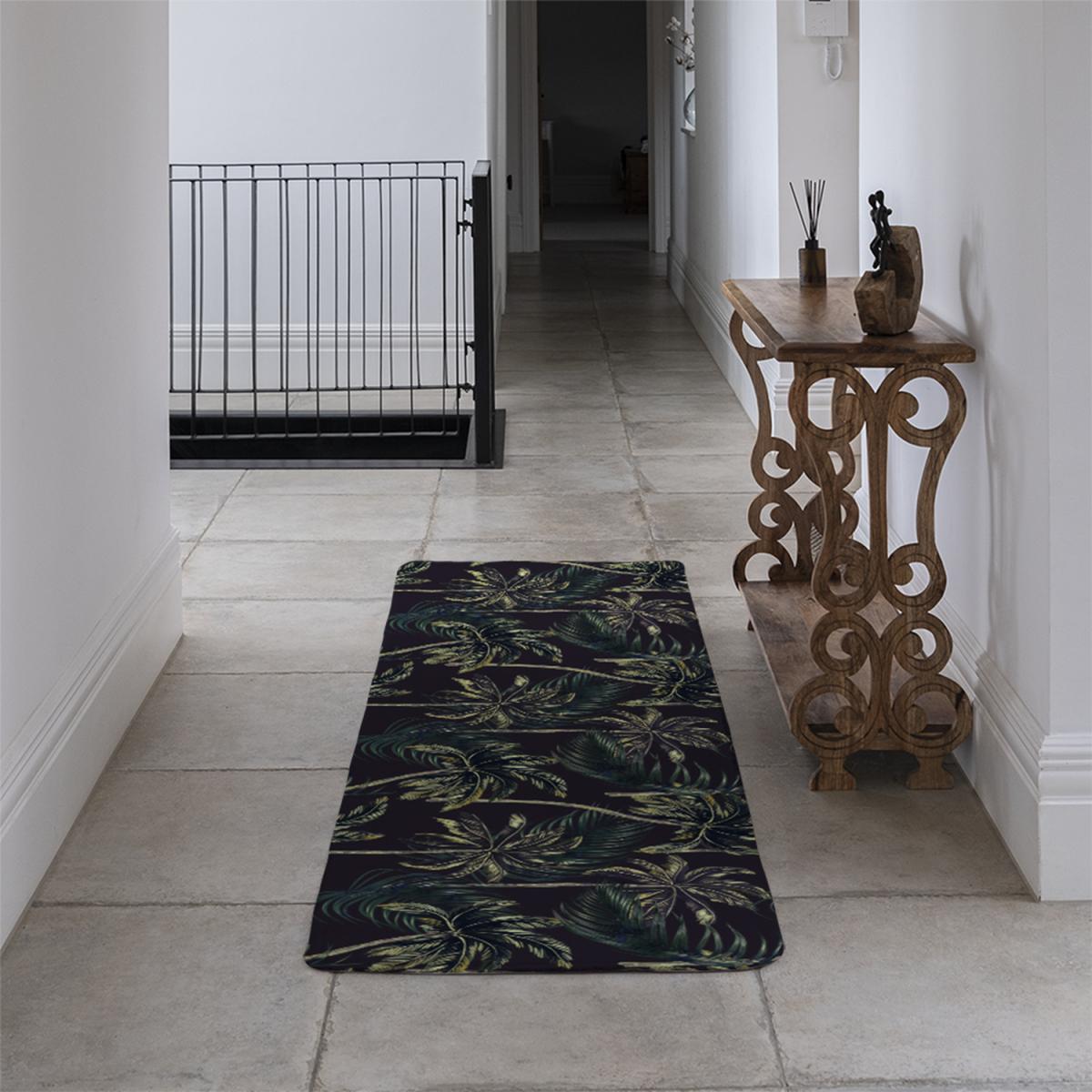I love this green palm runner rug for adding a touch of tropical flair to hallways or narrower spaces without overwhelming the area. Its dark background makes it practical for hiding dirt, while the lush palm print adds visual interest. It works well in contemporary or boho interiors, especially when styled with neutral or natural tones. For a cohesive look, consider pairing it with indoor plants and understated furniture to let the pattern stand out. Practical styling tips include layering with a runner pad for grip and durability, and choosing complementary accessories in earthy shades or metallic accents for a balanced aesthetic.