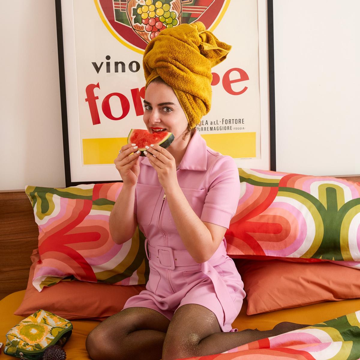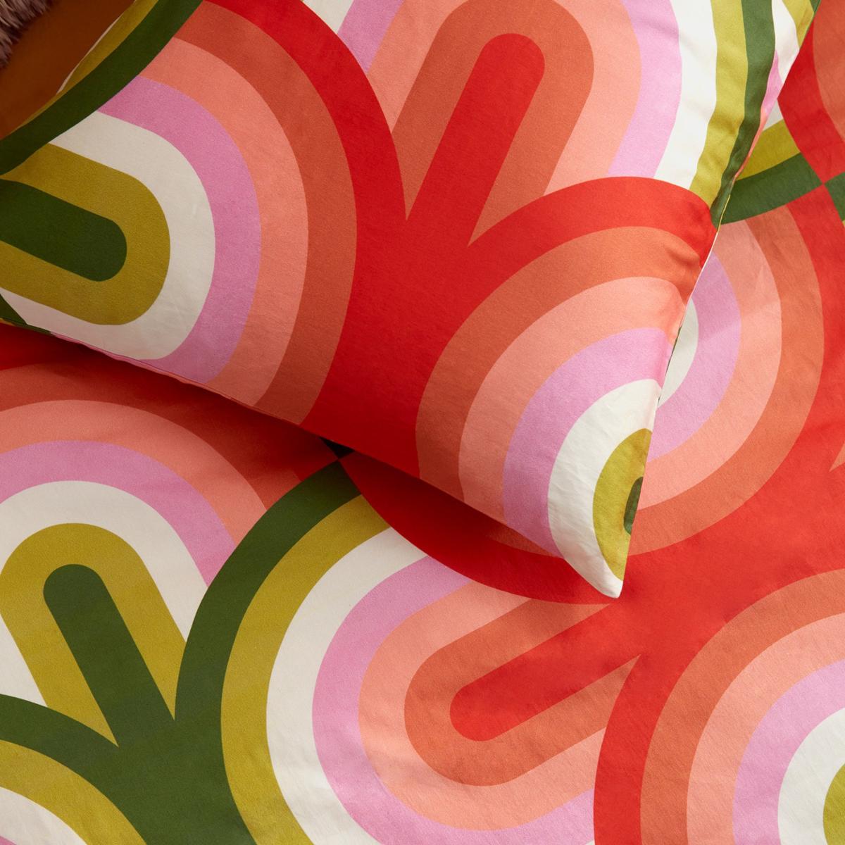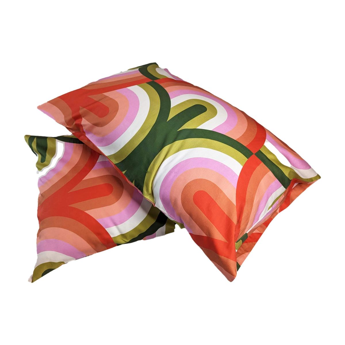 Make a splash with a pair of our Groove Inn pillowcases. With their 1970s geometric pattern and watermelon hues, get ready to transform your bedroom into a groovy poolside paradise 🍉 Crafted from 100% organic cotton, the silky satin 300 thread-count weave will keep you cool, while the vibrant print will bring the heat to your dopamine dreams ✌️ Our pillowcases are great for your face, too - Organic cotton has natural anti-microbial properties while the silky satin weave is smooth and gentle against your delicate facial skin. Waves, warmth, lines and checks feature in our debut collection inspired by motel interiors and the cruising culture of 1970s California.