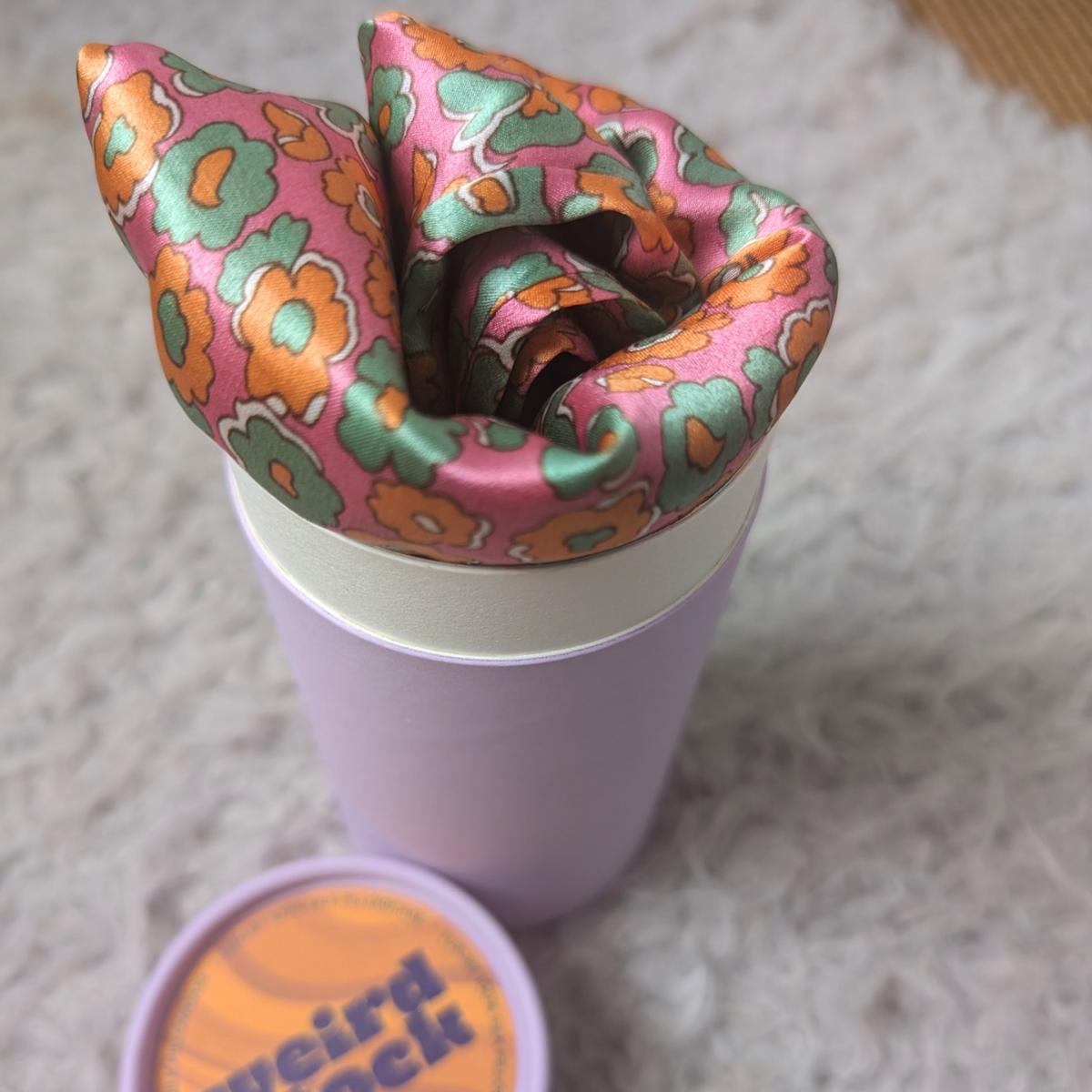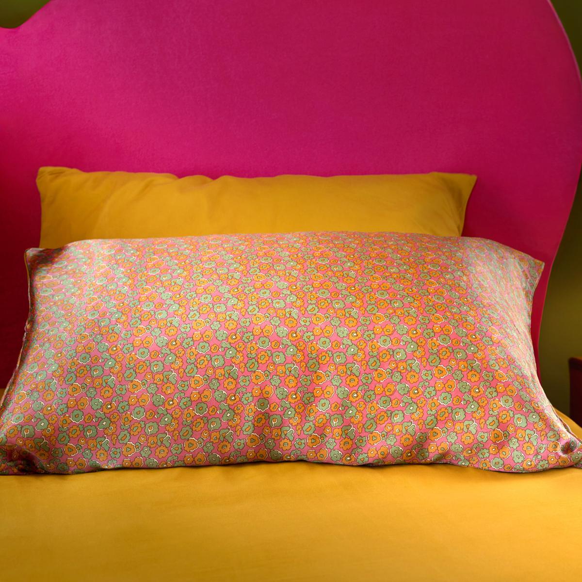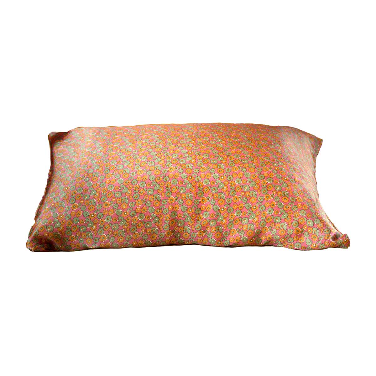 100% luxury silk pillowcase made in India, in a pink, orange and green retro floral print. Our pillowcases are more than cute to look at. Silk's low friction surface reduces hair breakage and frizz, locking in moisture. Gentle on skin too, it's naturally hypoallergenic and antimicrobial, preventing creases and keeping your skin looking fresh. Comes in a beautiful lilac tube with care card, perfect to give as a gift.