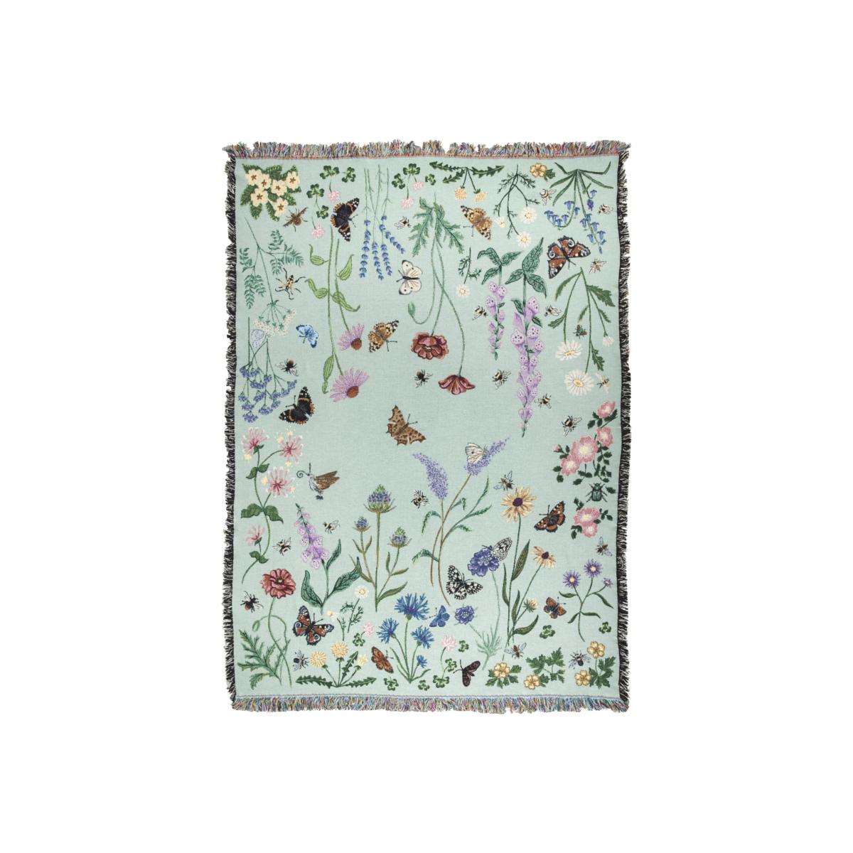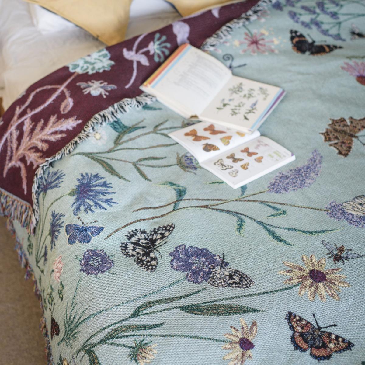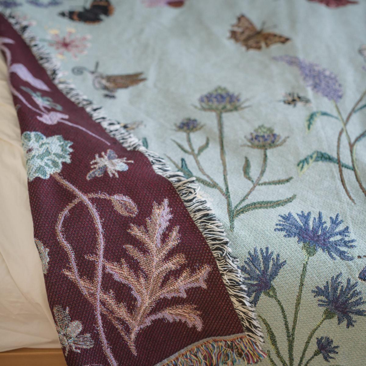 Introducing the Pollination Meadow blanket which celebrates the captivating dance between flowers and pollinators. Growing up from either side you will find a bounty of flowering plants that have evolved to attract insect. The artwork is a testament to the harmonious relationship between flora and fauna, paying homage to the vital role pollinators play in our ecosystem. A soothing pale green background on the front is contrasted with a deep ruby back, making a truly stunning combination. The Pollination Meadow blanket elevates the ambiance of your space. Whether adorning your bed or elegantly draped over a chair, its depiction of flowers and pollinators becomes an exquisite focal point.