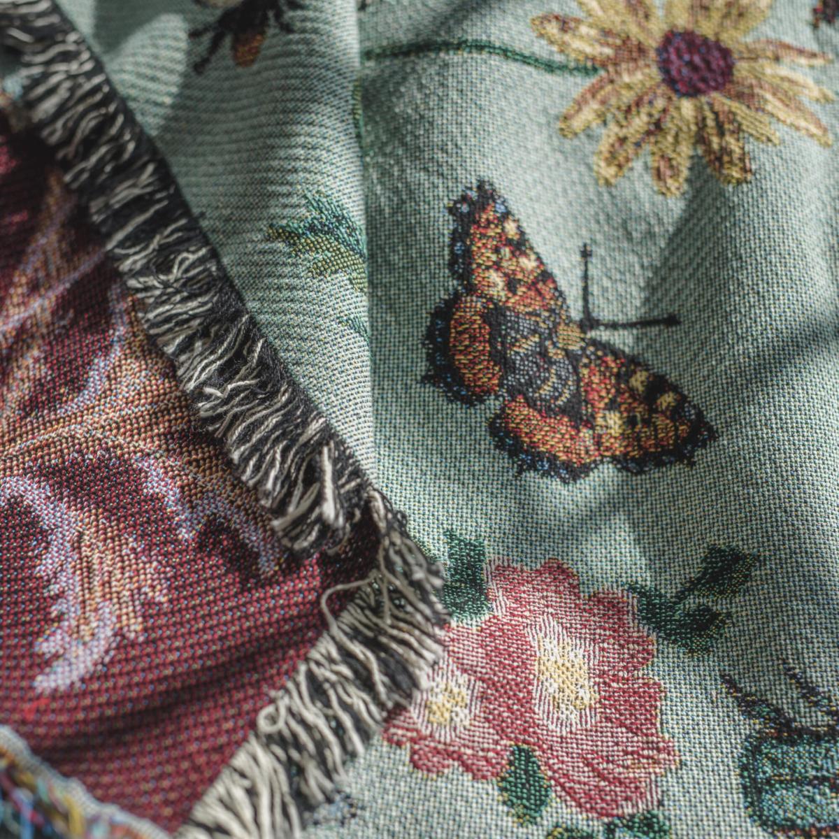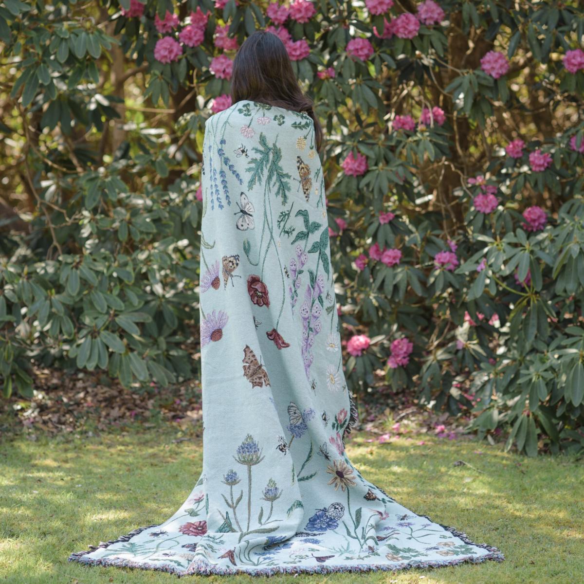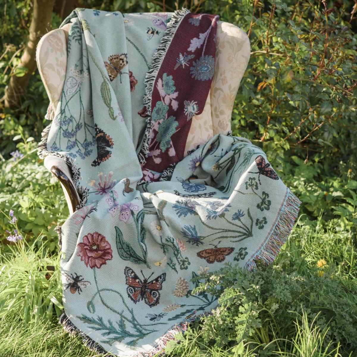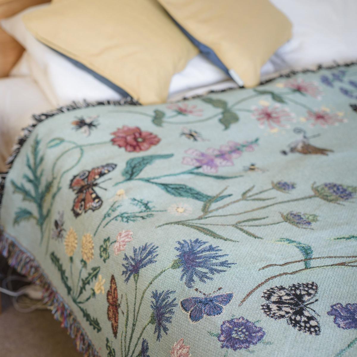 Introducing the Pollination Meadow blanket which celebrates the captivating dance between flowers and pollinators. Growing up from either side you will find a bounty of flowering plants that have evolved to attract insect. The artwork is a testament to the harmonious relationship between flora and fauna, paying homage to the vital role pollinators play in our ecosystem. A soothing pale green background on the front is contrasted with a deep ruby back, making a truly stunning combination. The Pollination Meadow blanket elevates the ambiance of your space. Whether adorning your bed or elegantly draped over a chair, its depiction of flowers and pollinators becomes an exquisite focal point.