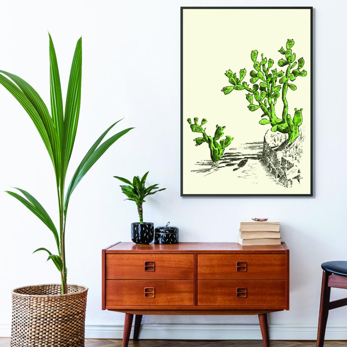 I love this oversized cactus print because it brings a vibrant, contemporary touch to any space, making it especially effective in modern or eclectic interiors. Its bold green tones work well with neutral palettes, adding a pop of colour without overwhelming the room. For styling, consider pairing it with minimalist furnishings or placing it above a simple console or sofa to create a focal point. Practical tip: this piece can also be complemented by indoor plants to enhance its botanical theme, making it ideal for living areas, kitchens, or even a home office looking for a bit of character. Its large scale makes it versatile for both walls in need of statement art or as part of a gallery wall for added visual interest.
