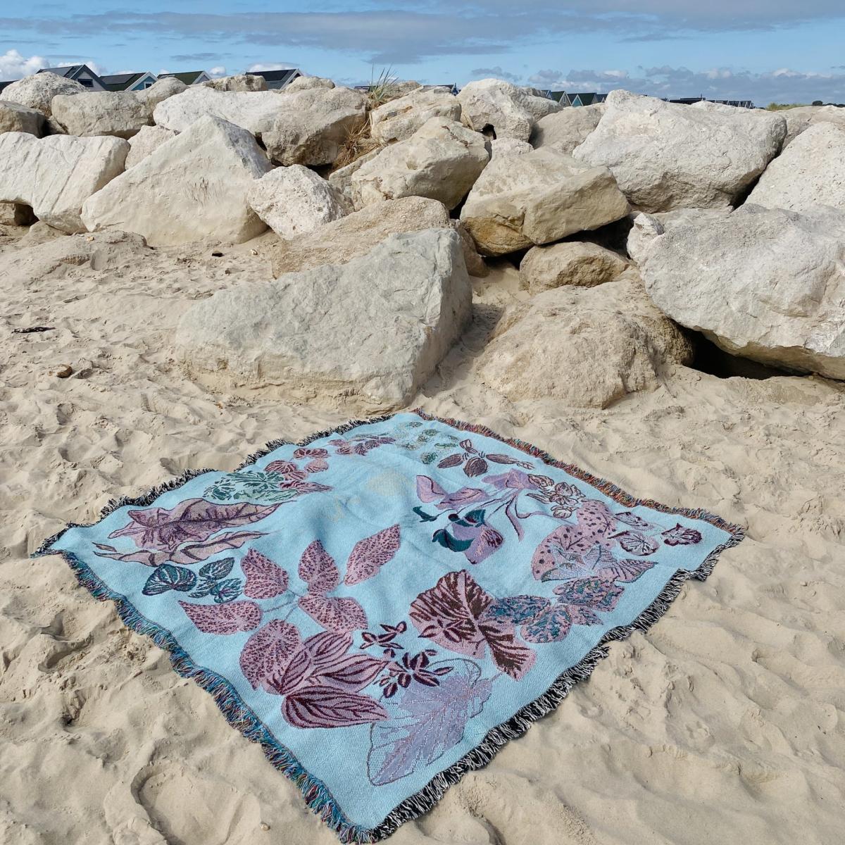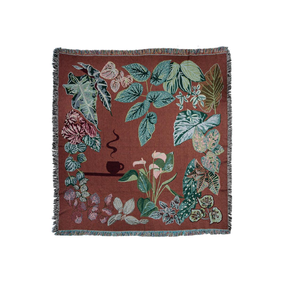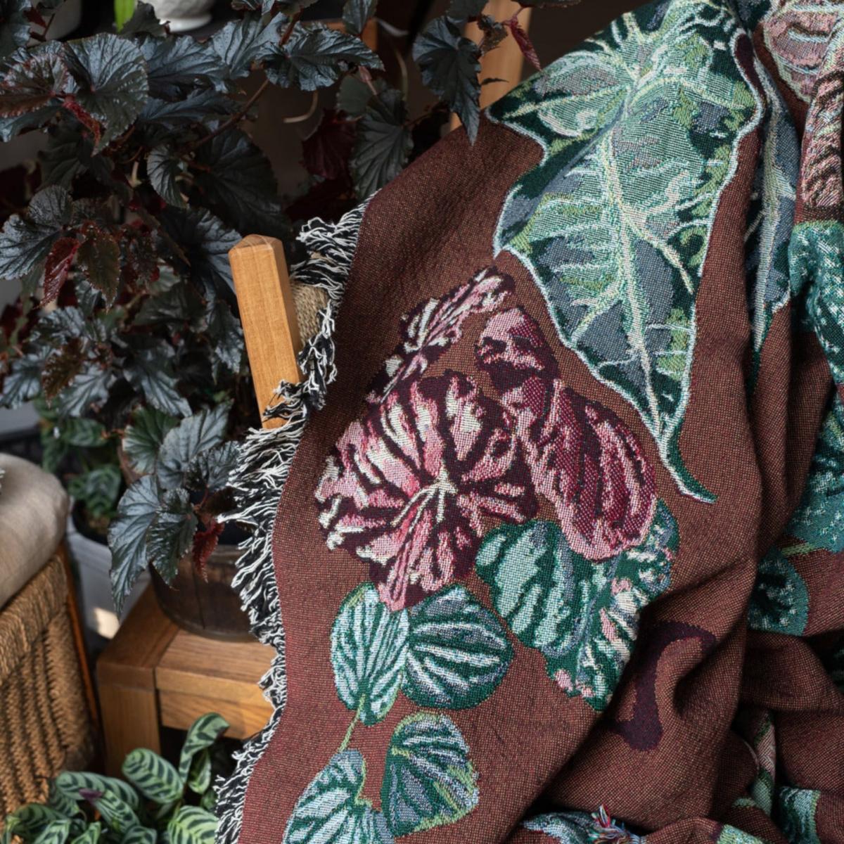 Indoor Jungle ‘Brew’, celebrates the connection between house plants & mental health. Plants have been shown to reduce stress, improve our mood and even increase productivity. This design celebrates the joy plants bring, sitting down among them with your favourite brew and mindfully taking a moment. It depicts species including Alocasia and Begonia, in warm burgundy tones on the front, contrasted with light aquamarine on the back. The blanket is beautifully soft and light weight, made from 95% cotton, 75% of which is recycled. It is machine washable, making it versatile to be used as a sofa throw, bed cover, table cloth, picnic or yoga blanket. It is woven, so both sides show the design in different and contrasting colours.