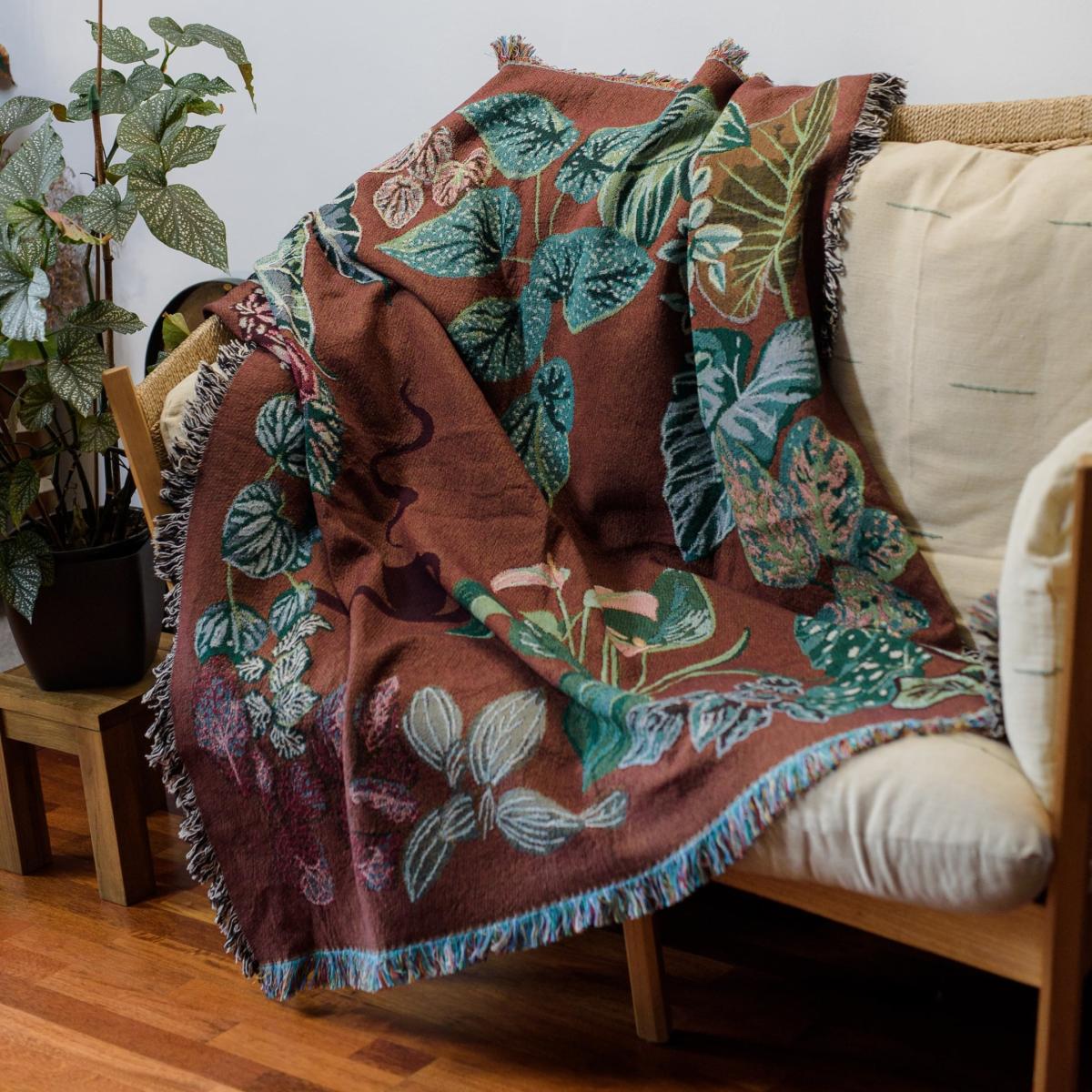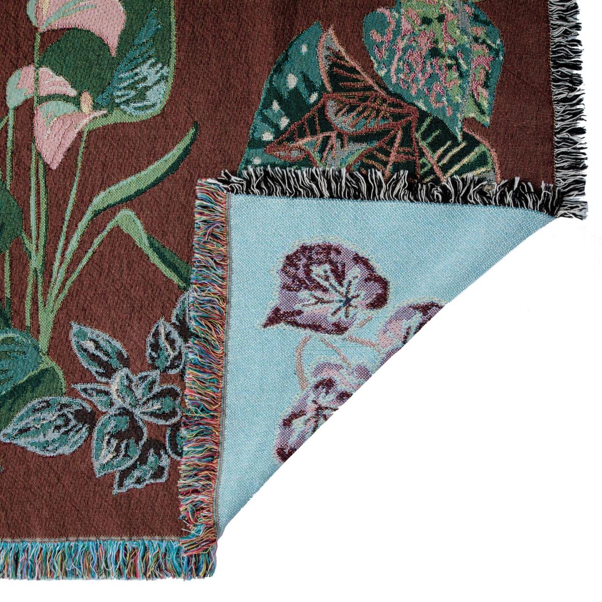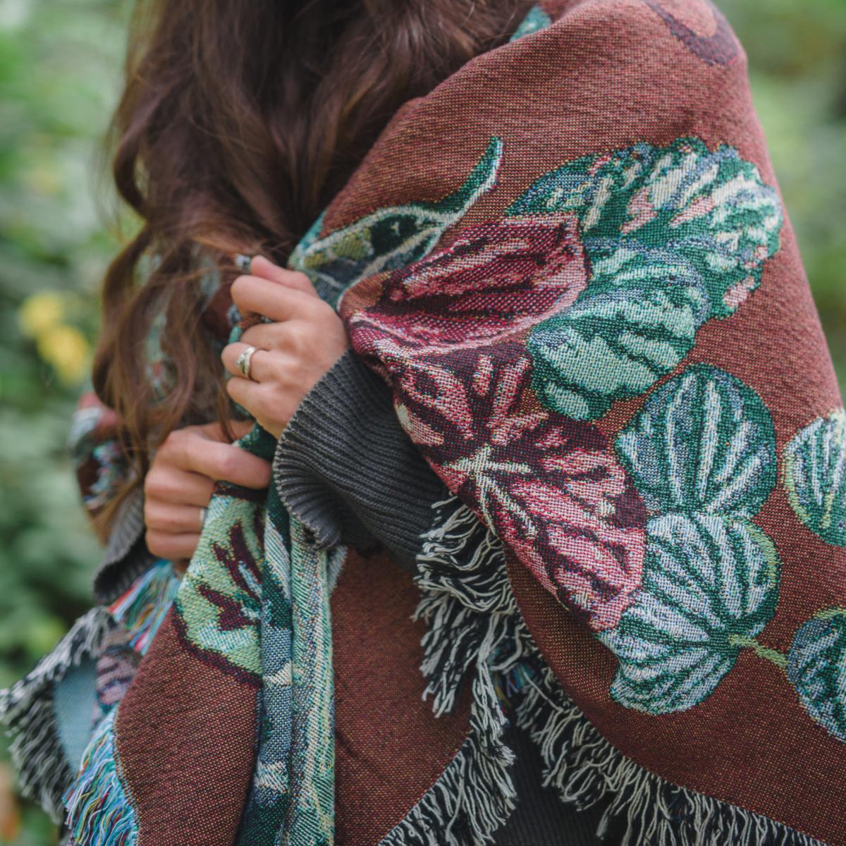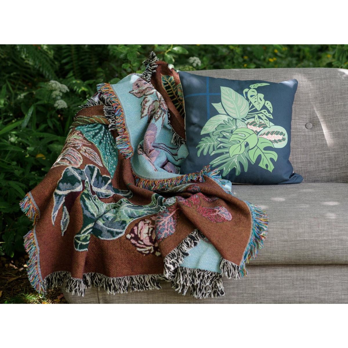 Indoor Jungle ‘Brew’, celebrates the connection between house plants & mental health. Plants have been shown to reduce stress, improve our mood and even increase productivity. This design celebrates the joy plants bring, sitting down among them with your favourite brew and mindfully taking a moment. It depicts species including Alocasia and Begonia, in warm burgundy tones on the front, contrasted with light aquamarine on the back. The blanket is beautifully soft and light weight, made from 95% cotton, 75% of which is recycled. It is machine washable, making it versatile to be used as a sofa throw, bed cover, table cloth, picnic or yoga blanket. It is woven, so both sides show the design in different and contrasting colours.