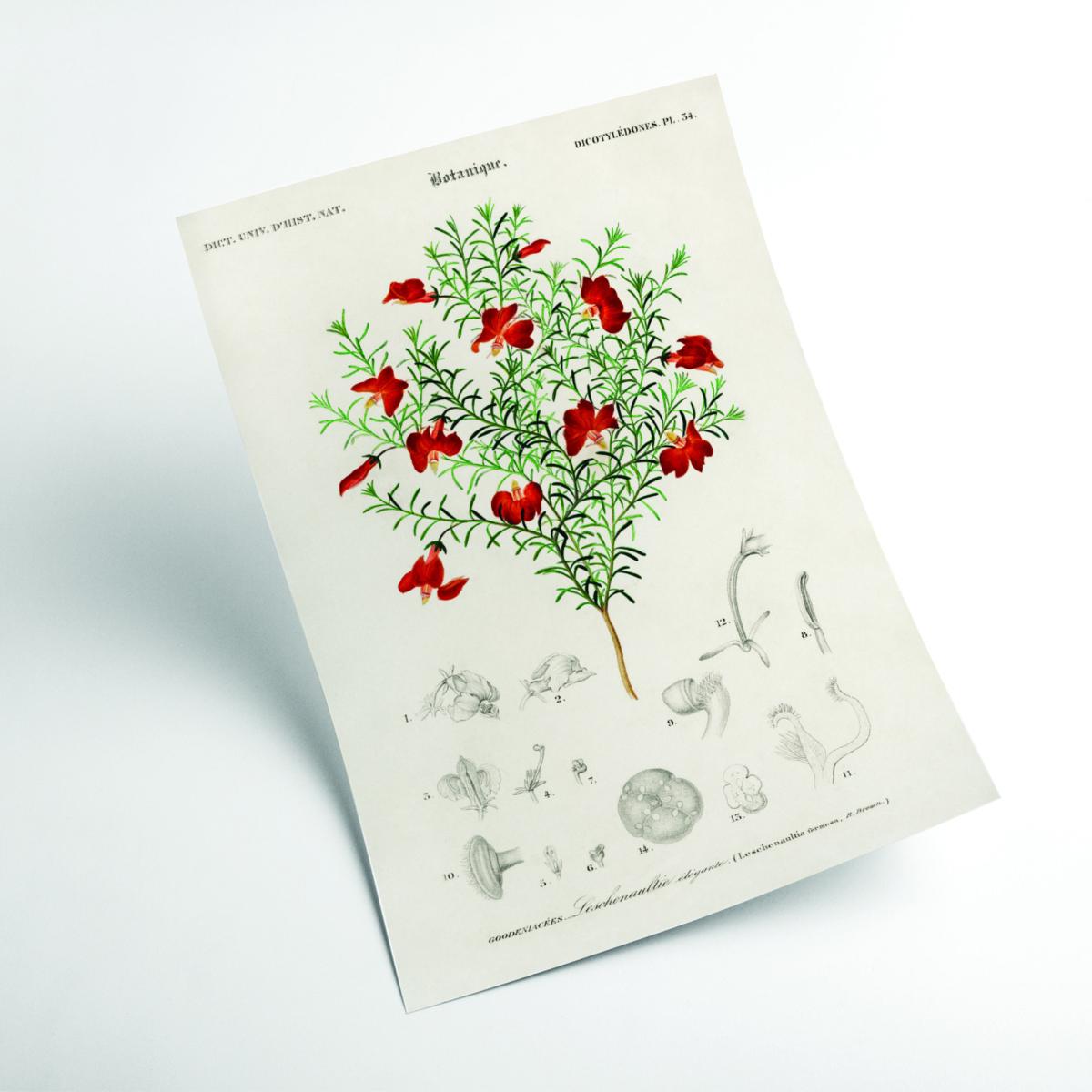 I love this green and red Leschenaultia print for its bold botanical charm and vintage appeal. It works really well in both contemporary and traditional interiors, especially when paired with neutral tones to let the colours pop or in eclectic schemes that embrace colour. Practical styling tips include framing it with a clean, simple border to enhance its natural detail, and grouping it with other nature-inspired artworks or botanical objects for a curated look. It’s especially effective as a focal point over a sideboard or in a prominent wall gallery, bringing a fresh, botanical touch to the space without overwhelming it.