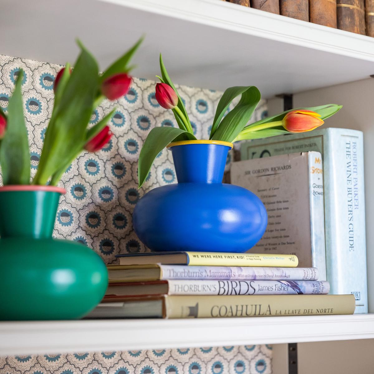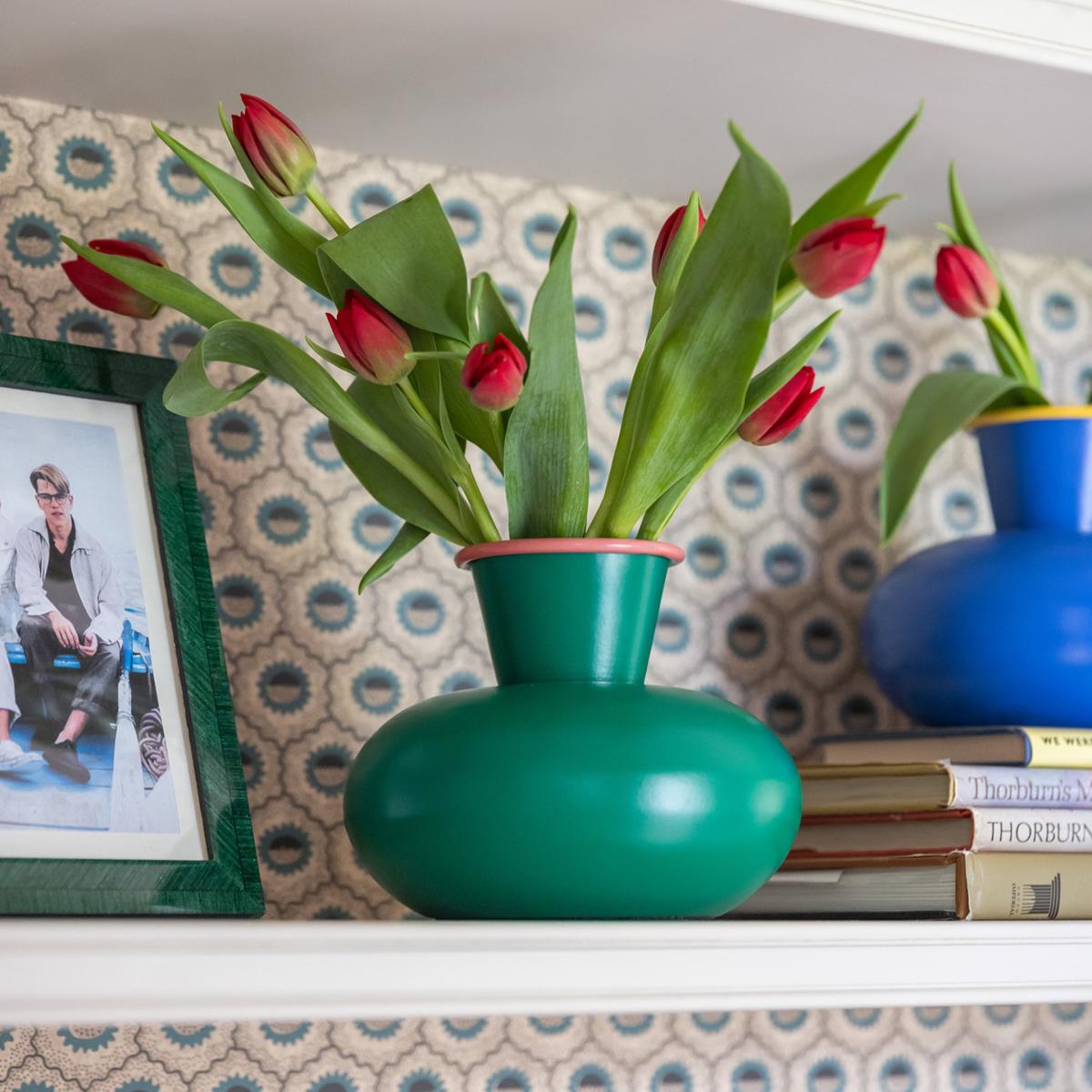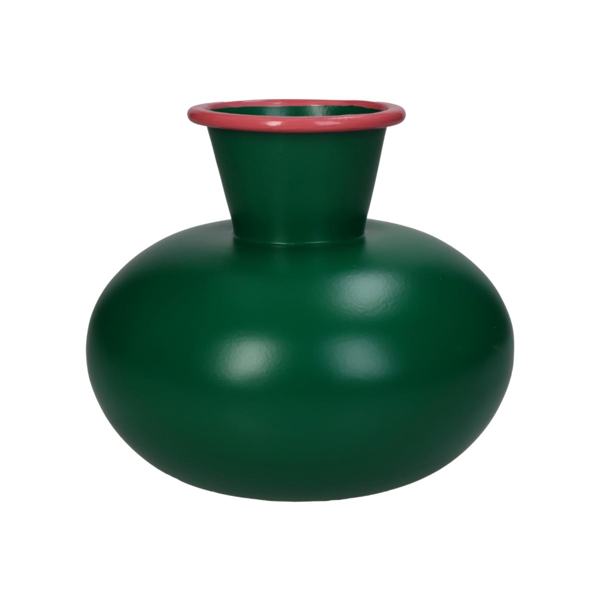 An iron vase with a chic aesthetic and striking color contrast could be a captivating addition to any space. Picture a sleek, minimalist design crafted from iron, perhaps with clean lines and a polished finish to give it a modern edge. The color palette is a bold combination of emerald green juxtaposed with a vibrant metallic red hue. This unexpected pairing adds visual interest and elevates the industrial feel of the iron material, transforming it into a sophisticated decor piece. Whether displayed on its own as a statement object or filled with fresh blooms to accentuate its beauty, this vase is sure to draw attention and spark conversation in any room.