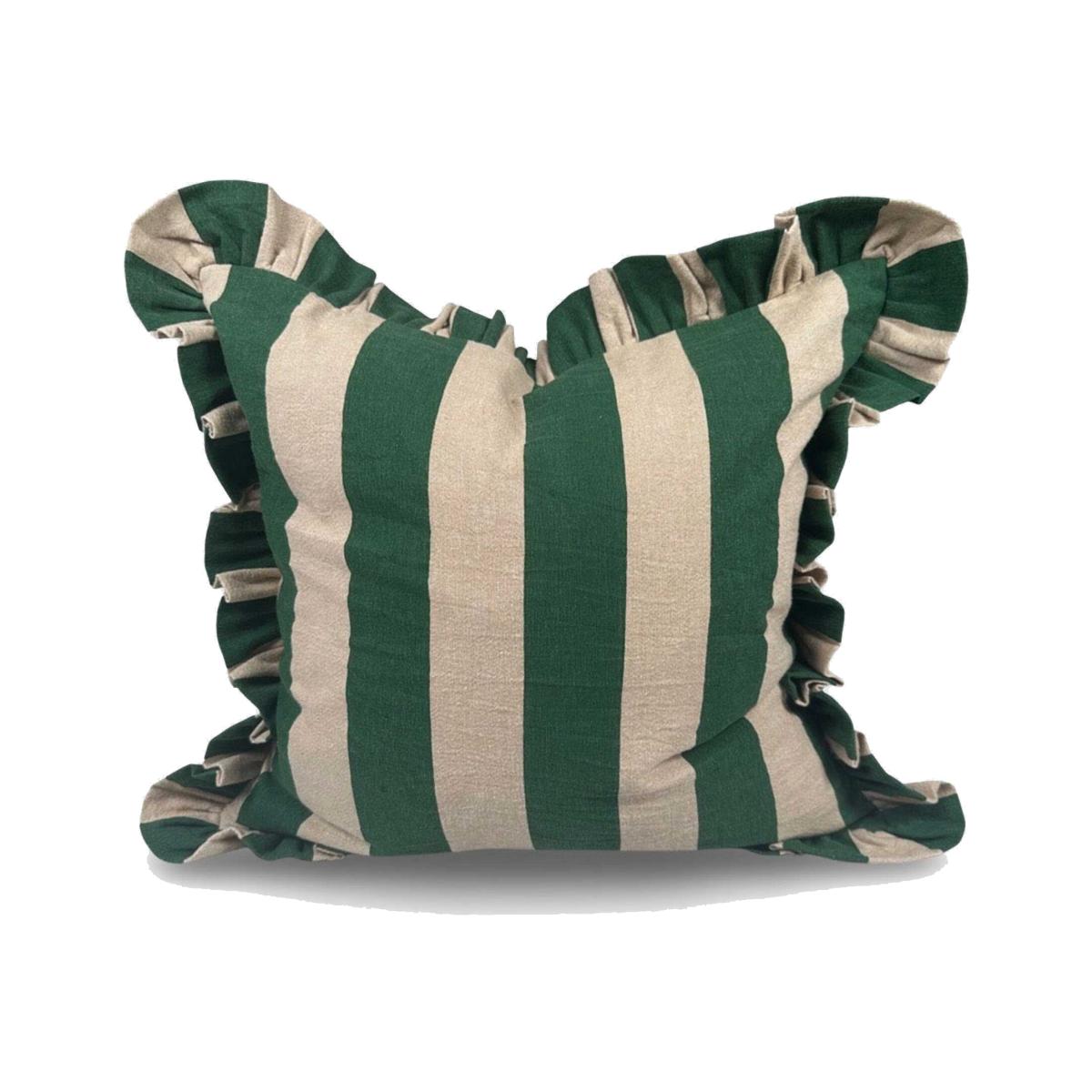 Add a touch of elegance and charm with the Green Striped Frill Cushion. Featuring classic green stripes and a delicate ruffled edge, this decorative pillow brings a soft, stylish accent to sofas, chairs, or beds.