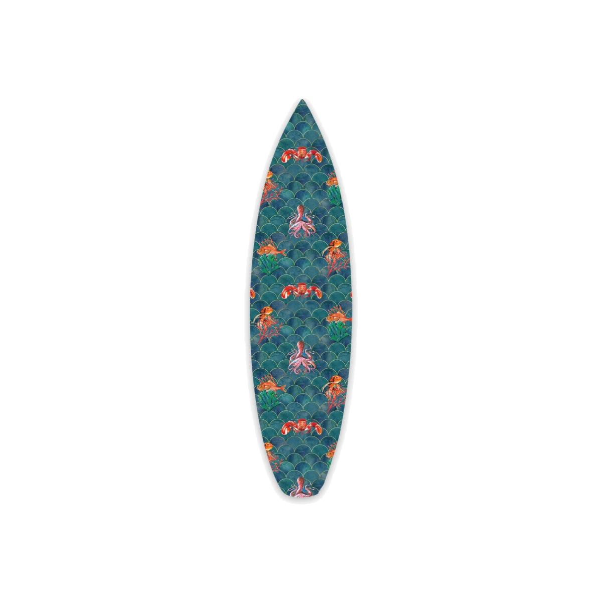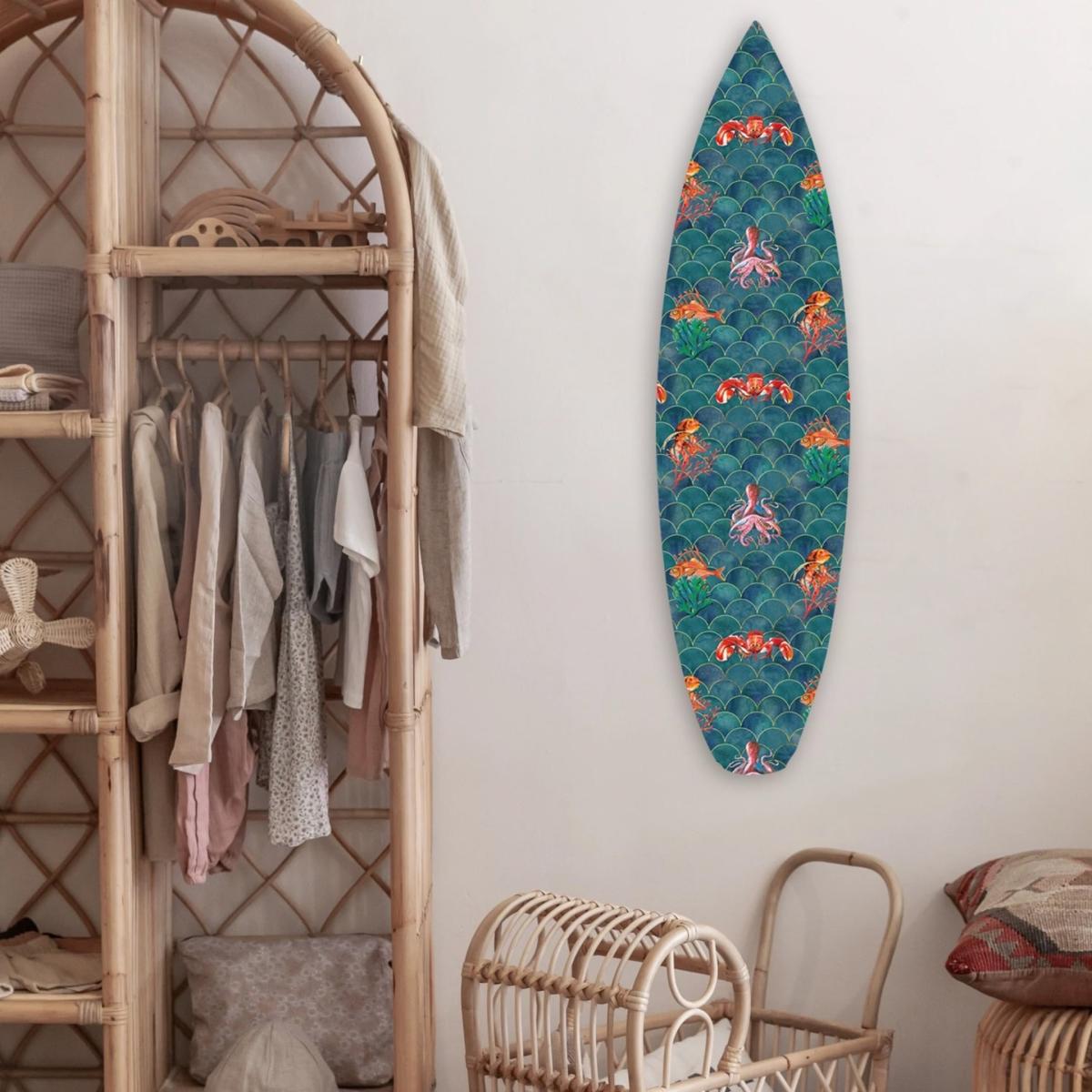 This decorative surfboard with beautiful lobsters, octopus, fish and seaweed has a chic and playful look. This surfboard will spice up any wall in your home. The wall decor surfboards are handmade of sustainable poplar wood in our creative manufacturing studio in The Hague, Netherlands. After the wall surfboard is ready, it will be provided with an original hand-painted art print from artist Femke Zwaan. Each artfully decorated design is first hand-painted by owner and designer Femke Zwaan and then meticulously translated into an art print to preserve the unique look of hand painting and fresh brush strokes. Catchii Homeware products enliven rooms and brighten up every interior.