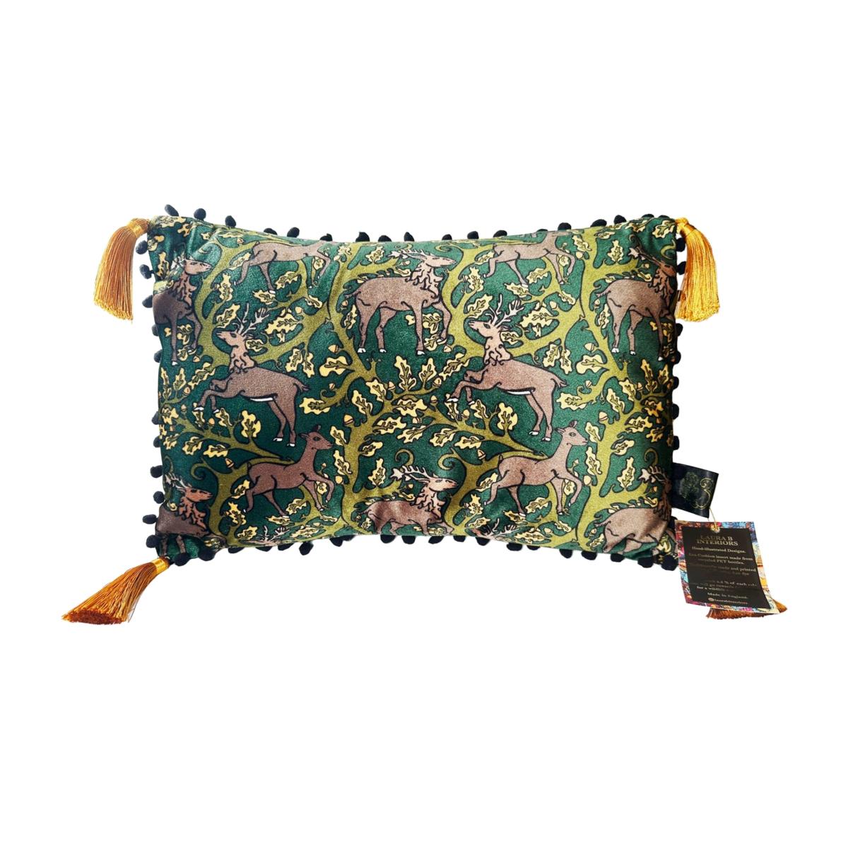 I love the green jewel tone of this cushion; it adds a rich, opulent touch that can elevate both traditional and eclectic interiors. The wild deer motif brings a touch of nature-inspired charm, making it versatile for country cottages, boho spaces, or even luxe urban settings. Practical styling tips include pairing it with neutral-toned throws or other pattern-rich textiles to create visual interest without overwhelming the space. It works particularly well on sofas or armchairs in living rooms seeking a pop of colour and personality, or as a statement piece on a bed in a bespoke bedroom scheme. The tassels also lend a playful, textured element that enhances its decorative appeal.