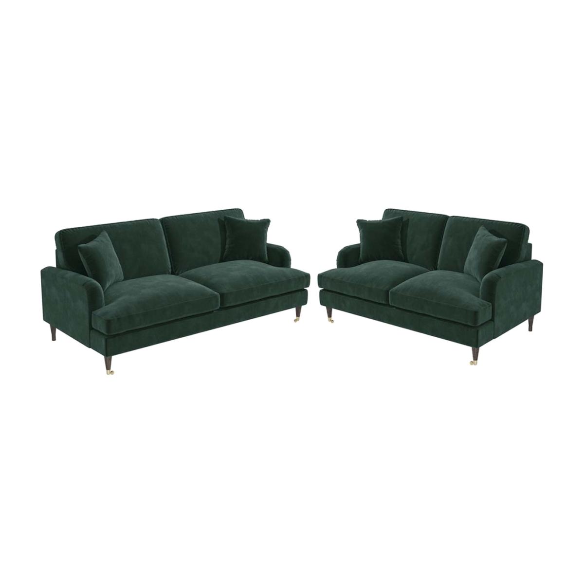 One 3-seater and one 2-seater sofa included Modern green velvet sofas with dark wood legs Removable cushion covers make them easy to clean Stylish gold castors will suit any living room or snug Find the matching pieces, just search Payton Need to know 3-Seater Sofa Information Colour:Green Finish:Velvet upholstery and wooden legs Material:Opulence velvet (100% polyester), wooden frame and legs and metal castors Filling:Foam Assembly required:Yes 2-Seater Sofa Information Colour:Green Finish:Velvet upholstery and wooden legs Material:Opulence velvet (100% polyester), wooden frame and legs and metal castors Filling:Foam Assembly required:Yes