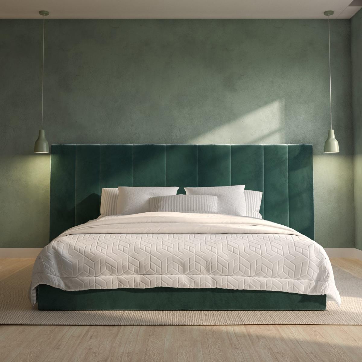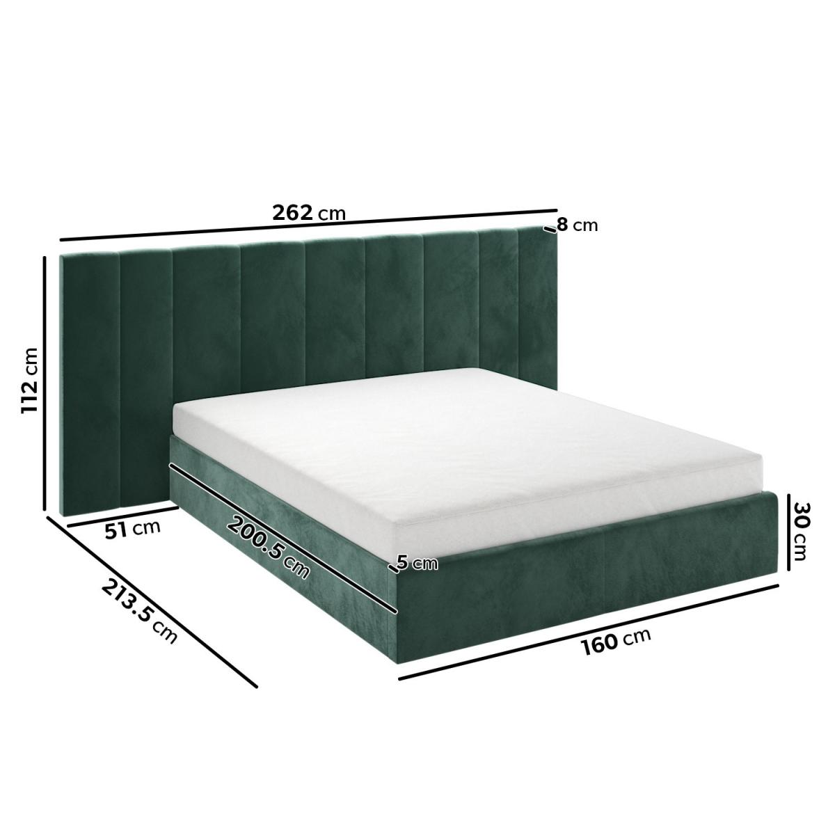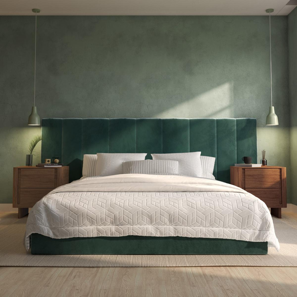 All about me Upgrade your master bedroom with this luxurious Iman bed frame. Enhanced by the long and wide feature headboard and plush padding, it'll instantly elevate any interior. With easy-access storage and a fabric base to protect items from dust, it's functional as well as stylish and comfortable. With a sturdy wood frame construction, it's built to last. Plus, it's sprung-slatted for ultimate comfort and fits a UK standard king-size mattress. Save 10% off your perfect mattress when bought with this bed Need to know Product dimensions: W260 x D214.5 x H112 cm Product weight: 52.1kg Bed mattress size: Standard UK King (150 x 200cm / 5ft) Colour:Dark green Finish: Upholstered Material: Wood, solid wood combination, metal, foam, fabric/Velcro base and velvet Bed base: Sprung-slatted Assembly required: Yes Mattress included: No Packaging dimensions: Box 1: W114 x D161.5 x H13 cm / Box 2: W26 x D203.5 x H15.5 cm Packaging weights: Box 1: 33.6kg / Box 2: 22.5kg