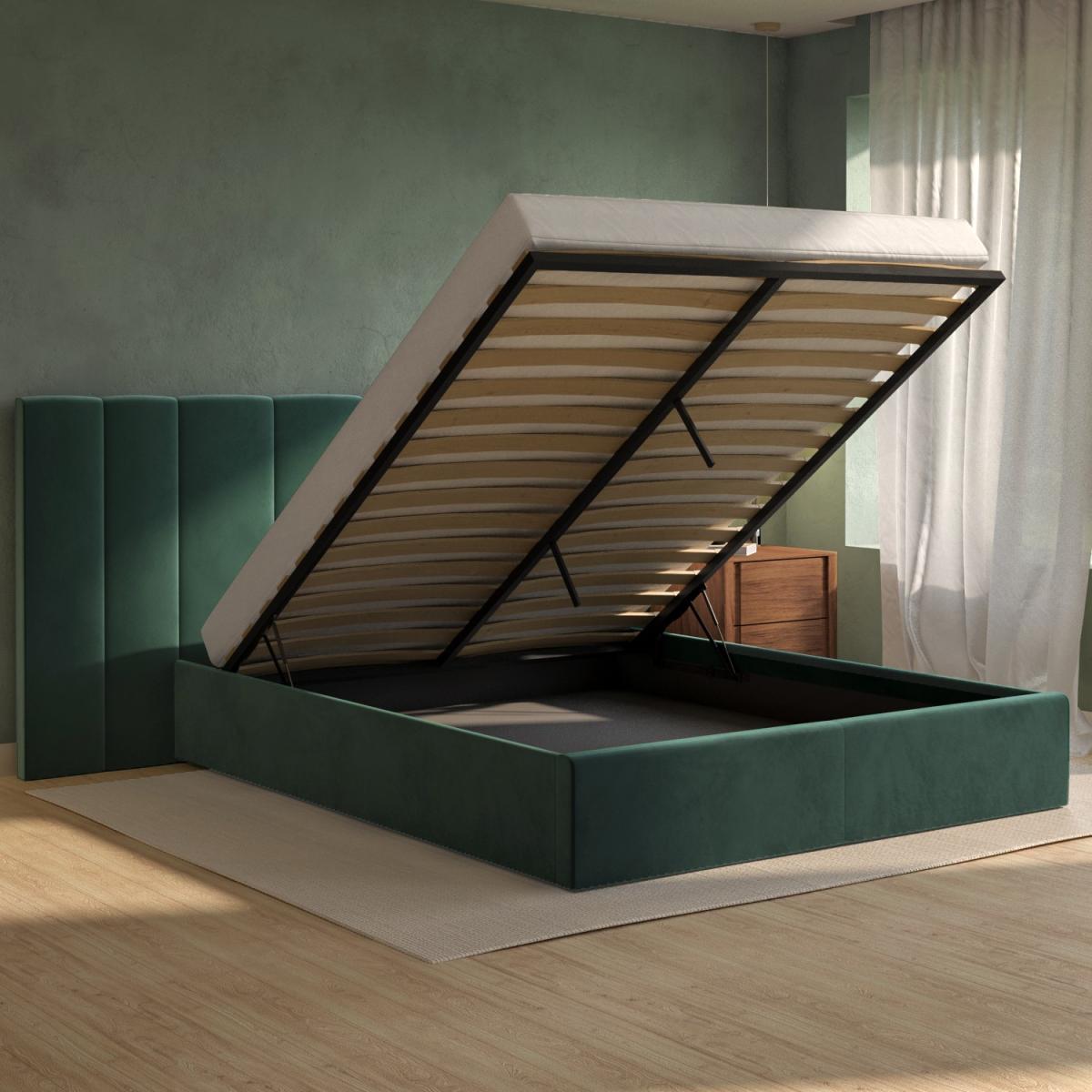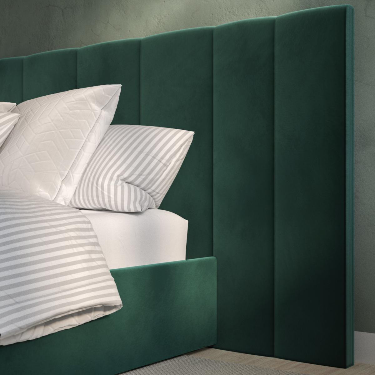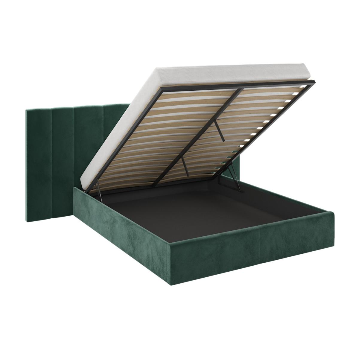 All about me Upgrade your master bedroom with this luxurious Iman bed frame. Enhanced by the long and wide feature headboard and plush padding, it'll instantly elevate any interior. With easy-access storage and a fabric base to protect items from dust, it's functional as well as stylish and comfortable. With a sturdy wood frame construction, it's built to last. Plus, it's sprung-slatted for ultimate comfort and fits a UK standard king-size mattress. Save 10% off your perfect mattress when bought with this bed Need to know Product dimensions: W260 x D214.5 x H112 cm Product weight: 52.1kg Bed mattress size: Standard UK King (150 x 200cm / 5ft) Colour:Dark green Finish: Upholstered Material: Wood, solid wood combination, metal, foam, fabric/Velcro base and velvet Bed base: Sprung-slatted Assembly required: Yes Mattress included: No Packaging dimensions: Box 1: W114 x D161.5 x H13 cm / Box 2: W26 x D203.5 x H15.5 cm Packaging weights: Box 1: 33.6kg / Box 2: 22.5kg