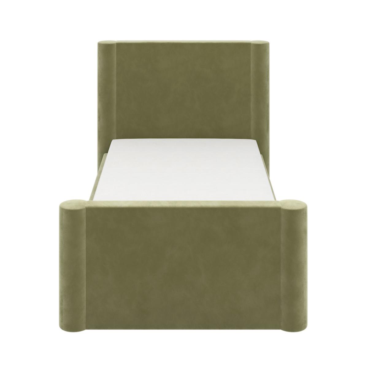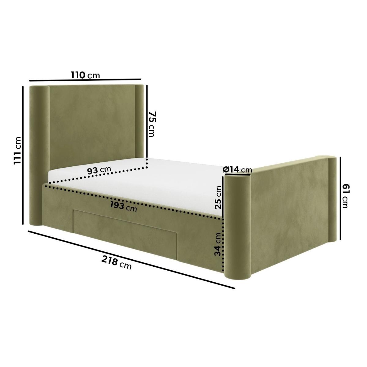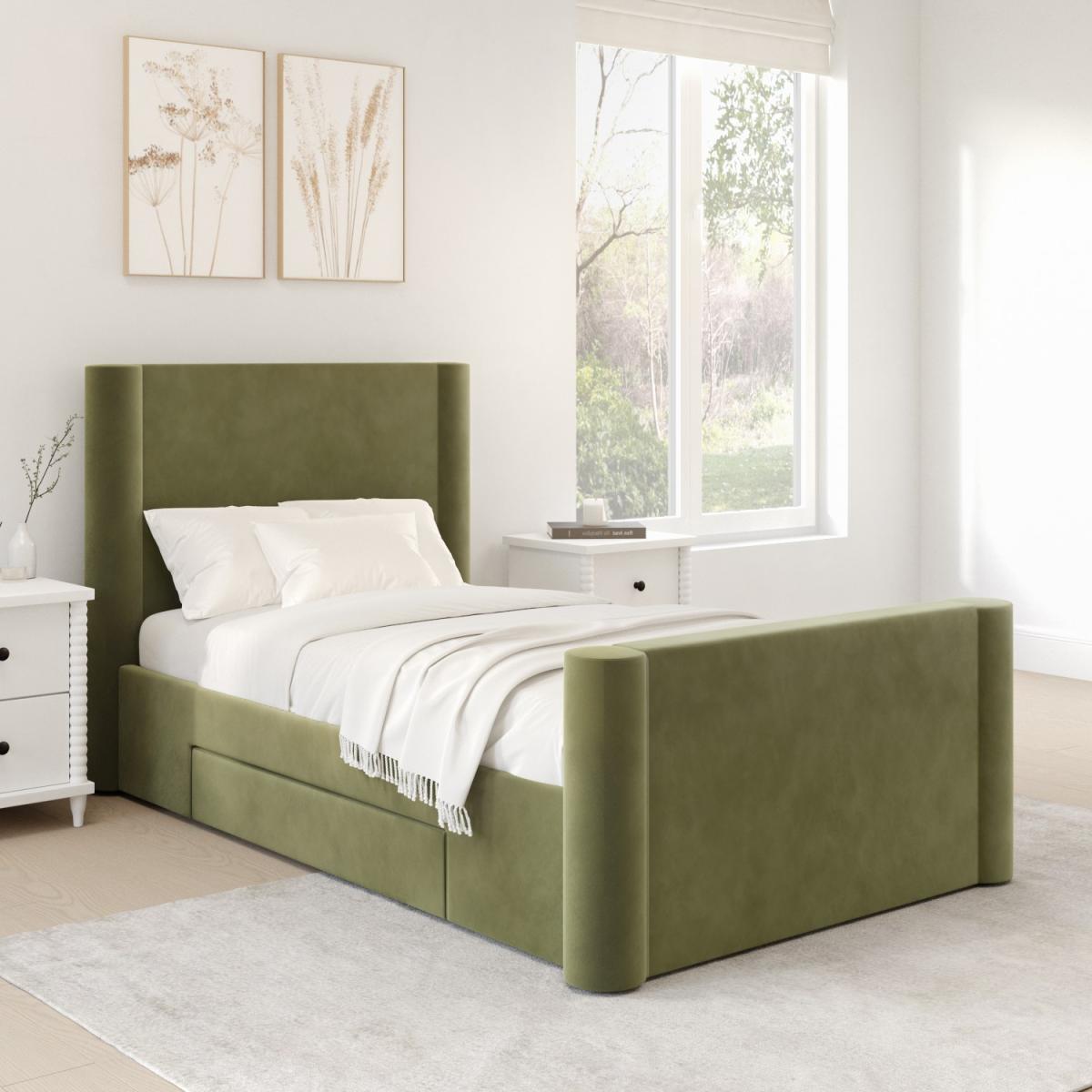 All about me Make an impression with this elegant single bed. Its timeless design, from the rounded corners to its soft padded velvet finish, gives it a luxurious feel. It features a large drawer, ideal for keeping folded items, bed linen and more. Also, the bed can be assembled so the drawer can be placed on either side, to suit your bedroom layout. With a sturdy hardwood frame and robust wooden slats for assured mattress support, this bed is built to last. It fits a UK single mattress, which isn't included, so you're free to choose a mattress of your choice which isn't included, so you're free to choose a mattress of your choice. Need to know Product dimensions (as single bed):W110 x D218 x H111 cm Inner drawer dimensions:W102 x D48 x H12 cm Product weight: 60kg Bed mattress size: Standard UK Single (3ft / 90 x 190cm) Colour:Green Finish: Upholstered Material: Velvet Bed base:Wooden sprung-slatted Assembly required: Yes Mattress included: No Packaging dimensions: Box 1: W113 x D113 x H15.5 cm / Box 2: W63 x D113 x H15.5 cm / Box 3: W36 x D196 x H12 cm Packaging weights: Box 1: 29kg / Box 2: 9.5kg / Box 3: 15kg