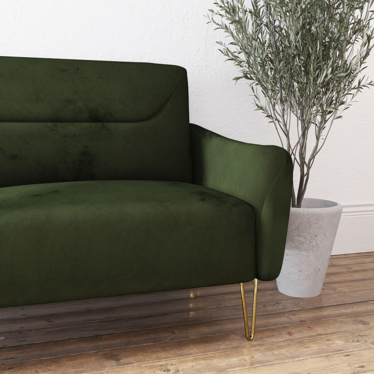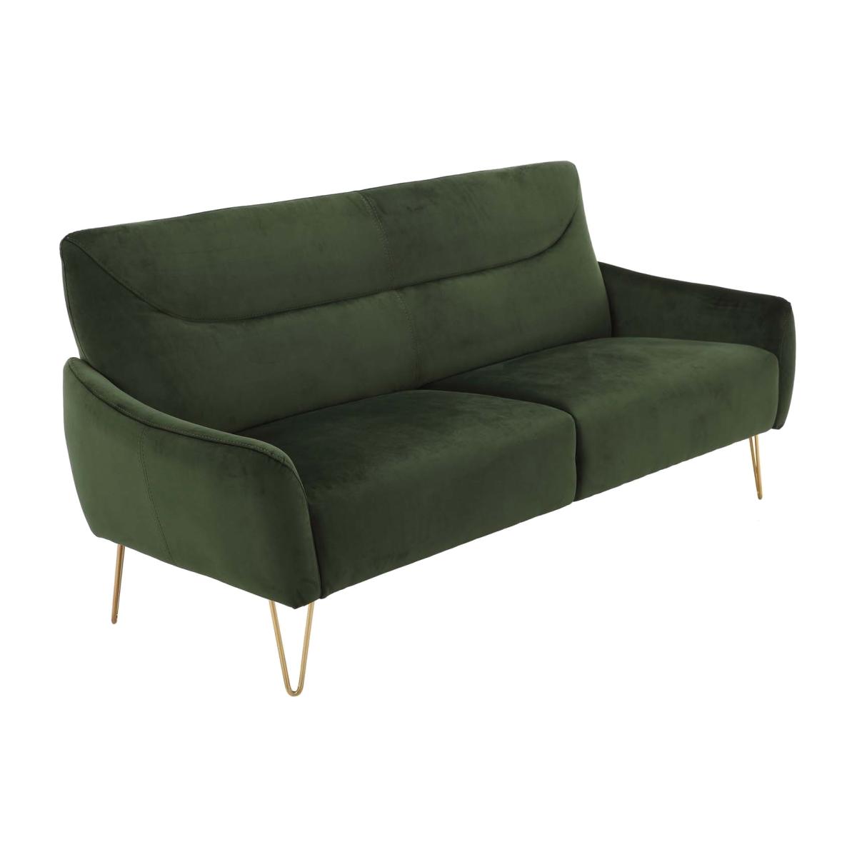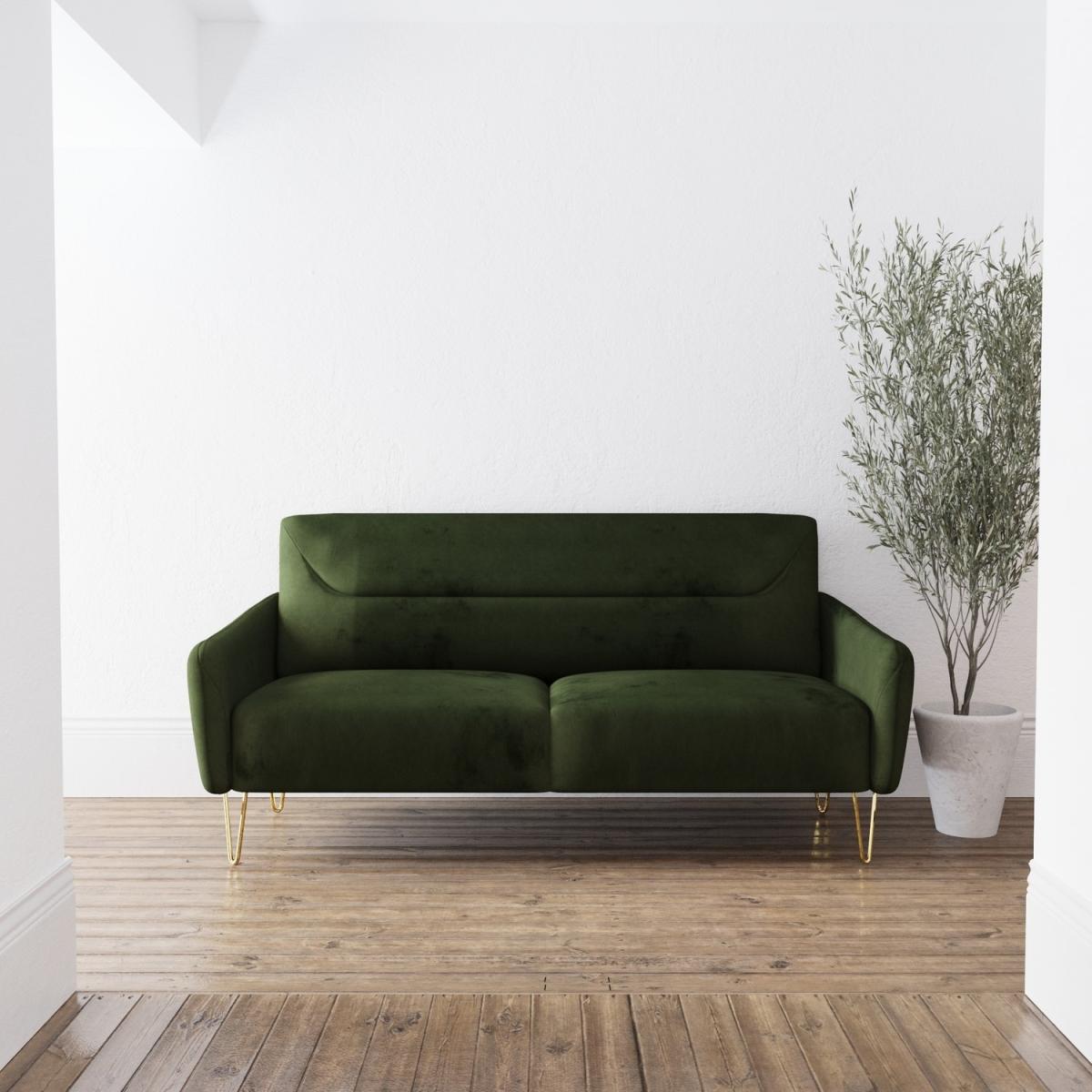 Features we love Comfy 2-seater sofa upholstered in rich green velvet. Mid-century design fits any modern living room. Enjoy foam-filled cushions for comfort and support. Gold hairpin legs add a contrasting stylish element. Matching armchair also available. All about me. Upgrade your living space with this luxurious green velvet 2-seater sofa. This stylish sofa is filled with soft spongey foam and comes with four gold hairpin legs to attach. With comfortable deep seating and the added touch of detailed stitching this versatile piece will look fab in any home setting. Need to know. Dimensions. H80 x W177 x D71 cm Product weight. 31kg Colour. Green Chair finish. Velvet Leg finish. Brushed chrome Material. Fabric foam and metal Assembly required. Yes just attach the legs