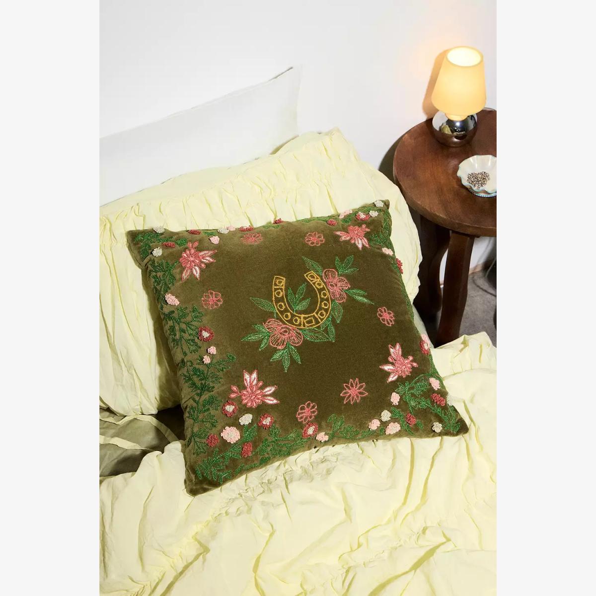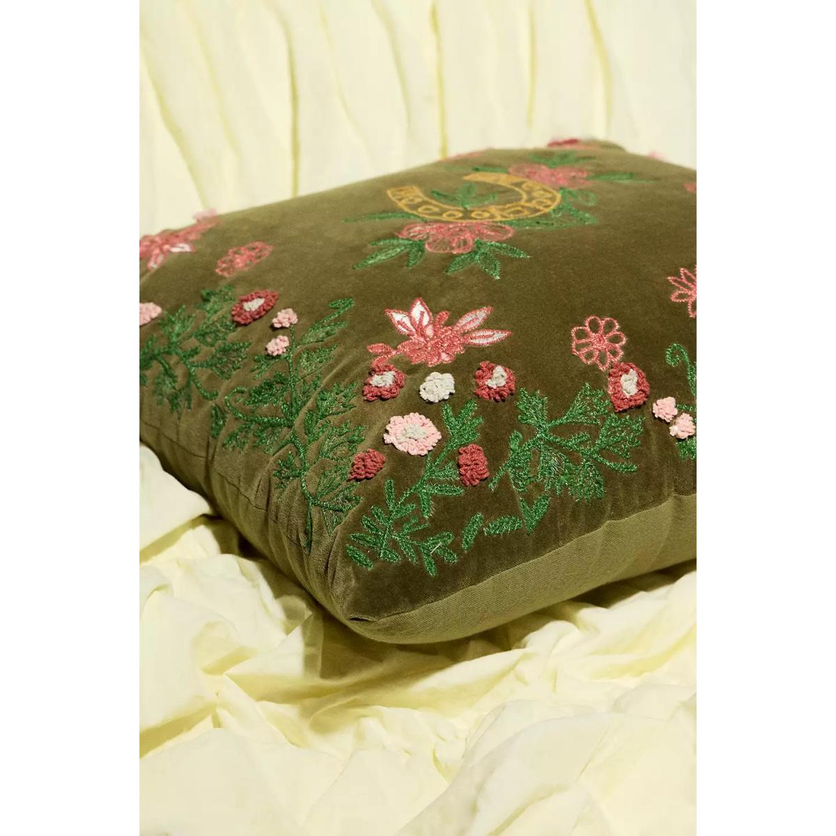 Pretty green cushion decorated with an embroidered floral pattern and horseshoe motif to centre. Square shape with a soft filling. **Content + Care** \- 100% Cotton with a polyester filling \- Spot clean