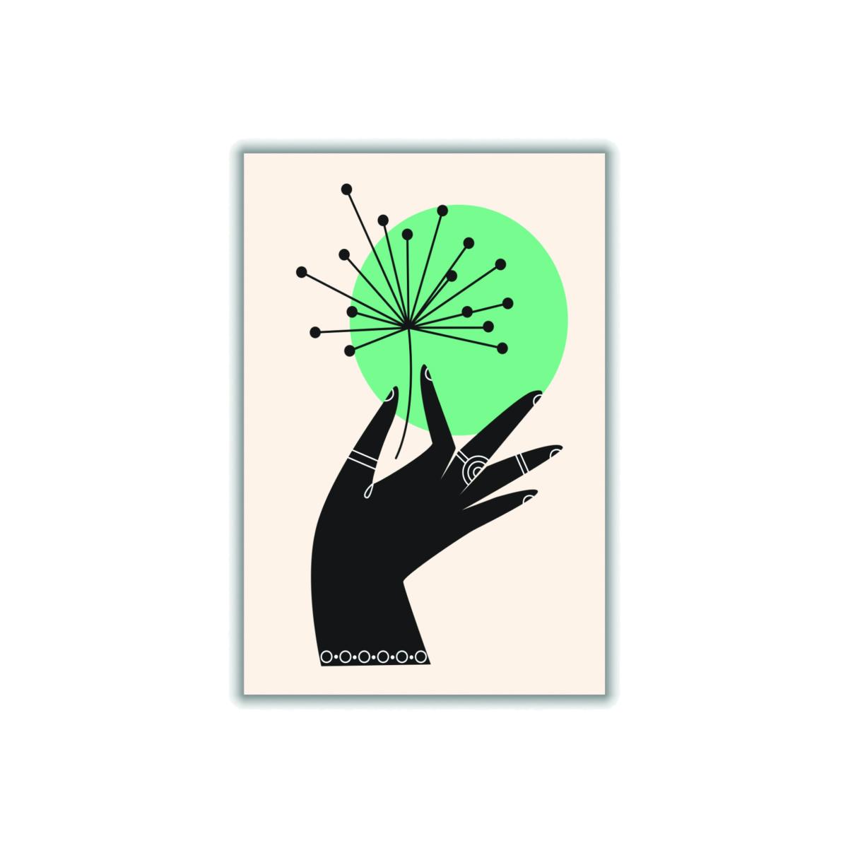 I really like this print - it’s a fresh, modern take on botanical artwork with a hint of graphic minimalism. The bold black hand contrasts beautifully against the lively green flower and the soft background, making it a striking focal point. It works particularly well in contemporary or eclectic interiors, where clean lines and playful touches create visual interest. For styling, consider framing it with a simple bezel to keep the focus sharp, and pair with lush green plants or geometric accessories to enhance the graphic vibe. It’s versatile enough for a living room or bedroom, and its size makes it ideal for a feature wall or an art nook. Practical tip: hang it at eye level for maximum impact and keep surrounding decor minimal to let the piece really stand out.