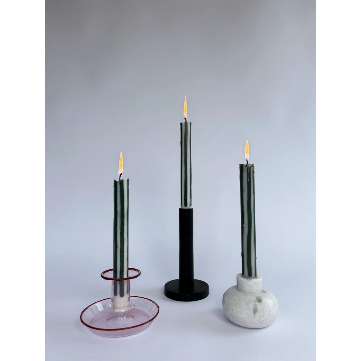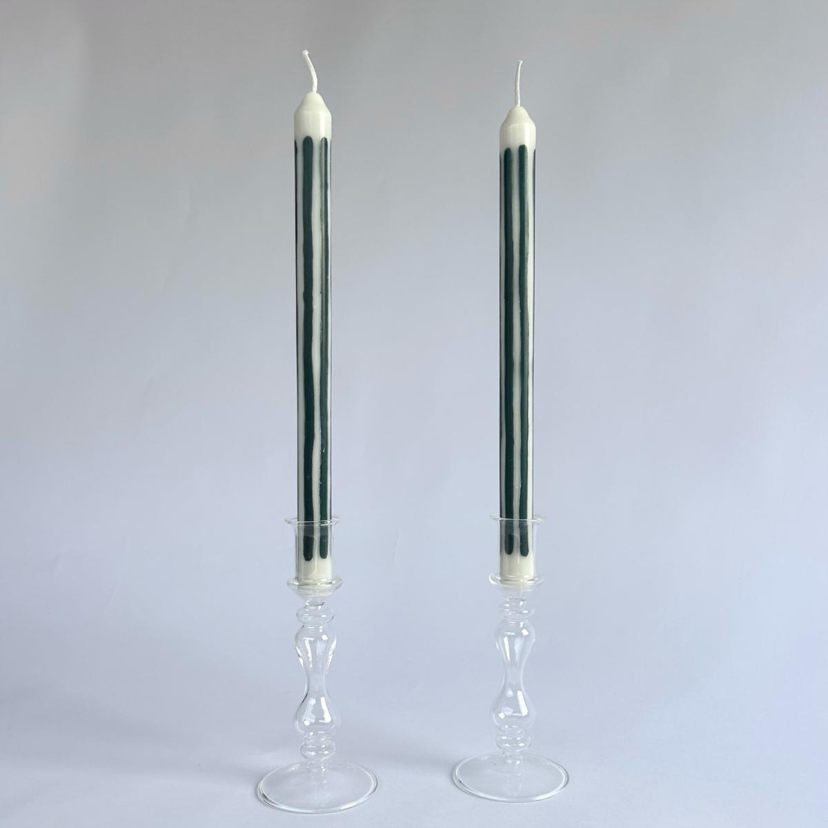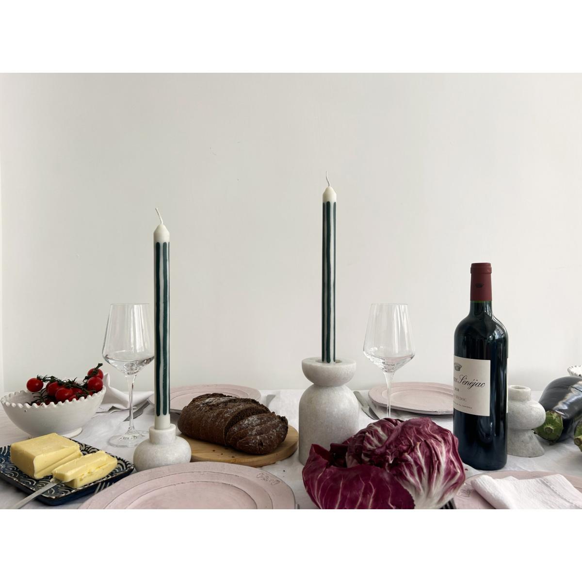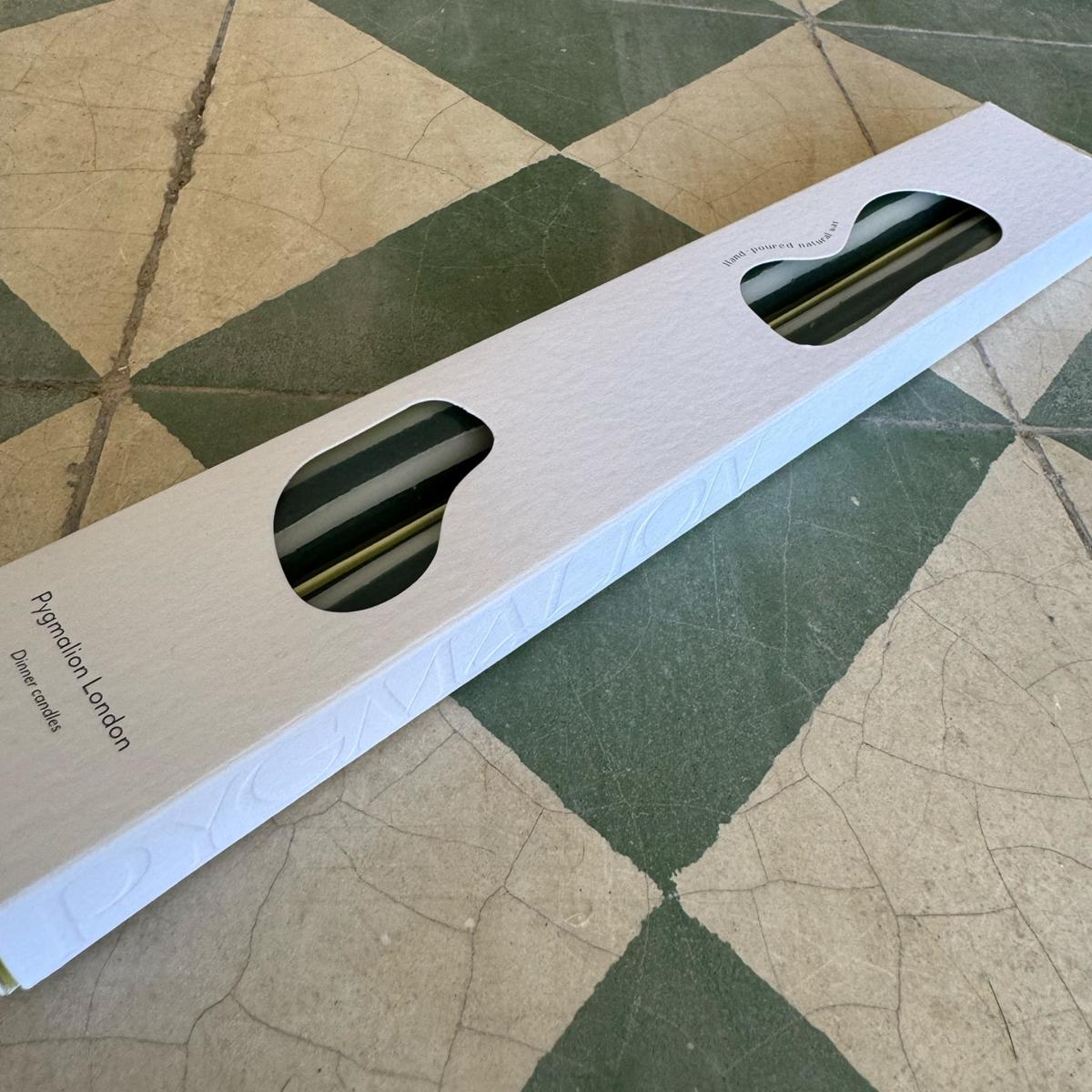 If art and ambience had a baby. Dinner candles like you've never seen before - hand-poured using 100% natural wax, natural dyes and pure cotton wicks. Pygmalions are designed for the joy of hosting: good food, great company and memorable ambience. The packaging was dreamed up using this same ethos - bringing luxury, design, sustainability and fun together to create the perfect gift. The candles are 29cm allowing for a leisurely 10+ hour burn time. Babington candles are hand-poured into loose stripes of racing green and off-white wax and come packaged as a pair.