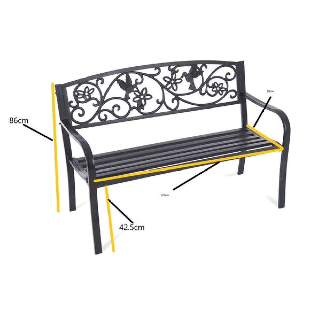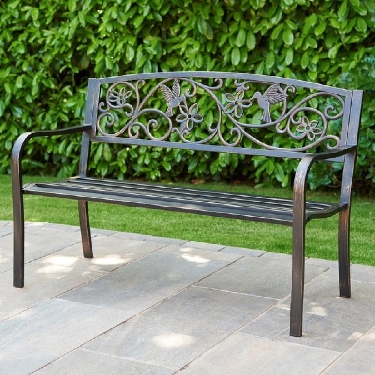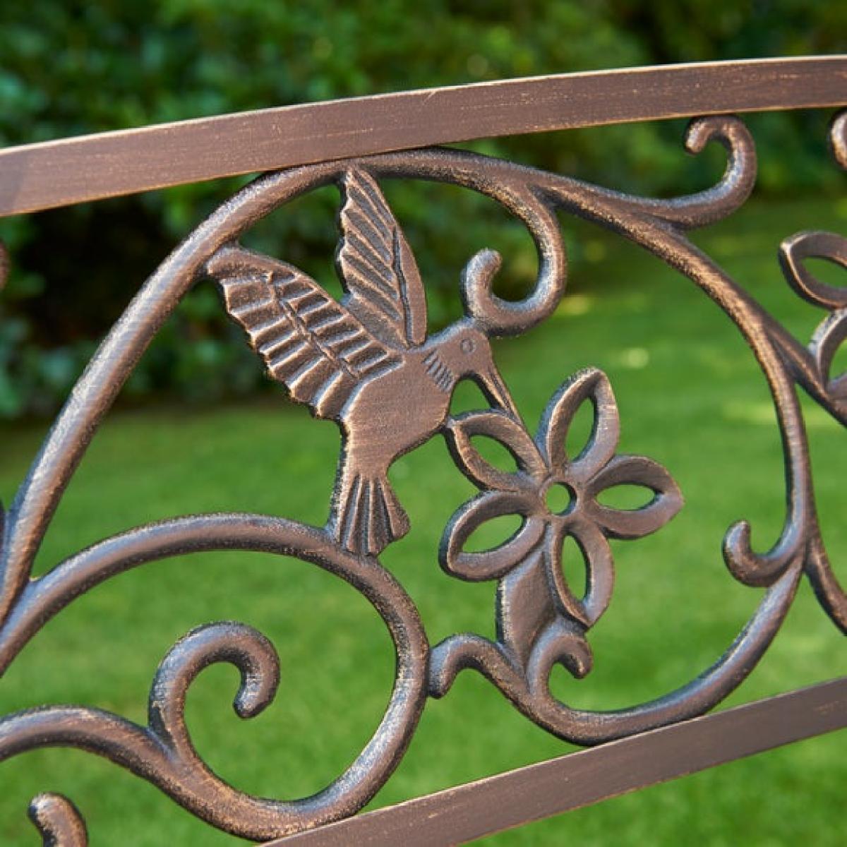 * Metal bench * Classic bronze finish * Weather-resistant Designed to add charm and character to any outdoor space, the hummingbird garden bench is a beautiful and practical addition to your garden. Constructed from sturdy galvanised steel tubing, this two-seater bench offers durability and strength, ensuring it withstands outdoor conditions with ease. The backrest is crafted from cast iron, featuring a stunning design of hummingbirds, vines, and flowers that bring an elegant decorative touch. Finished in an antique bronze coating, it complements both traditional and contemporary garden settings.