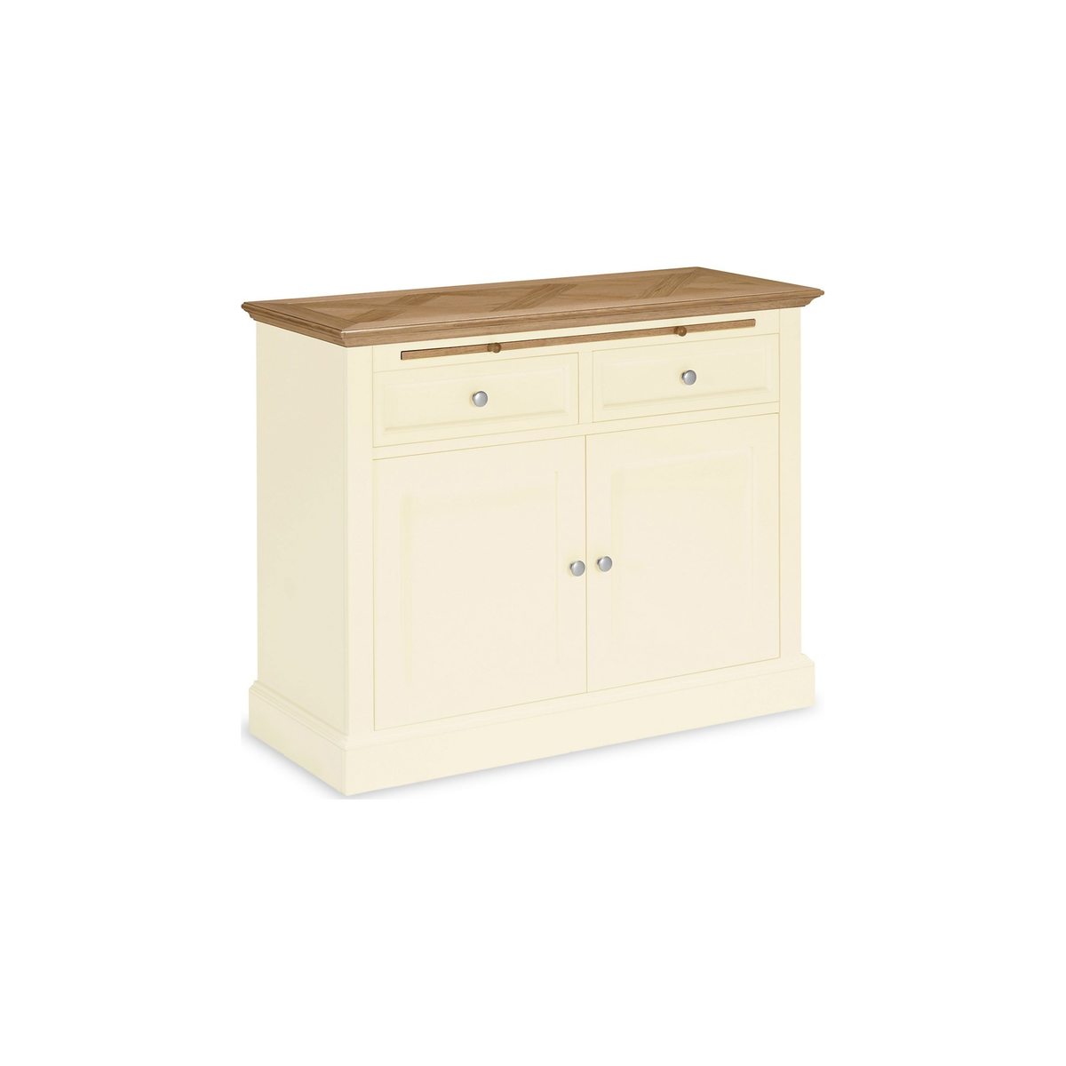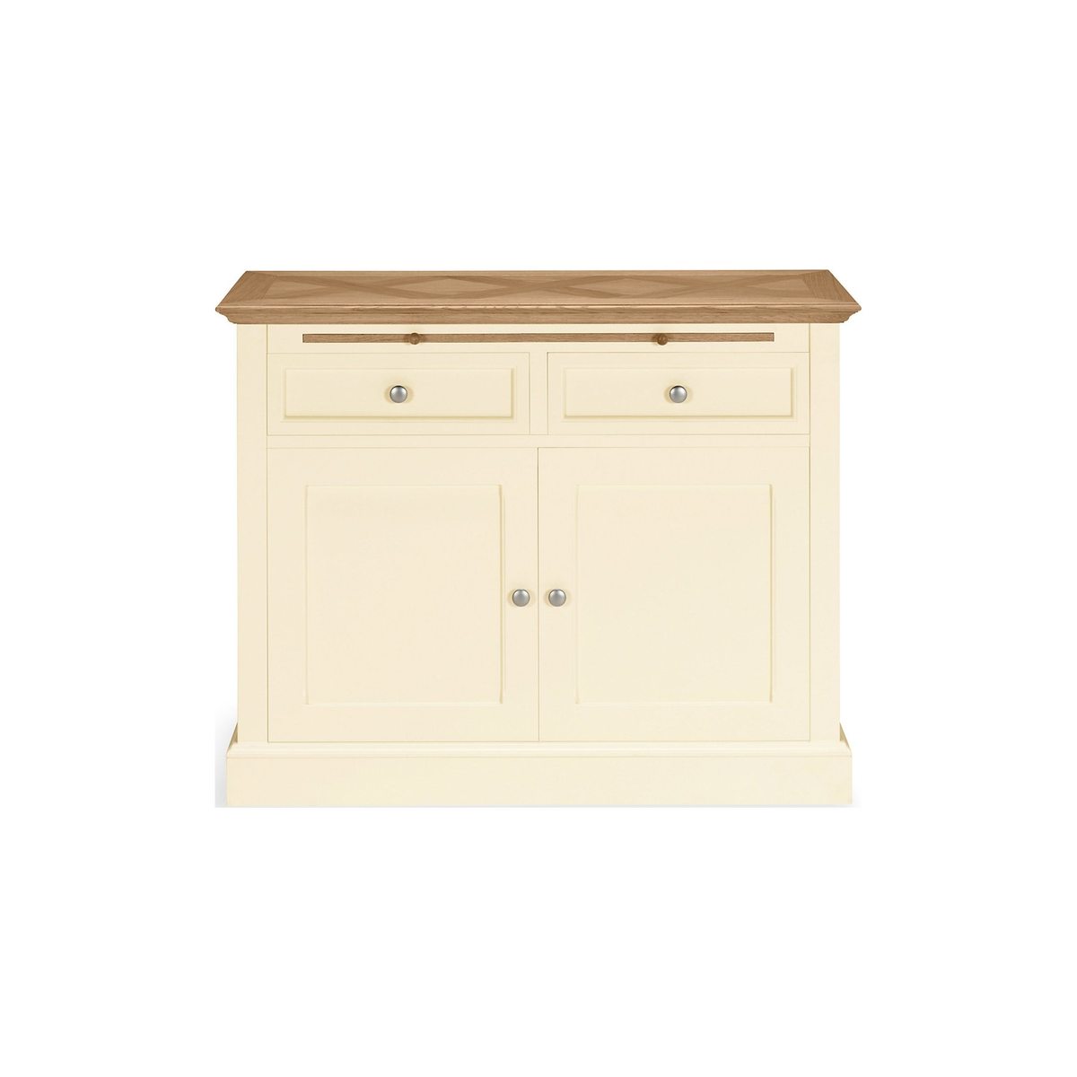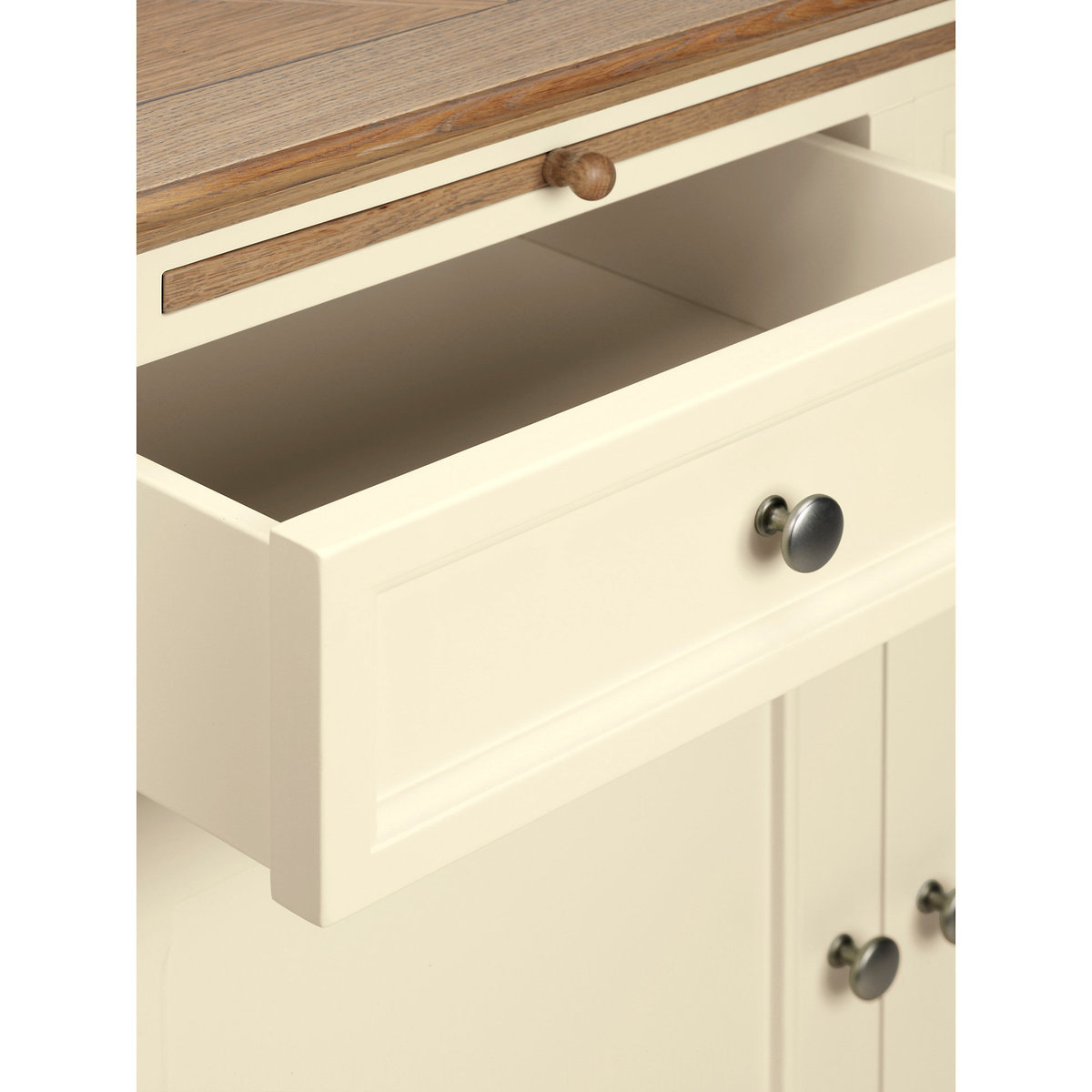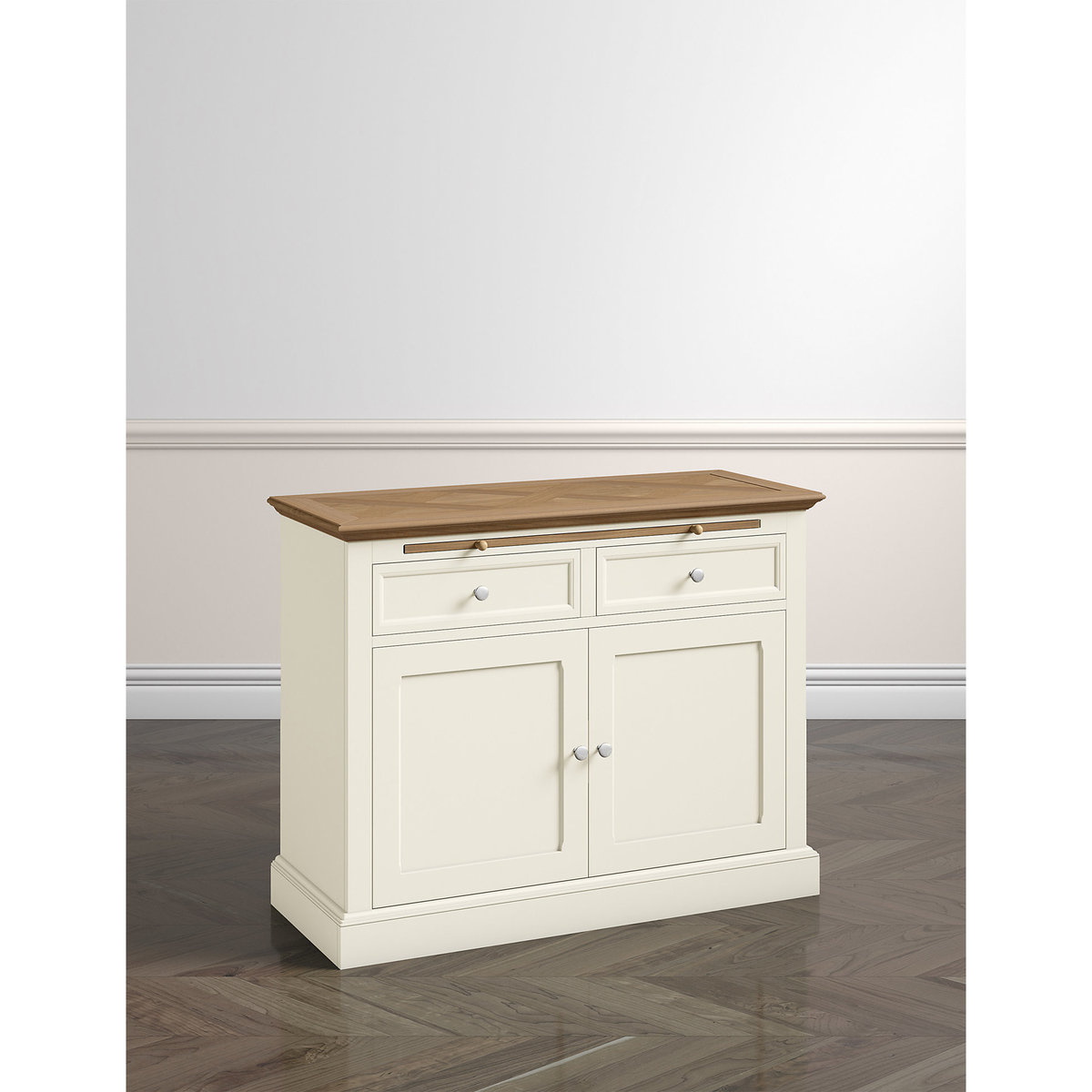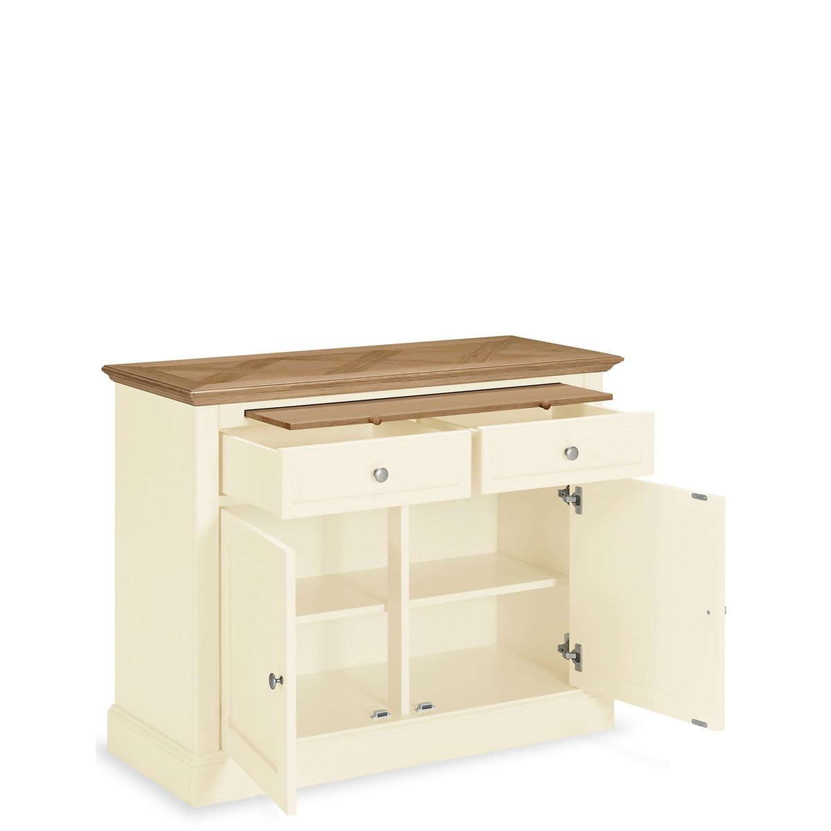 A tasteful addition to any dining room, our Greenwich two-door sideboard features two shelves and two drawers for handy storage, while the extra pull-out shelf is the perfect way to create stylish multi-tiered displays. Enjoy a vintage-style addition to any space with this sideboard made from sustainable wood, finished with a stunning oak marquetry surface and a light patina finish. Designed to last for many seasons to come, an oak sheen lacquer ensures durability.