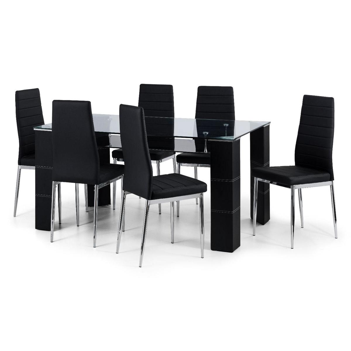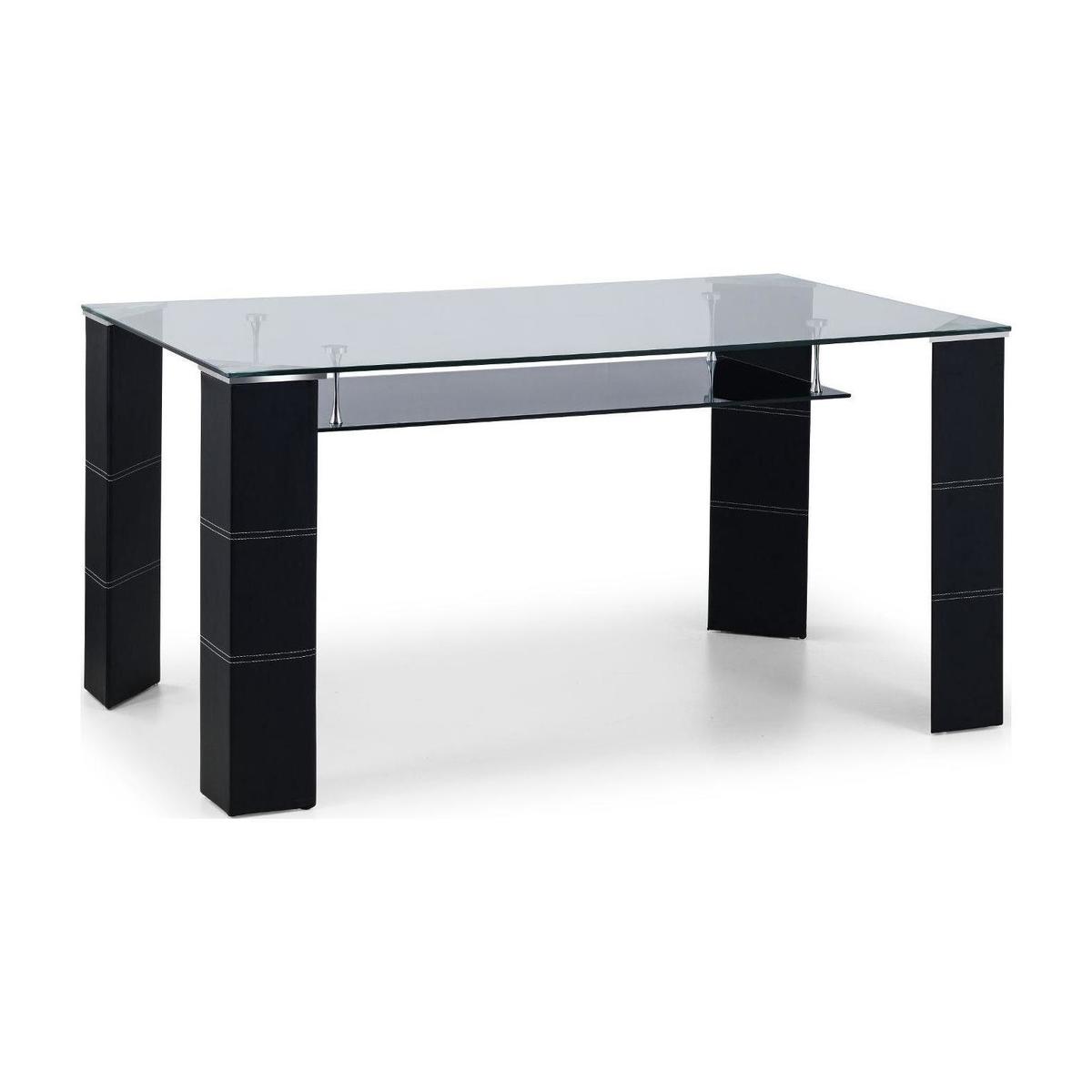 The sleek Greenwich Glass Dining table features a clear glass tabletop with black faux leather legs and useful black glass under shelf. The Greenwich Dining Table will comfortably seat six people and proves to be sturdy thanks to its 10mm thick tempered glass top. Please note, unfortunately we cannot deliver this item to the Channel Islands.